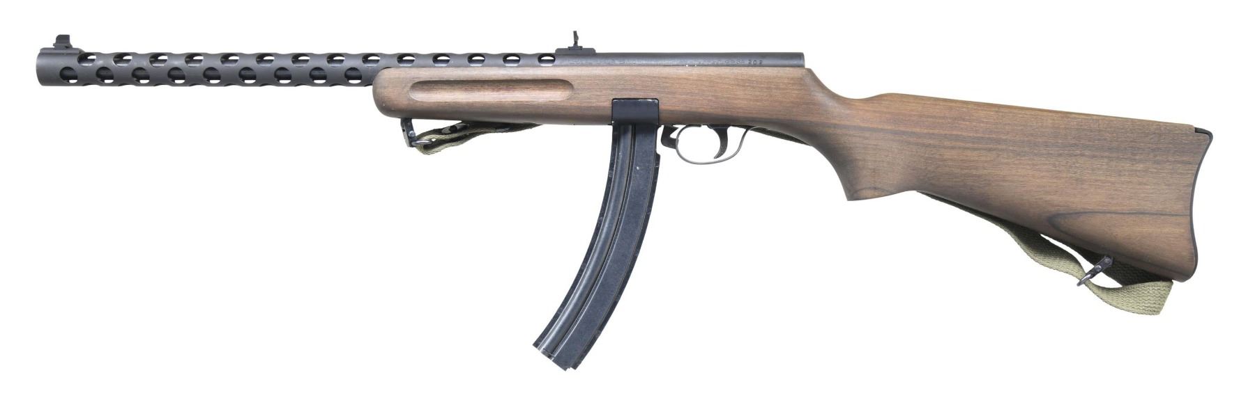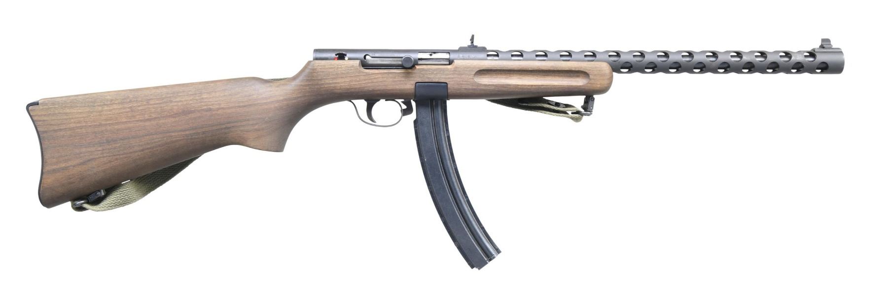 Cal. 22 LR. S# SA202. Mfg. by F.lli Pietta of Italy having "AI" 1982 proofs; styled after the Soviet PPSh SMG. Bbl. 16 1/8". Extended receiver acts as barrel shroud w/ blade front sight & flip up rear sight. Blowback action. Finger groove beechwood stock w/ green web sling. MAGS: 3 - 30 rd. mags. CONDITION: very good overall appearance with handling marks. Very good bore. (25-2280/MD). MODERN. $300-400.