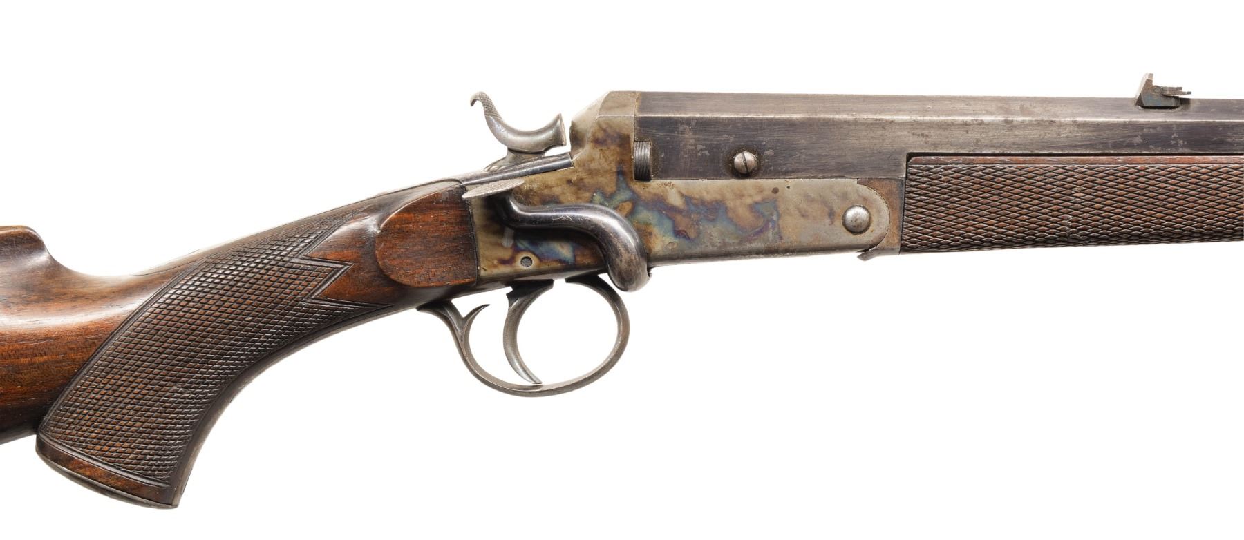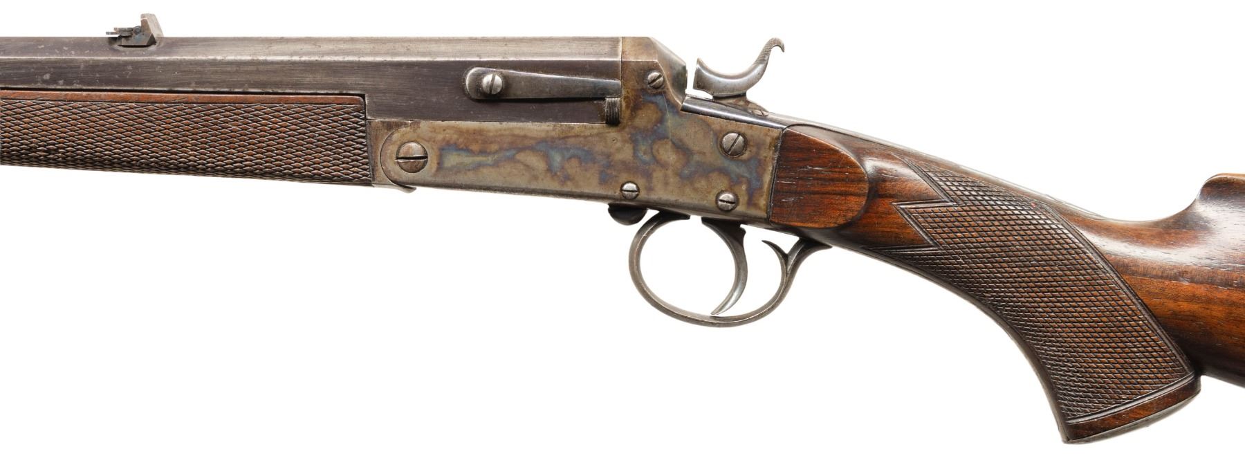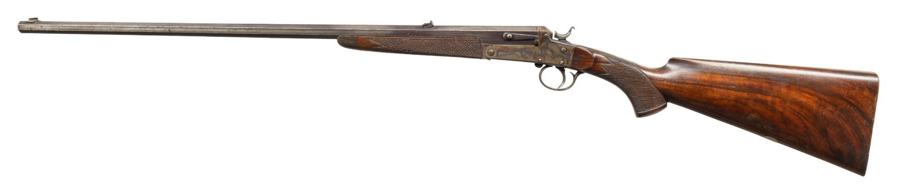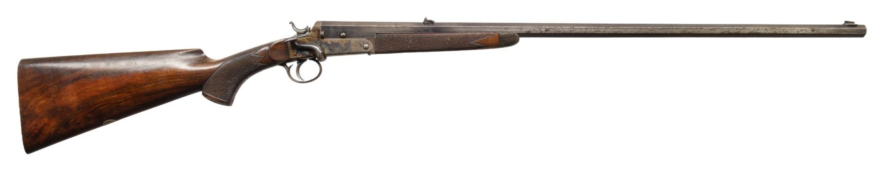 ROOK RIFLE. Cal. 300 Rook. S# 2. Oct. 26" bbl. Top flat is matted with blade front sight, 3 leaf rear sight & space for retailer's mark. Water table has Knight's head maker's mark, "86" & Birmingham Black Powder proofs. Side-lever external hammer single shot action. Walnut stock set: checkered forearm with horn tip, capped pistol grip with grooved butt & oval German silver toeline name plate. CONDITION: barrel has traces of blue mixed with gray/brown patina showing marks & oxidation. Receiver has good case colors & blue with scratches, peppery oxidation & carry wear. Good wood finish with numerous light dings & scratches. Good shallow rifling w/ light wear & pitting. PROVENANCE: Estate of Groves Herrick. (25-5722/MD). CURIO. $400-600.