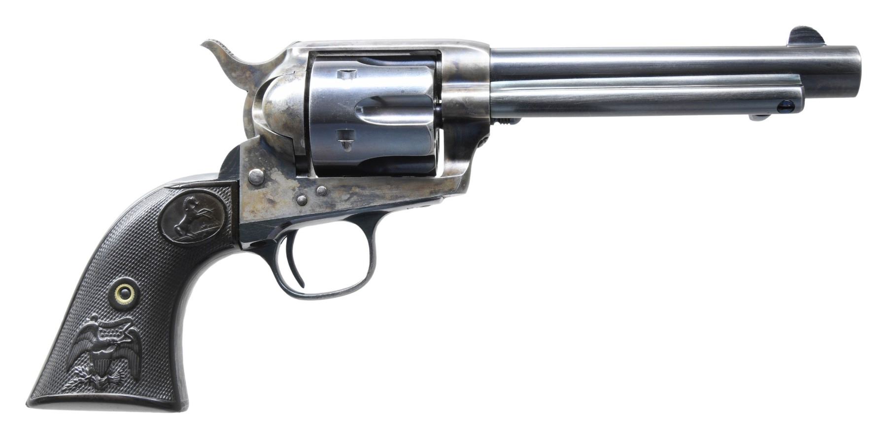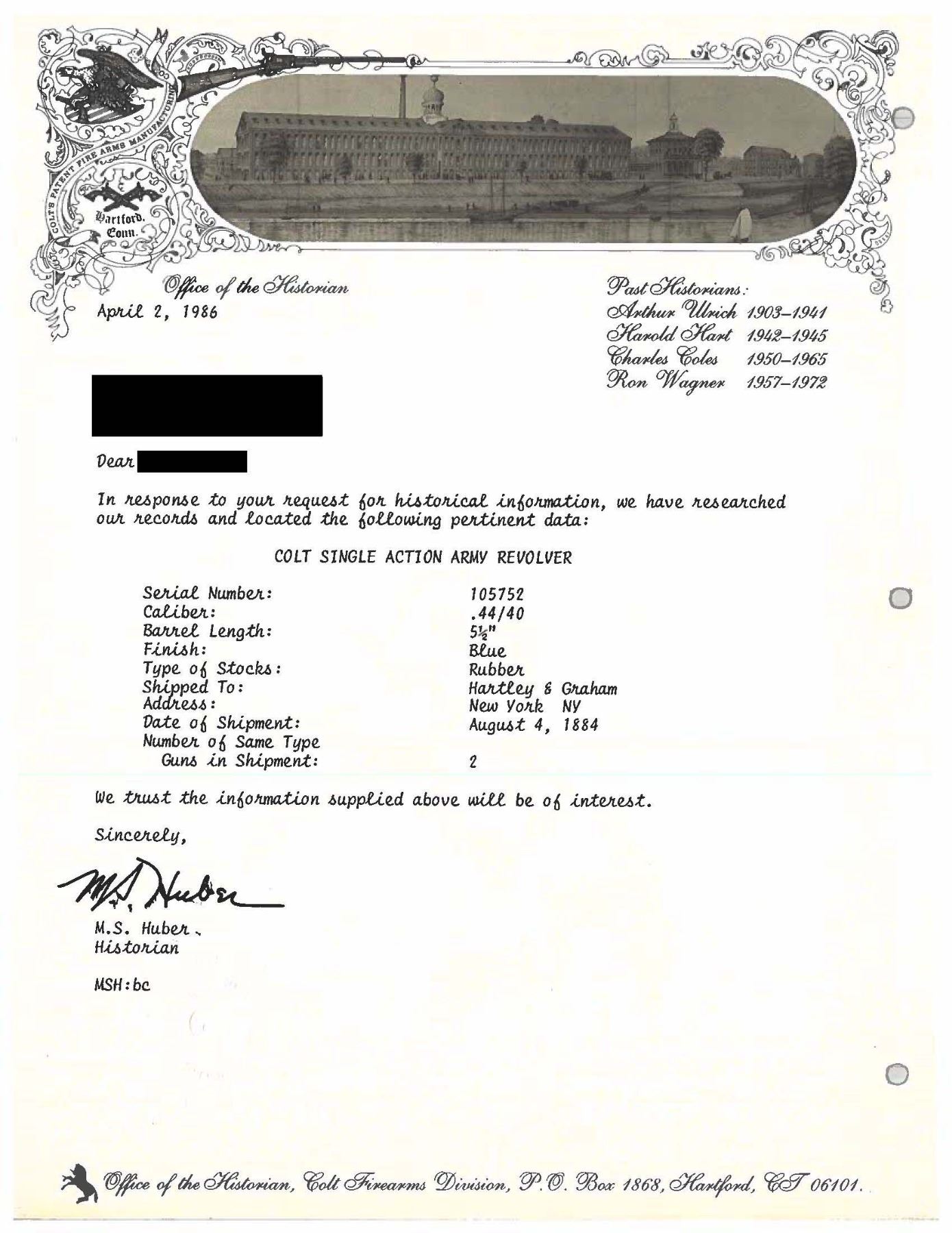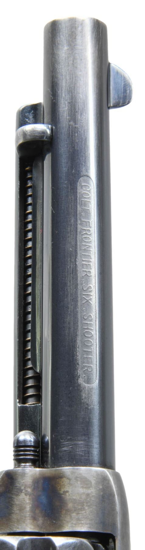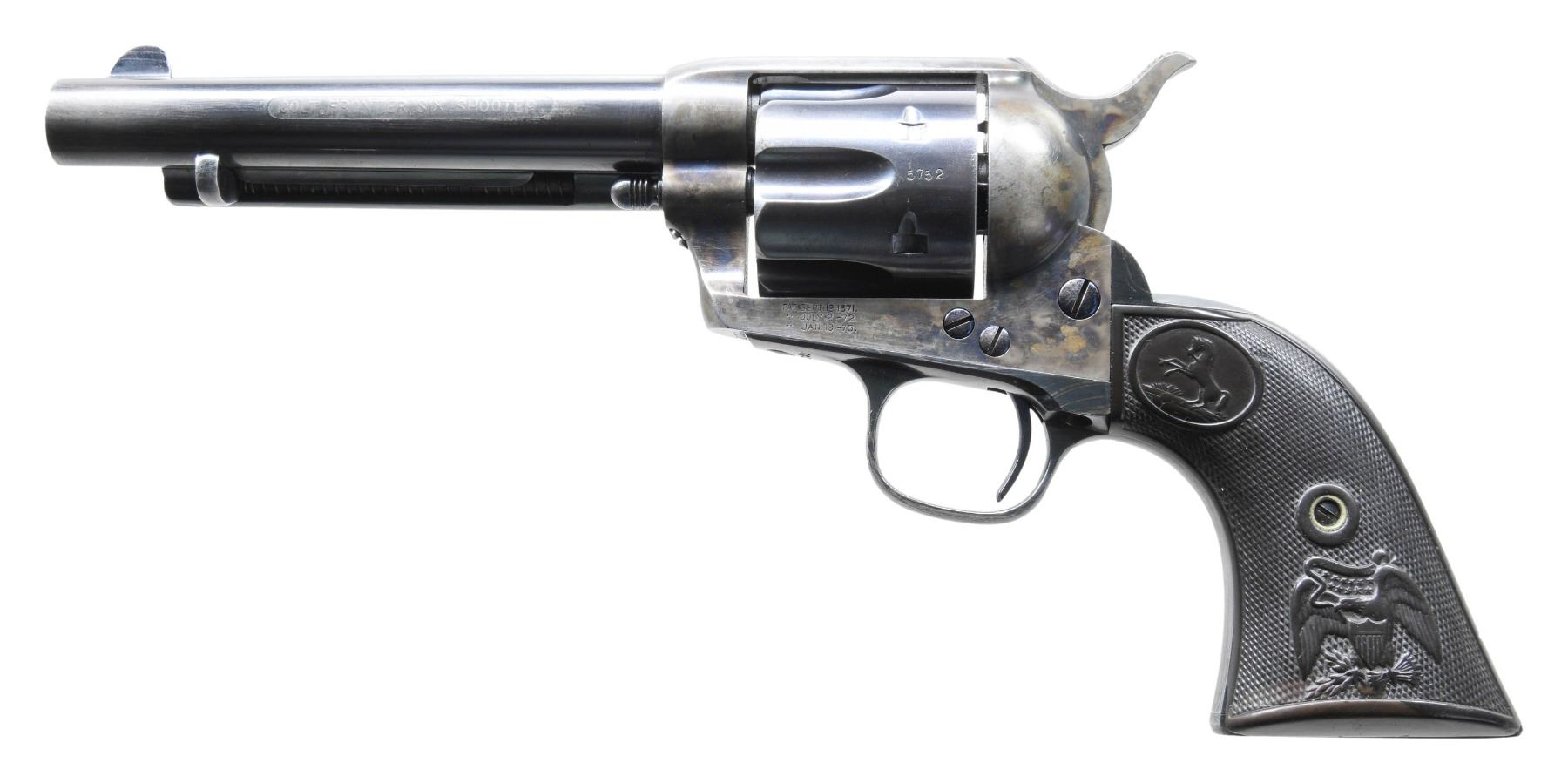 Cal. 44-40. S# 105752. Bbl. 5 1/2". Single Action Army Frontier Six Shooter revolver mfg. by Colt. Left side of the bbl. exhibits an acid etched "COLT. FRONTIER. SIX. SHOOTER" panel with Colt's single line address marked across the top. Left side of the black powder frame is marked with Colt's 3-line patent information. Left side of forward trigger guard web is marked "44.C.F." with "44" stamped on the underside of the bbl. Frame, hammer, and loading gate exhibit a case color hardened finish, with remaining metal components exhibiting a blue finish. Barrel, ejector rod housing, and cyl. exhibits a high-quality, reapplied blue finish. Trigger, cyl. base pin, ejector rod, frame screws, and grip screw are nitre blued. Frame is mounted with 2-piece Colt checkered brown hard rubber grips. Standard SAA pattern blade front sight and frame notched rear sight. All serialized parts are matching and include the frame, cyl., bbl., and grip straps. Grips are unnumbered. UNATTACHED ACCESSORIES: Colt factory letter stating: "Serial Number: 105752/ Caliber: .44/40/ Barrel Length: 5 1/2"/ Finish: Blue/ Type of Stocks: Rubber/ Shipped to: Hartley & Graham/ Address: New York NY/ Date of Shipment: August 4, 1884/ Number of Same Type Guns in Shipment: 2". CONDITION: action retains good to large amounts of its original case color hardened finish, exhibiting some areas of vibrant coloring, with areas of fading to gray patina. Blue parts retain large amounts of their original finish, showing areas of wear fading to gray patina. Metal components show areas with varying degrees of cleaning striations overall. Front grip strap retains a mostly gray patina with the trigger guard showing more prevalent cleaning marks. Bore exhibits consistent light pitting and some scattered spots of moderate pitting, while retaining well defined rifling throughout. Proper manual mechanics with tight cyl. lockup. Grips show smoothing and some scattered marks from handling and storage, with the left panel exhibiting a chip on the interior at the bottom left corner of the butt. PROVENANCE: The Esteemed Norm Greenberg Collection. (01-27683/MLW). ANTIQUE. $5,000-8,000.