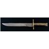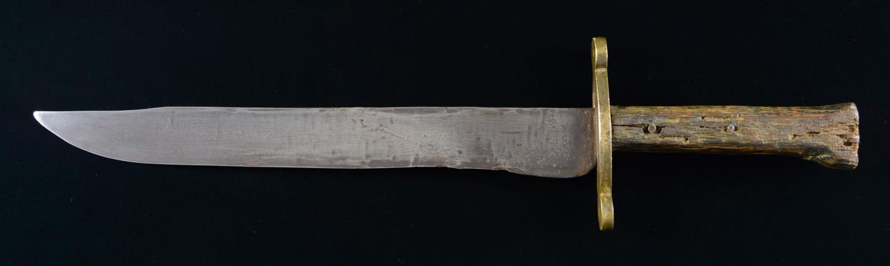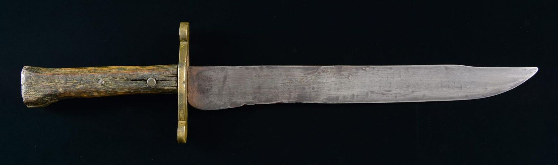 Overall length: 16 7/8”. Blade length: 11 1/2". Plain, hand-forged blade with a 2 3/4" clipped point. Brass crossguard with lobed ends. 1-Piece, hand-carved wood grip with 2 iron retention rivets. No sheath. CONDITION: blade has a medium gray patina and shows evidence of sharpening over many years. Crossguard has a deep, dark patina. Grip shows significant wear with minor splinter losses & possibly some insect damage. (02-20077/BF). $300-450.