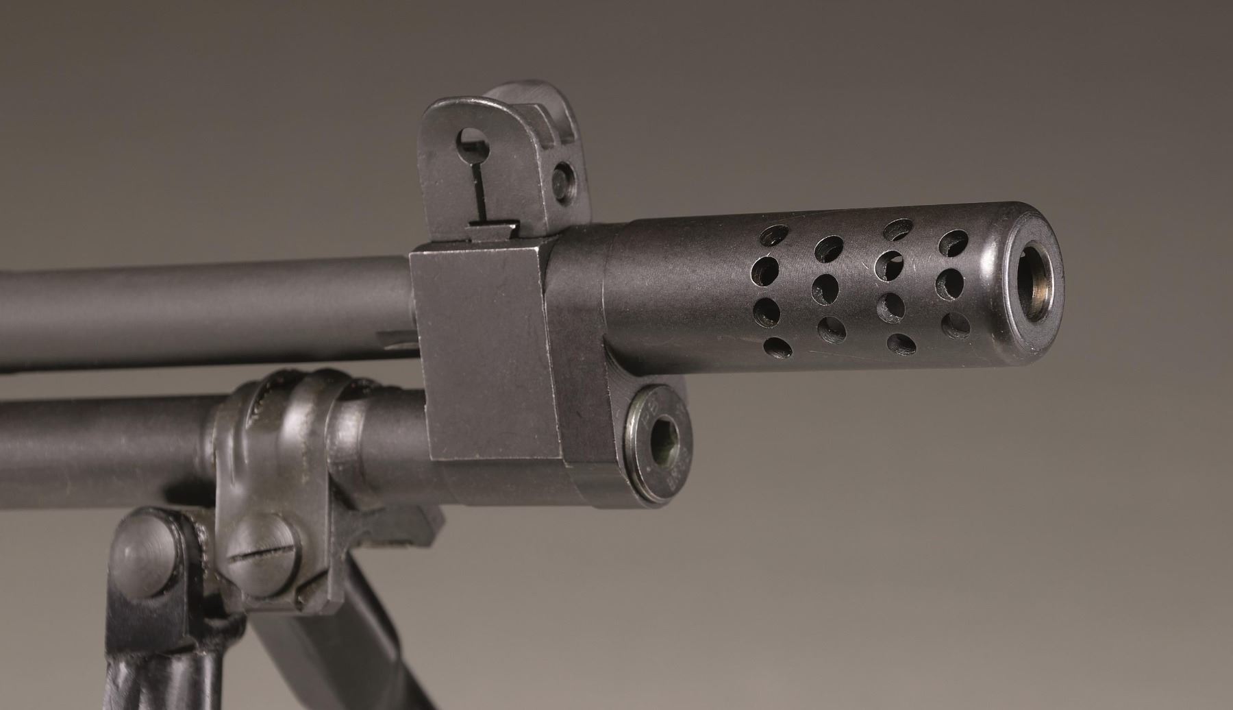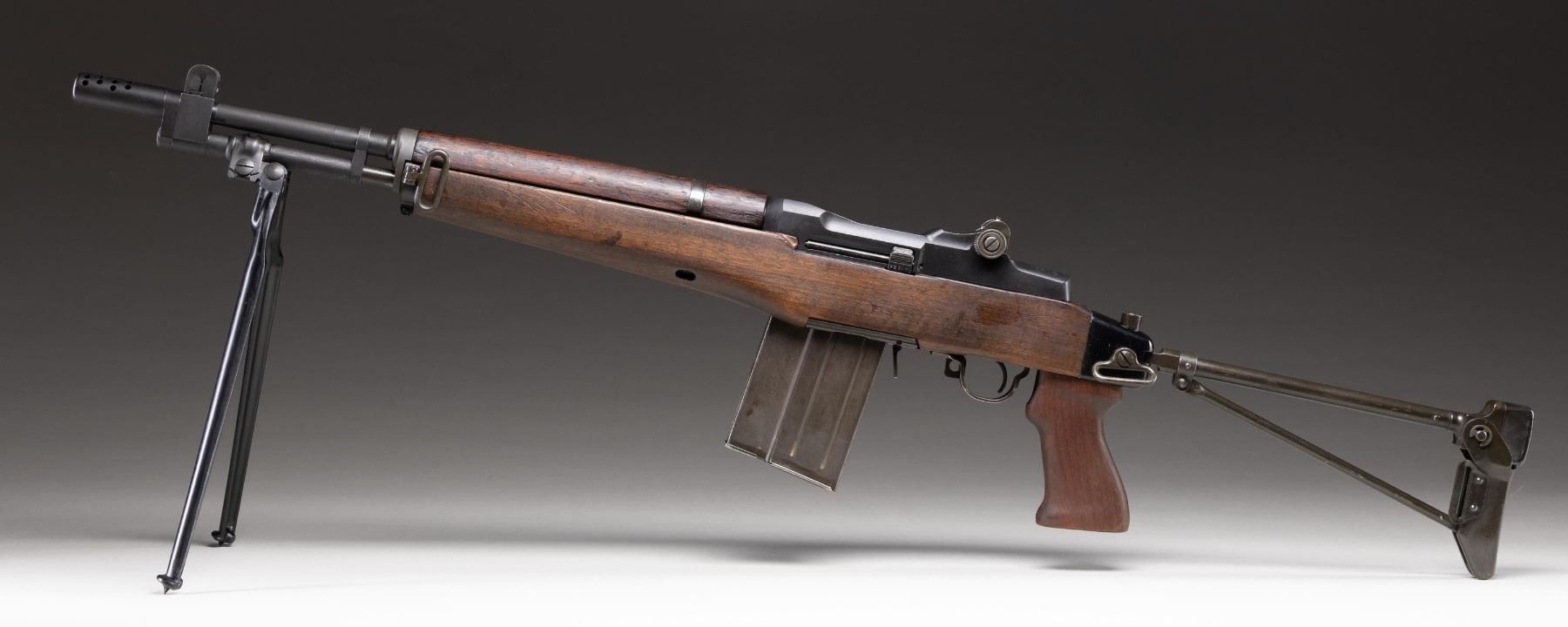 GARAND SEMI-AUTO MILITARY RIFLE. Cal. 7.62x51. S# 2044972. Bbl. 19" including muzzle brake. No visible import mark. Bbl. is marked only on right side w/ "7.62MM". Bolt marked "HRA" & electro-penciled "7.62 BM-59". Rifle is a conversion by Beretta in Italy of a US M1 Garand rifle to 7.62 NATO. Conversion entailed fitting a new bbl. T105E1 type rear sight. Blade front sight w/ protective ears. Operating rod is marked "SA" & additionally marked on the outside "PB BM-59". Muzzle brake & gas cyl. lock is solid assembly (not tri-compensator). Bipod is fitted. Trigger housing marked "PB BM-59". Walnut stock set with side folding buttstock and separate pistol grip. Side mounted sling swivels. MAGS: one 20 rd. Marked "BM 59". CONDITION: stock set has light wear and scattered handling marks. Metal retains 80% of its original Beretta finish with thinning and light wear. Very good shiny bore. (25-2872/RW). CURIO. $1,000-1,500.