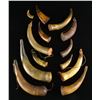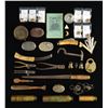 This lg. & varied group of mostly Civil War militaria & related items includes 2 three section spy glasses. / 1 Four section spy glass. / 2 Tin snuff boxes. / 1 US Navy soap dish missing mirror. / 2 Brass uniform protectors for button polishing. / 1 Fleam. / 1 Folding pocket knife. Blade stamped, “W. CASSO_”. / 2 Pistol bullet molds. 1 marked “COLT’S PATENT”. / 1 Screwdriver. / 1 Ferrier’s hoof cleaner. / 1 Restrike of a Confederate half dollar. / 7 Civil War eagle “I” buttons. / 2 Post war Marine buttons. / 1 Ship wreck found “SNY” buckle showing serious encrustation from the ocean. / 1 Section of early red & white cloth. / 1 Haversack made from mattress ticking. / 1 Lice & tick horn comb. / 1 Zinc mirror having heavy oxidation. / 1 Corps badge for the 1st Corps, 3rd Division. / 1 Pair of false embroidered “6”s. / 1 Sailor’s palm. / 1 Crooked knife for cleaning horseshoes. / 1 two cavity bullet mold for a picket bullet. / 1 Post Civil War glasses having screened edges. / 1 Post war brass lock & key. / 1 Brass shield. / 2 OVM cartridge box plates, likely of post Civil War mfg. / 1 OVM belt buckle likely of post Civil War mfg. / 1 Pair of opera glasses. / 1 Eagle “I” cuff button & a “1” hat number. / 1 GAR medal. / 1 Muddler. / 1 Side knife made from a cut down sword blade. / 1 Brass crescent. / 1 Brass triangle. / 1 US Grant pamphlet. / 1 Post war clear ink well. / 1 Leather belt for an M51 buckle. / 12 Plain undecorated powder horns ranging in size from 3" to 16 1/2". / 1 Powder horn measuring 11 1/2" having geometric engraving. / 1 Powder horn measuring 7" having a sea serpent head carved around the spout. CONDITION: all items show light to moderate wear except as noted. (02-14204 & 02-14463/BF). $900-1,400.