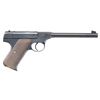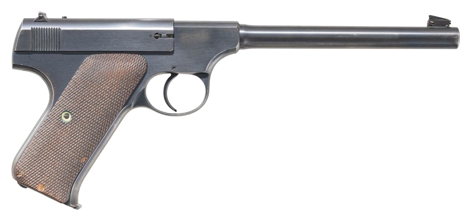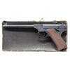 SEMI AUTO PISTOL. Cal. 22 LR. S# 67822. Mfg. 1929. Bbl. 6 5/8" with elevation adjustable front sight & drift adjustable rear. Left side of frame marked "THE WOODSMAN". Matching number on underside of slide. 2 piece checkered walnut grips. MAGS: 3 total 10 rd., all marked on bottom "CAL .22 / COLT". UNATTACHED ACCESSORIES: original box with proper end label. containing manual. CONDITION: metal retains 96% original blue with light sharp edge wear & faint freckling at rear of frame. Left grip panel has a few small dings; otherwise grips near excellent. Shiny bore with crisp rifling. PROVENANCE: From the Buckstix Collection. (25-6337/BH). CURIO. $1,500-2,250