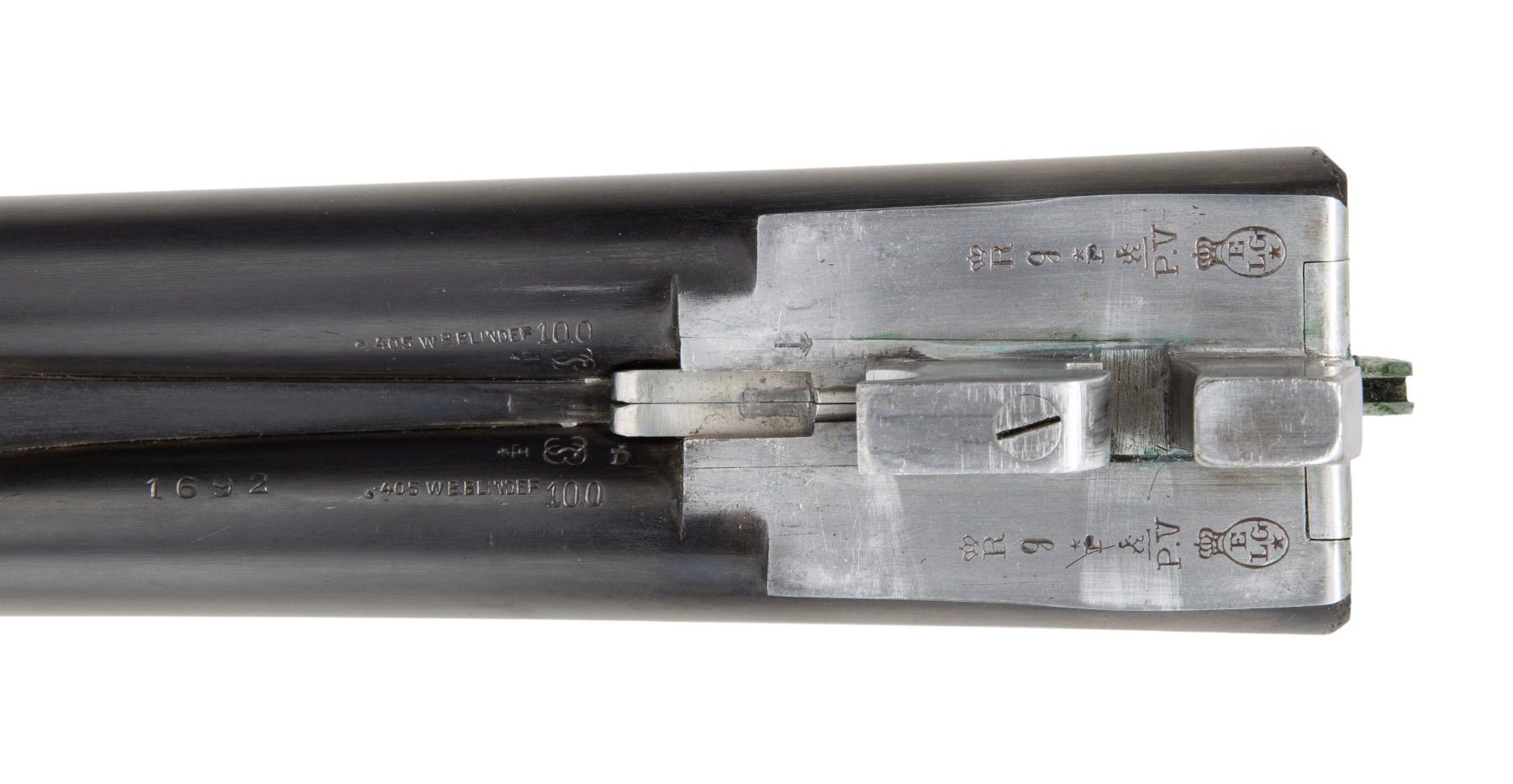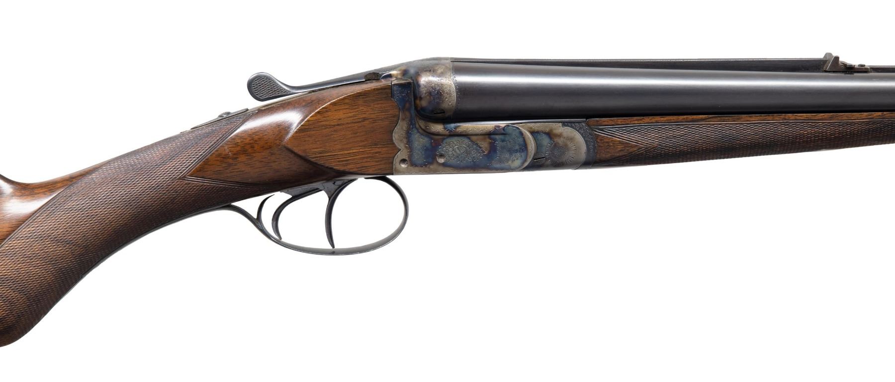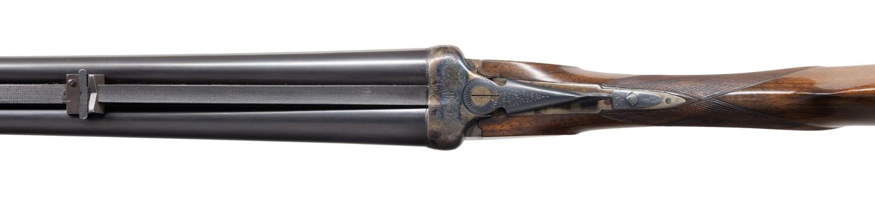 L. CHRISTOPHE. Cal. 405 Winchester. S# 1692 (1928). The 24-1/2" dovetailed barrels are fitted with full length matted rib. Rear position is stepped forming quarter rib. One standing one folding leaf express rear sight is mounted at the junction. Silver bead front sight is in long ramp formed by rise of rib. Barrel flats are stamped with 1928 Belgian nitro proofs. Bottoms of barrels are stamped ".405W". Case hardened ogee backed boxlock action with non-automatic safety ("S" in gold), hidden third fastener, bushed strikers, side clips and double triggers (front articulated) is engraved with nicely cut rose and scroll. "I. Christophe" "a Bruxelles" is on floor plate. Blued top lever and trigger guard are engraved with matching scroll. Lightly streaked and figured European walnut round knob pistol grip buttstock measures 14-5/8" over ribbed horn buttplate. Point pattern checkering is at grip. Matching splinter ejector forend with Deeley release has individual silver letters "AL" inlet on central diamond. MEASUREMENTS: STOCK: DAH: 2-15/16". DAC: 1-7/8". CAST: about 5/8" off. LOP: 14-5/8". WEIGHT: 6 lb. 11 oz. CONDITION: very fine. Barrels retaining nearly all original blue. Action retains over 95% original case hardening color with only a hint of silvering on beads. Nearly all blue is on trigger guard and top lever. Stocks retain nearly all of their hand rubbed oil finish with a few minor marks. Bores are lightly frosted with strong rifling throughout. Action is tight. Ejectors are strong and in time. A fast handling light weight rifle in a great all around caliber. (25-5014/MGM). CURIO. $4,000-6,000.