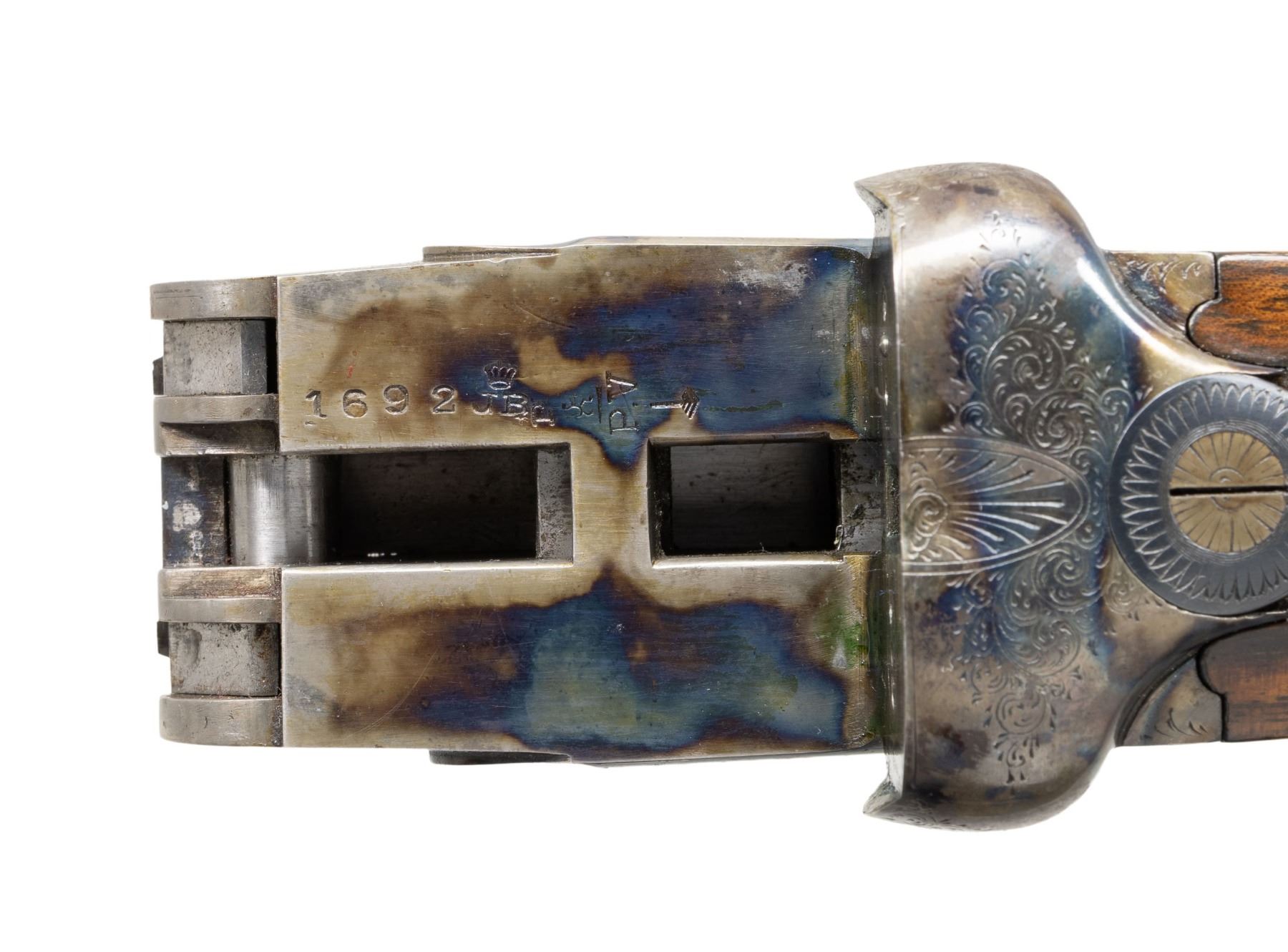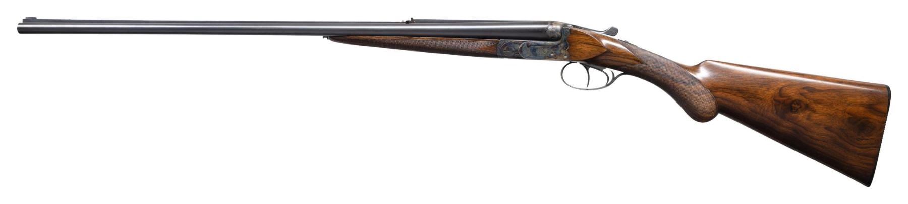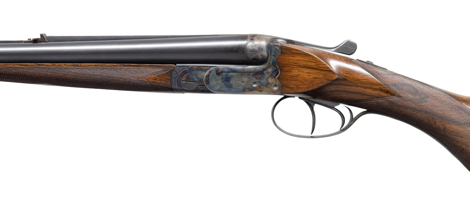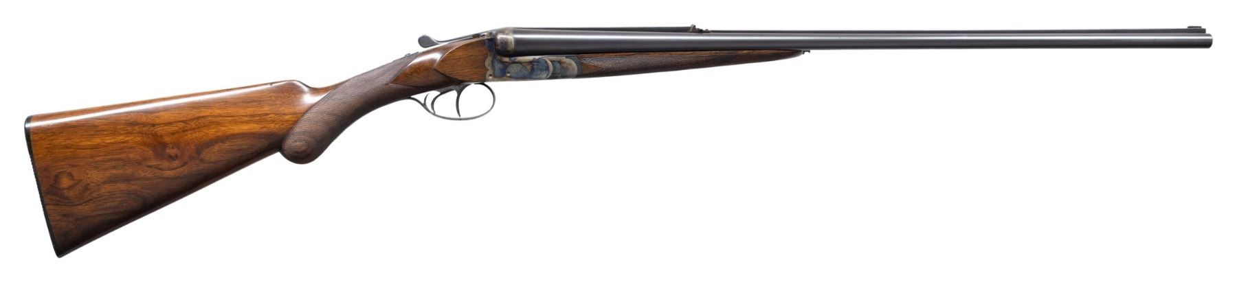 L. CHRISTOPHE. Cal. 405 Winchester. S# 1692 (1928). The 24-1/2" dovetailed barrels are fitted with full length matted rib. Rear position is stepped forming quarter rib. One standing one folding leaf express rear sight is mounted at the junction. Silver bead front sight is in long ramp formed by rise of rib. Barrel flats are stamped with 1928 Belgian nitro proofs. Bottoms of barrels are stamped ".405W". Case hardened ogee backed boxlock action with non-automatic safety ("S" in gold), hidden third fastener, bushed strikers, side clips and double triggers (front articulated) is engraved with nicely cut rose and scroll. "I. Christophe" "a Bruxelles" is on floor plate. Blued top lever and trigger guard are engraved with matching scroll. Lightly streaked and figured European walnut round knob pistol grip buttstock measures 14-5/8" over ribbed horn buttplate. Point pattern checkering is at grip. Matching splinter ejector forend with Deeley release has individual silver letters "AL" inlet on central diamond. MEASUREMENTS: STOCK: DAH: 2-15/16". DAC: 1-7/8". CAST: about 5/8" off. LOP: 14-5/8". WEIGHT: 6 lb. 11 oz. CONDITION: very fine. Barrels retaining nearly all original blue. Action retains over 95% original case hardening color with only a hint of silvering on beads. Nearly all blue is on trigger guard and top lever. Stocks retain nearly all of their hand rubbed oil finish with a few minor marks. Bores are lightly frosted with strong rifling throughout. Action is tight. Ejectors are strong and in time. A fast handling light weight rifle in a great all around caliber. (25-5014/MGM). CURIO. $4,000-6,000.
