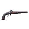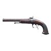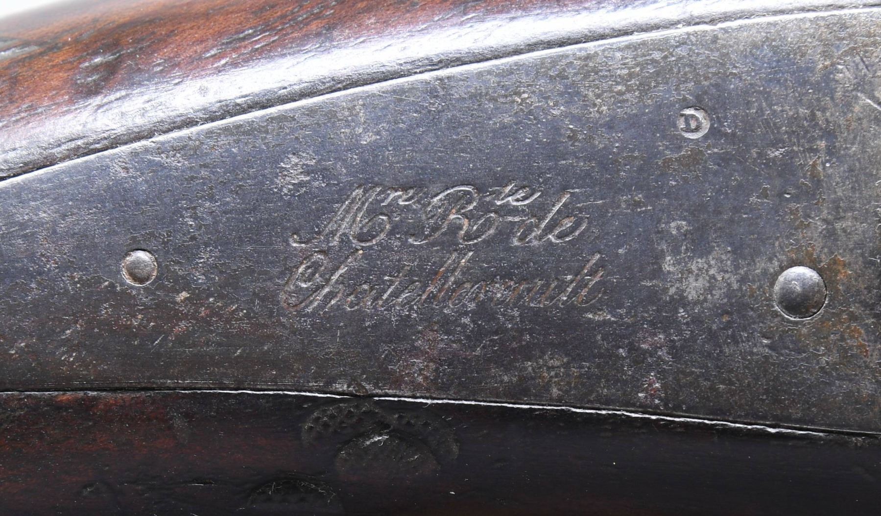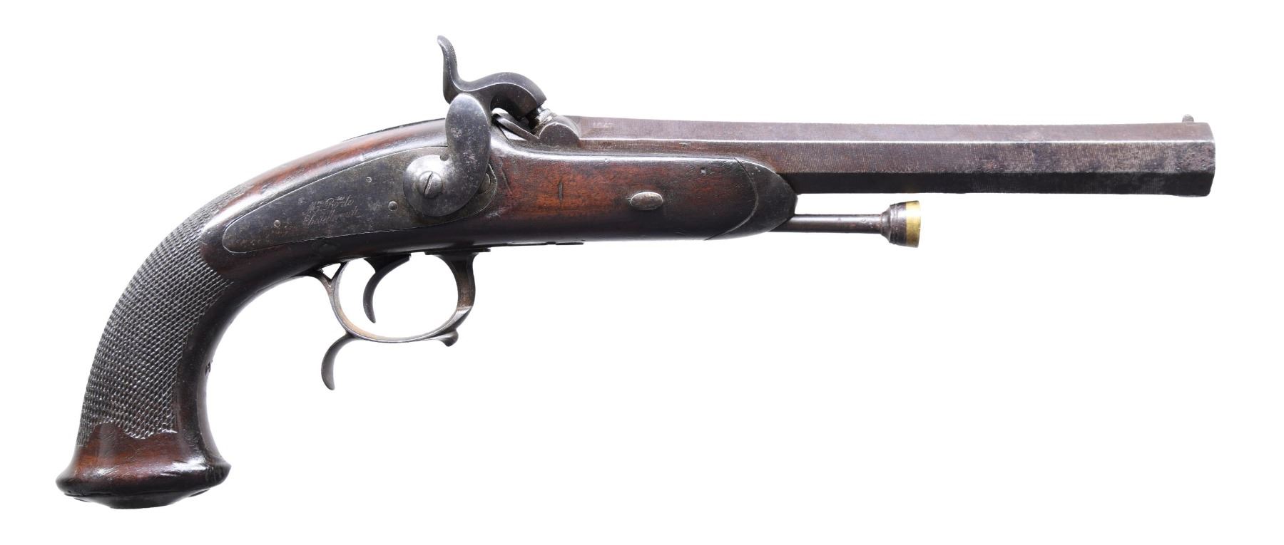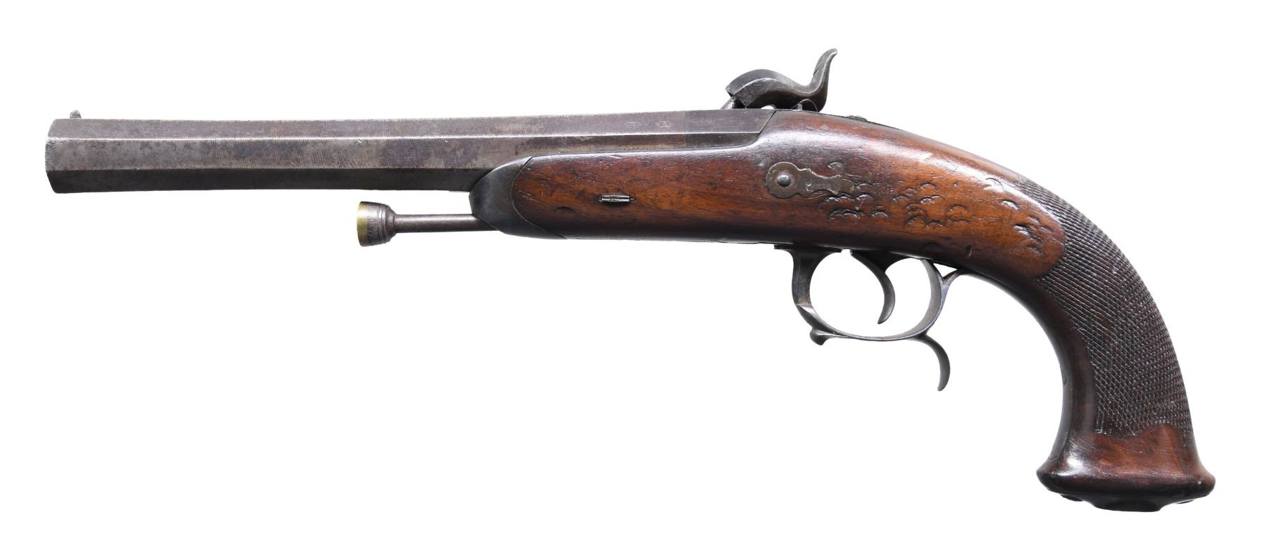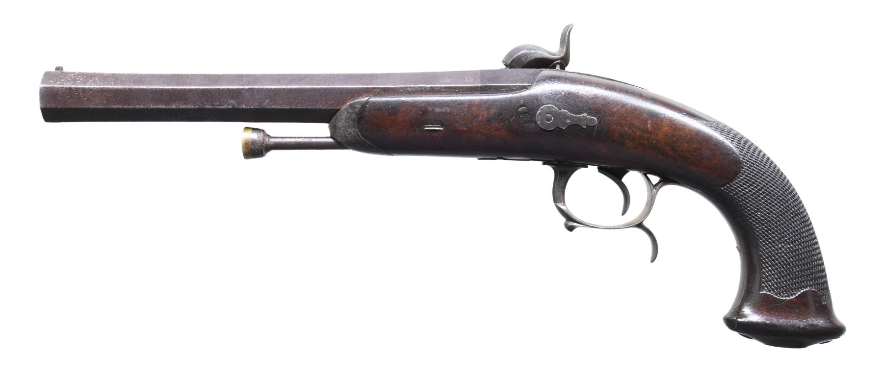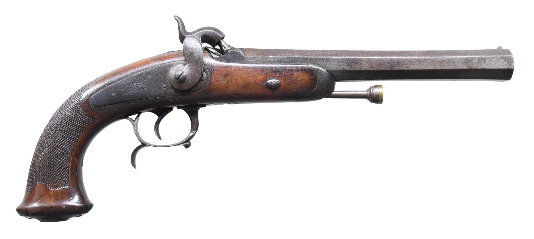 PERCUSSION CAVALRY PISTOLS. Cal. 69. NSN. Bbls. 7 7/8". Brace of French Model 1833 percussion cavalry pistols mfg. by Chatellerault. Lockplates are marked "Mre Rle de/ Chatellerault". The faceted twist damascus bbls. are marked with "D" and "L" proofs on the left quarter flat, "1847" marked on the right quarter flat, and an "MR" proof marked on the right side. Small blade front sights, with V-notch rear sights. Checkered wood oval butt stocks, with spurred trigger guards. Steel ramrods, with brass tipped ends. Threaded caps on butts are absent. CONDITION: good, with metal components retaining a dark mottled gray patina and exhibiting scattered areas of light to moderate pitting overall. Brass tips on ramrods exhibit a pleasing mellow patina. 1 pistols action holds at both half and full cock, with the latter holding only at full cock. Stocks show scattered marks and impressions from handling and storage, but otherwise remain sturdy and serviceable. 1 pistol exhibits what appears to be a hairline crack that stems from the lockplate to the trigger guard finial, as well as numerous impressions on the left side. (01-26184/MLW). ANTIQUE. $500-900.