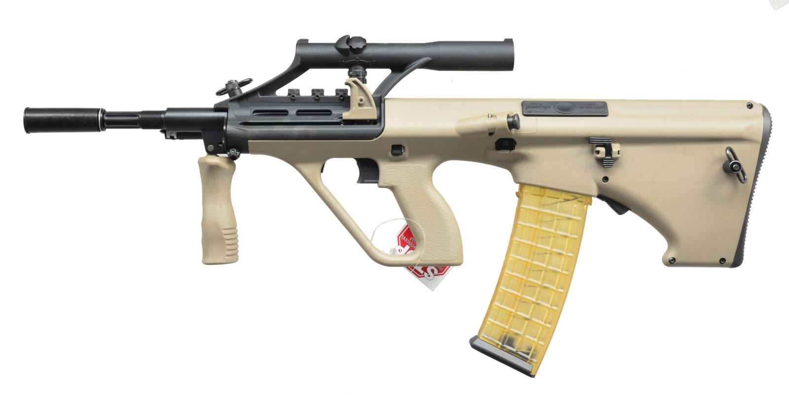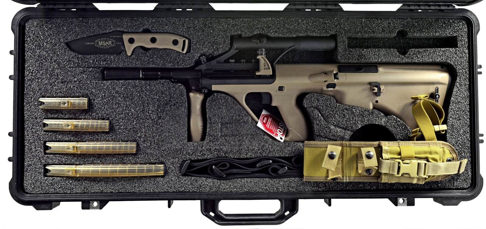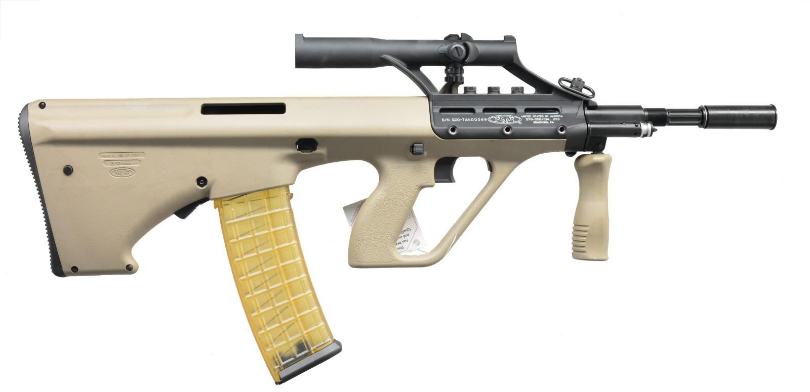 W/ 1.5X FACTORY SIGHT. Cal. 223. S# 600-TAN00069. Bbl. 16". The MSAR is an American mfg. Bullpup, very similar in aesthetics to the Steyr AUG. In true Bullpup fashion, the operator has the ability to utilize a long bbl. to take advantage of available ballistics w/ out sacrificing negative aspects of having a full-sized rifle. Due to the placement of the action, which is under the cheek of the shooter, the bbl. extends forward from that point, where it is typically above the trigger creating a much smaller signature. The stock or chassis is tan modeled plastic. Small section of the bbl. that is actually exposed is a combination of flutes & microgrooves for expedient cooling by increasing the surface area. Muzzle brake is a proprietary design, often referred to as a tulip. Like all MSAR designs, it includes a retractable vertical pistol grip. Microtech Small Arms Research started production in 2005 & continued until 2015. They are now continuing their popular knife line. A full tang knife w/ matching S# is included in this package. MAGS: complete set, 1 each of factory magazines; 1-10 rd., 1-20 rd., 1-30 rd., 1-42 rd. UNATTACHED ACCESSORIES: factory fitted MSAR hard case, matching knife & sheath, & Giles sling. CONDITION: new in box. Still retains factory safety hang tag on trigger guard & factory muzzle cap. Finish is complete w/ full coverage still enjoying its factory matte black appearance. Bore is shiny w/ good rifling & fire control group appears to function correctly when cycled by hand. (21-1587/JZ). MODERN. $1,200-1,800.