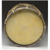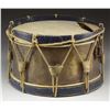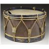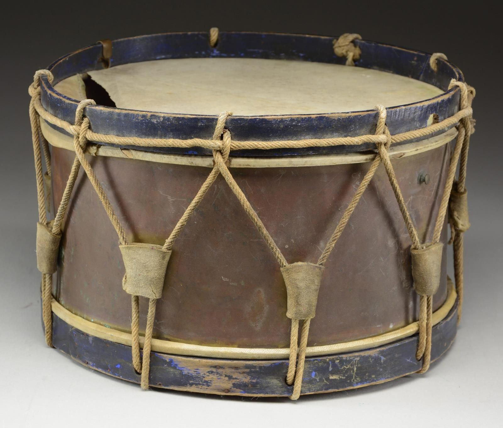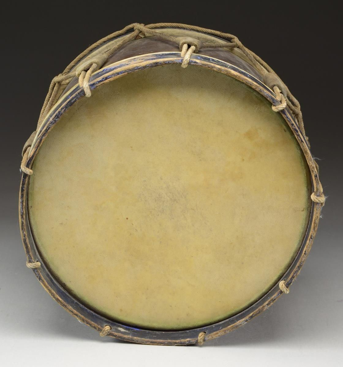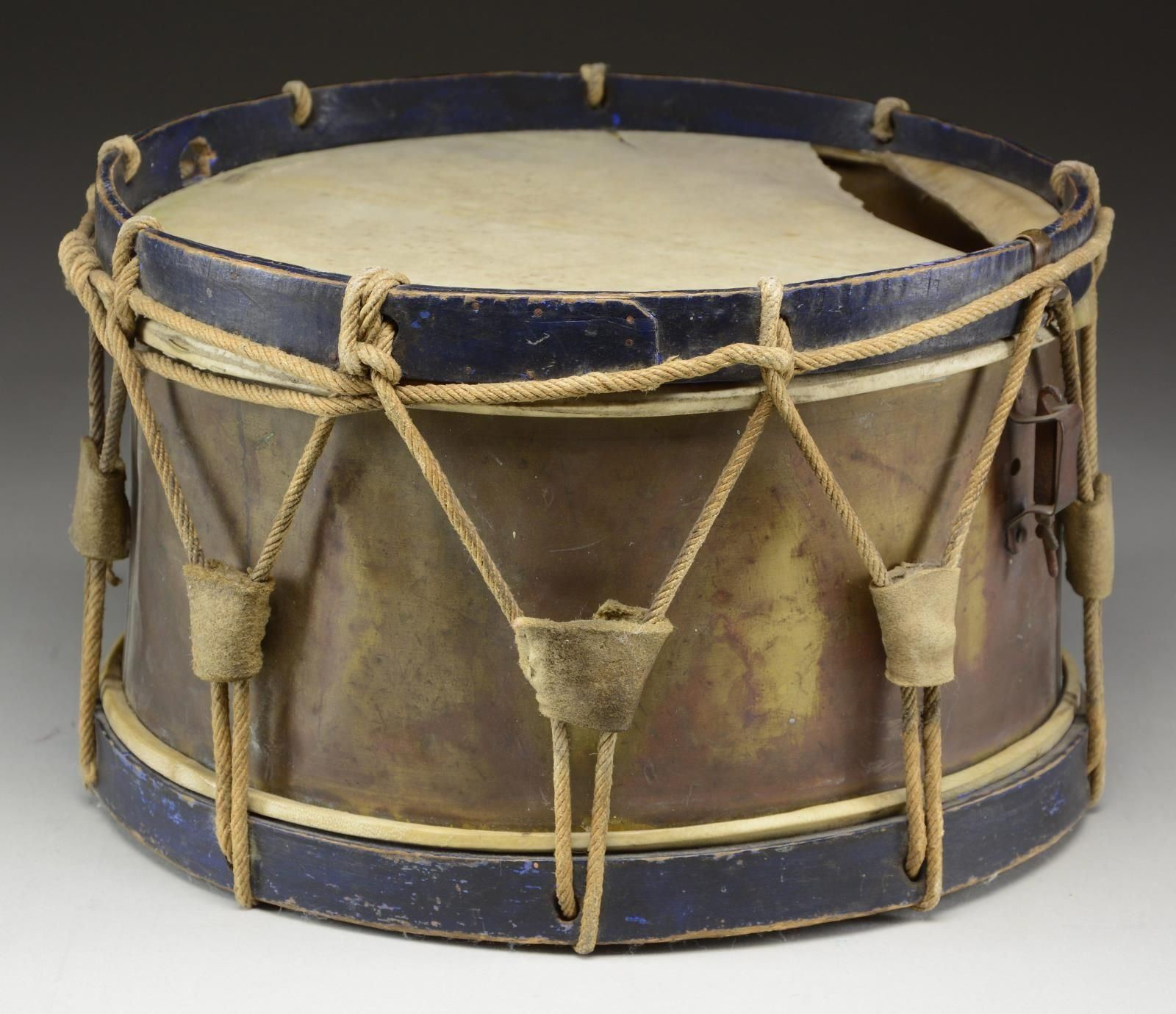 This drum measures 8 1/4" high with a 13 1/2" diameter, and likely dates from the third quarter of the 19th century. The body of the drum is brass, and the hoops are black painted wood. The original ropes have white buff leather tugs. The original skins are in place at the top & bottom. There is no maker’s label apparent. CONDITION: drum shows light to moderate wear overall with more significant wear at the top of the top rim, likely from drumsticks. The top skin is intact. The bottom skin has an 8” tear on one side and a smaller 2” tear near the edge. Ropes are unbroken and tugs are all present. (02-20120/BF). $200-400.