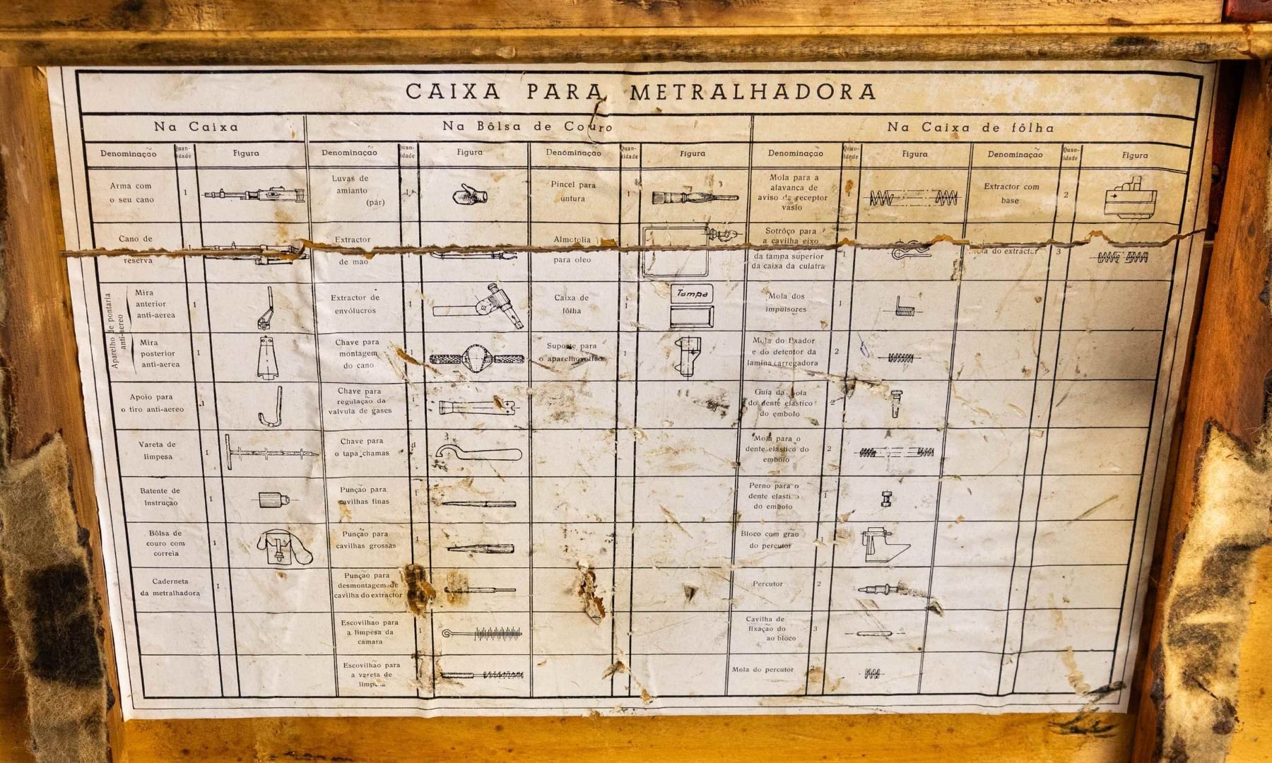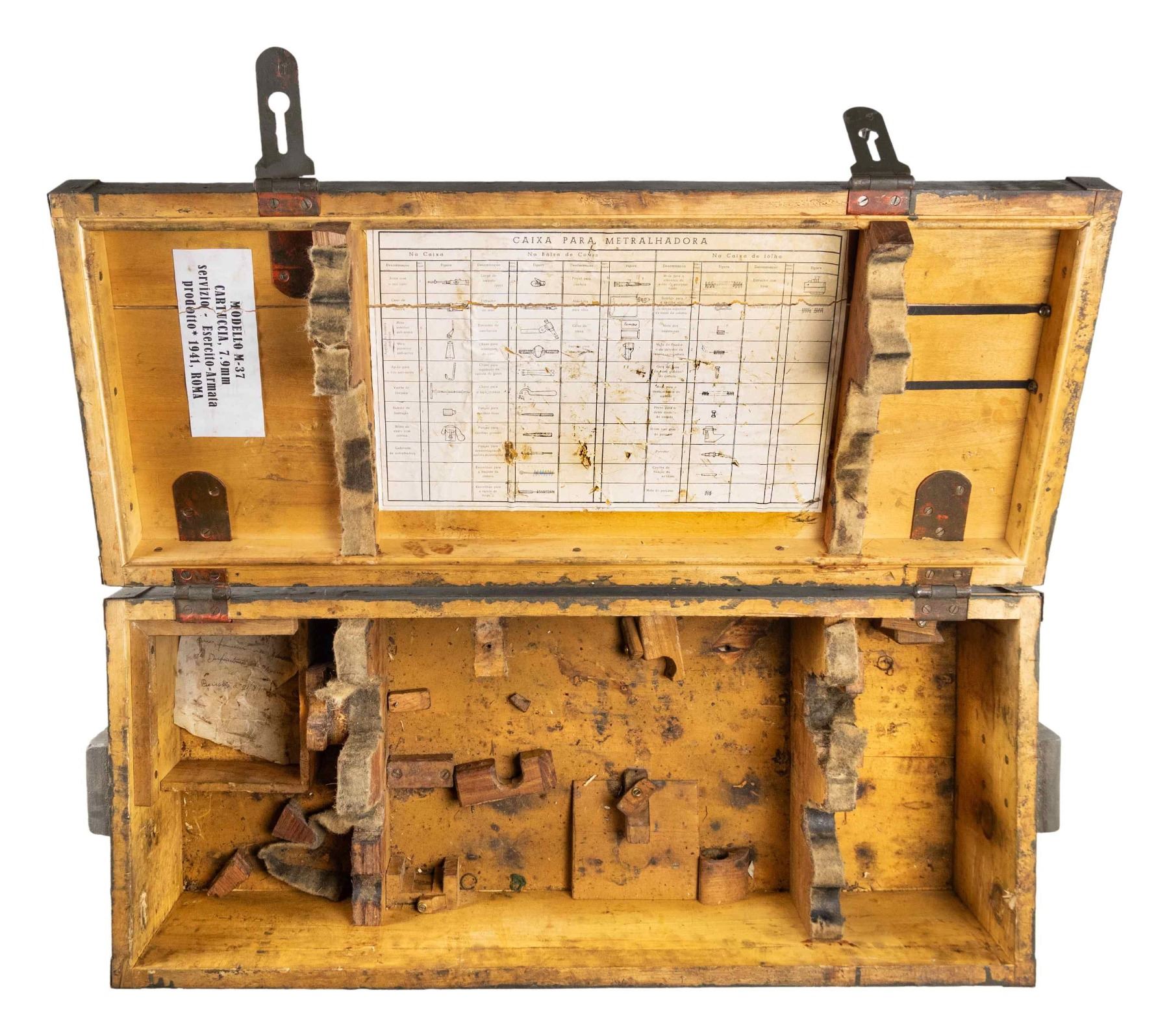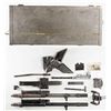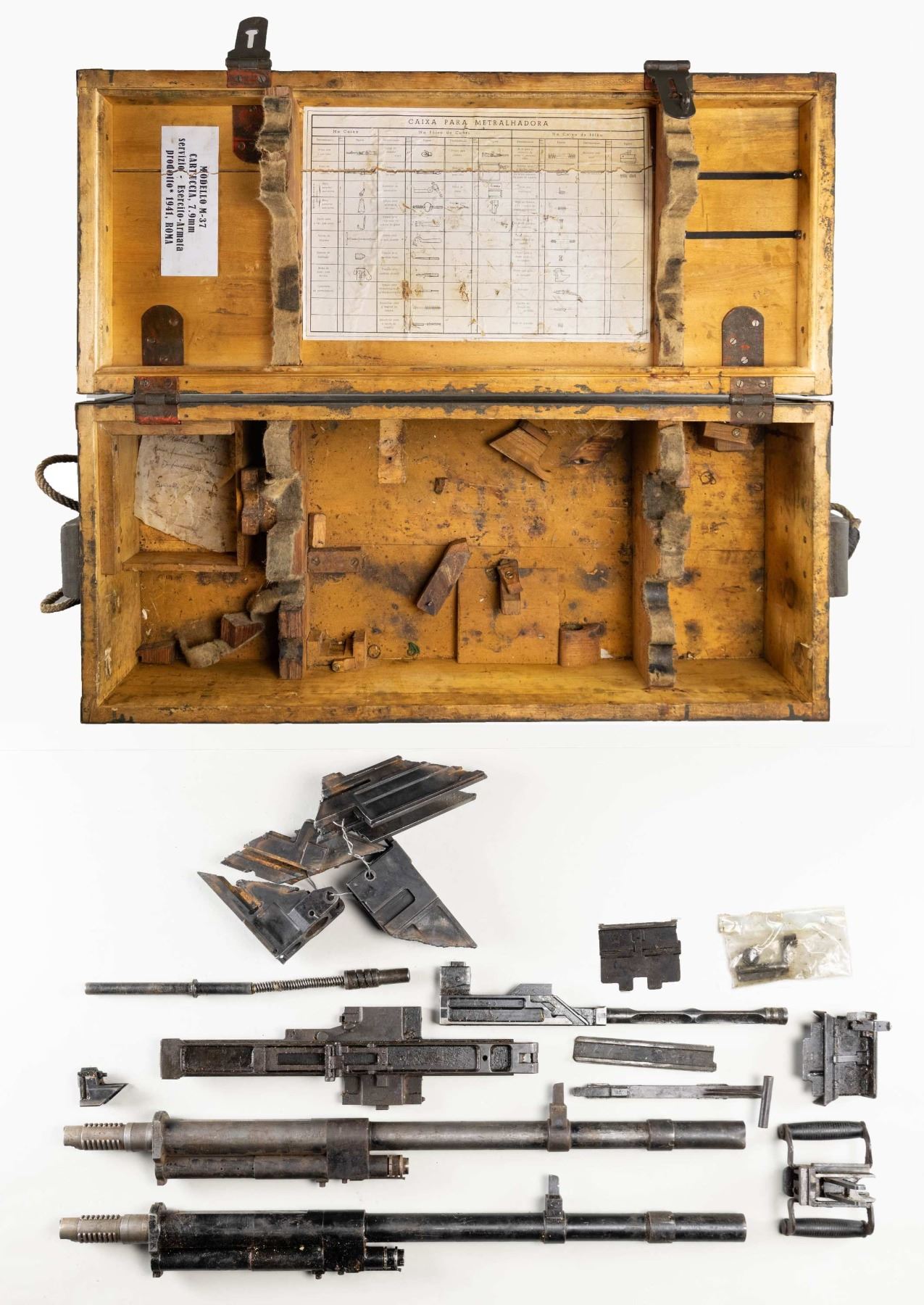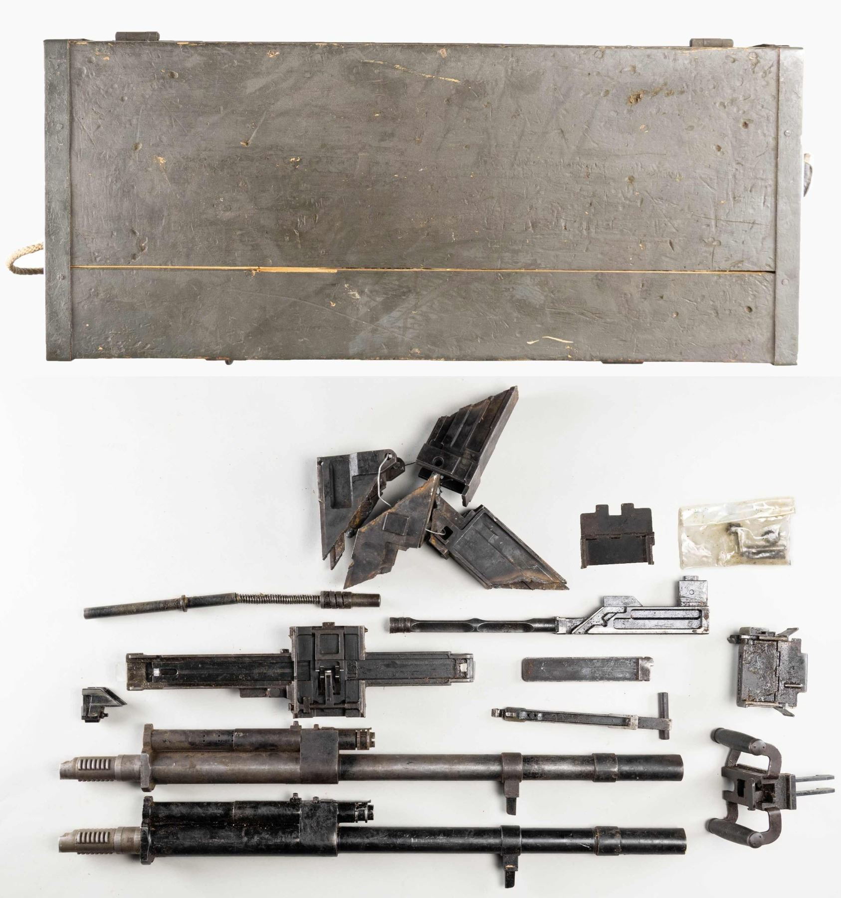 Breda M37 Torch-cut kit with transit kit, four cut receiver sections, spade grips, bolt, charging handle, dust cover, feedstrip guide, top cover & some small parts. No tripod present. Bores have strong rifling but dried cosmoline & oxidation. CONDITION: parts show varying degrees of wear with oxidation, finish loss & a notable dent at one end of a bbl. (02-24629/MJC). NON-GUN. $700-1,000.