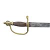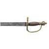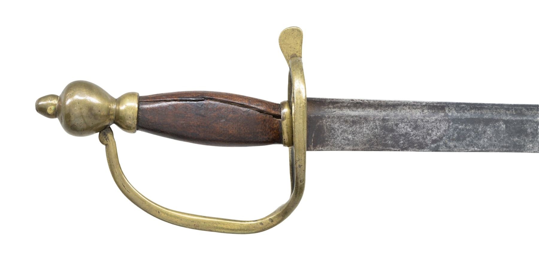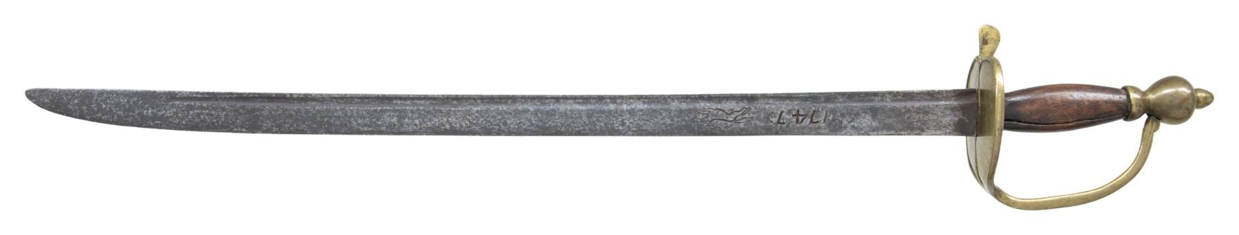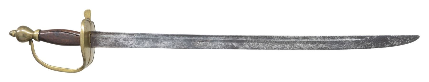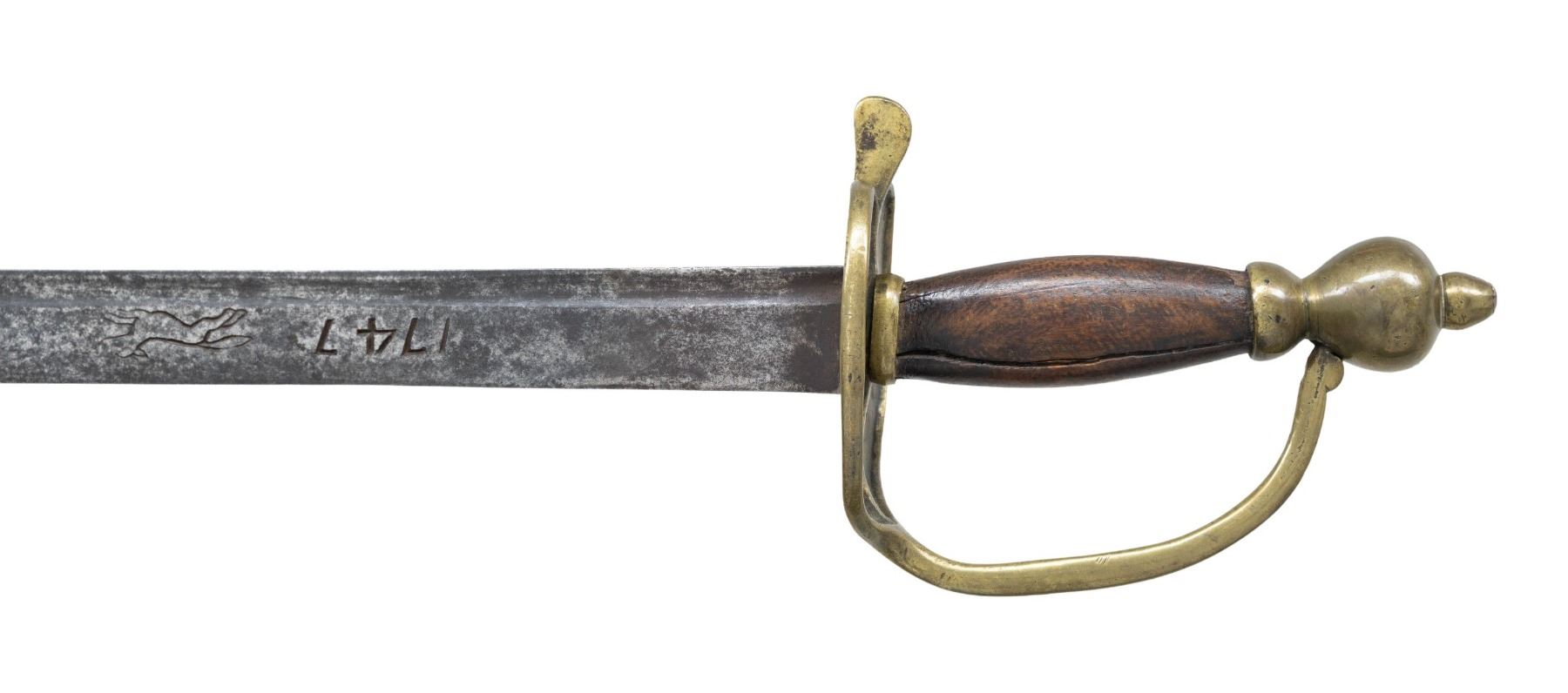 An 18th century infantry hanger likely originating from England. The sword measures 31" overall with a single fullered 24 3/4" blade featuring a running fox on each side as well as the stamped date "1747" which may be spurious. Brass hilt featuring a heart-shaped guard and a flat quillon. The hilt also features a wooden grip, plain knuckle bow, and globular pommel. No scabbard. CONDITION: sword shows moderate wear throughout. The blade has a dark mottled patina and the hilt has a pleasing mellow patina. The grip has lost its wire wrap and the wood has an age crack. PROVENANCE: Estate Collection of Nicholas Apergis. (02-24786/BF). $500-800.