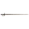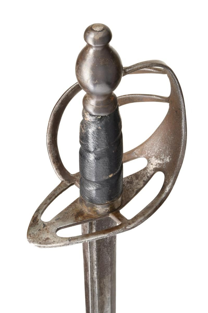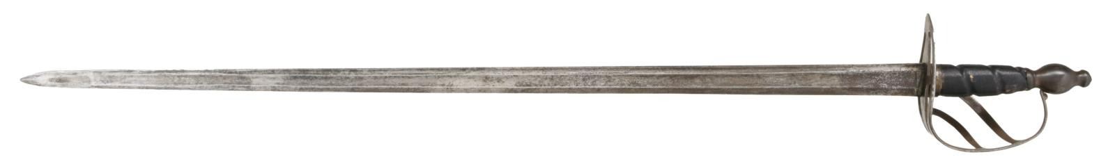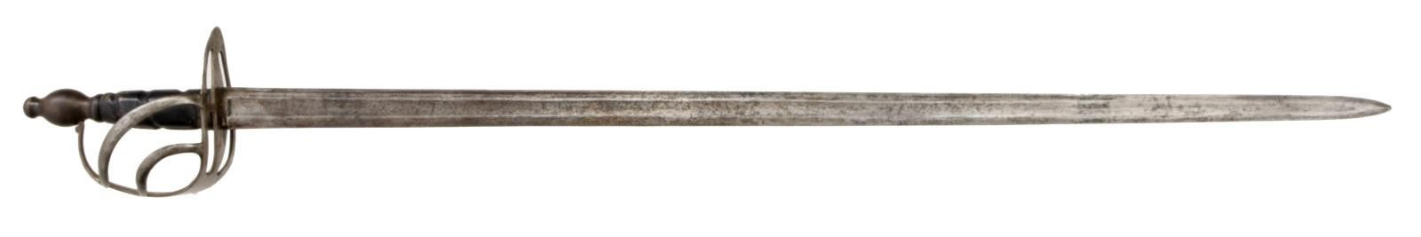 Overall length: 42 1/2". Blade length: 36". Plain blade with a single medium fuller and a secondary smaller fuller near the spine. Iron hilt with 4-slot counterguard. There is a 2-branch semi-basket guard that joins the plain knuckle bow. Tall, olive-shaped pommel with exceptionally large capstan. Leather wrapped grip. No scabbard. CONDITION: blade has a medium gray mottled patina with no evidence of serious pitting. The hilt has an attractive gray patina throughout. The grip appears to be rewrapped. (02-20040/BF). $700-1,000.