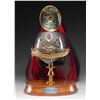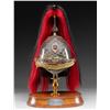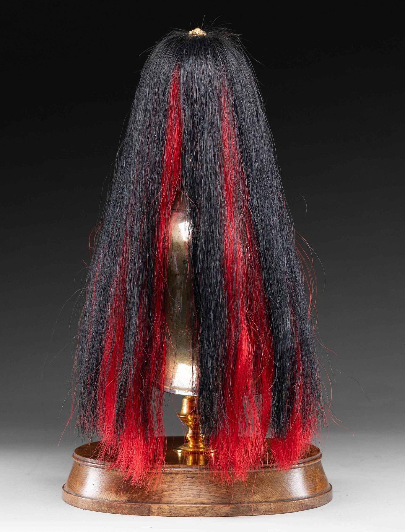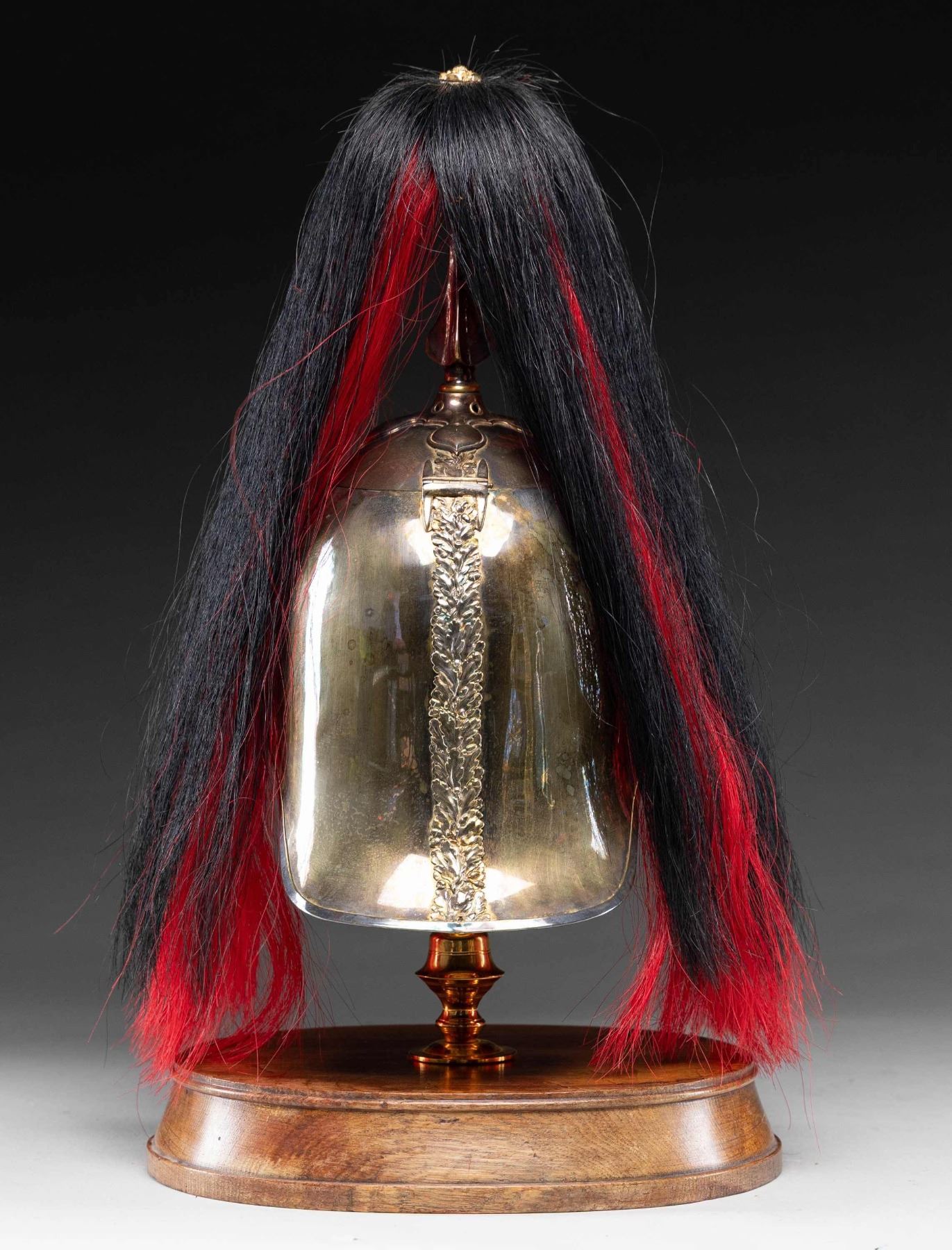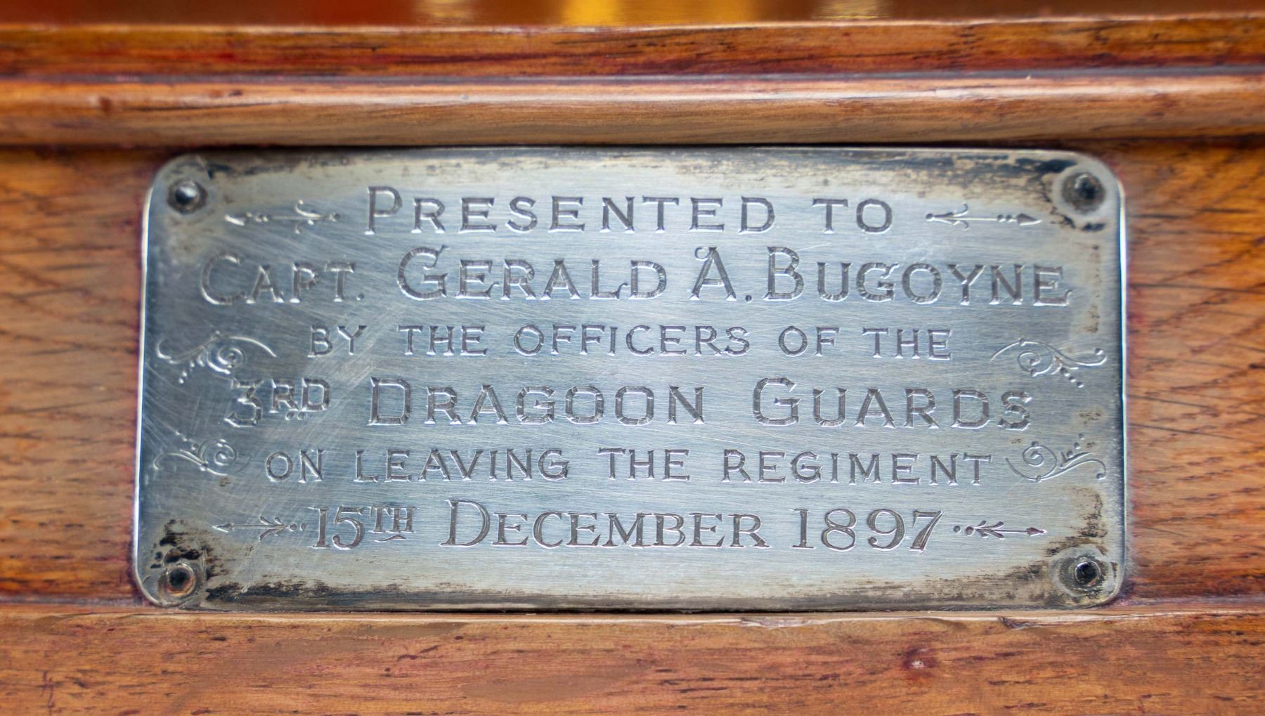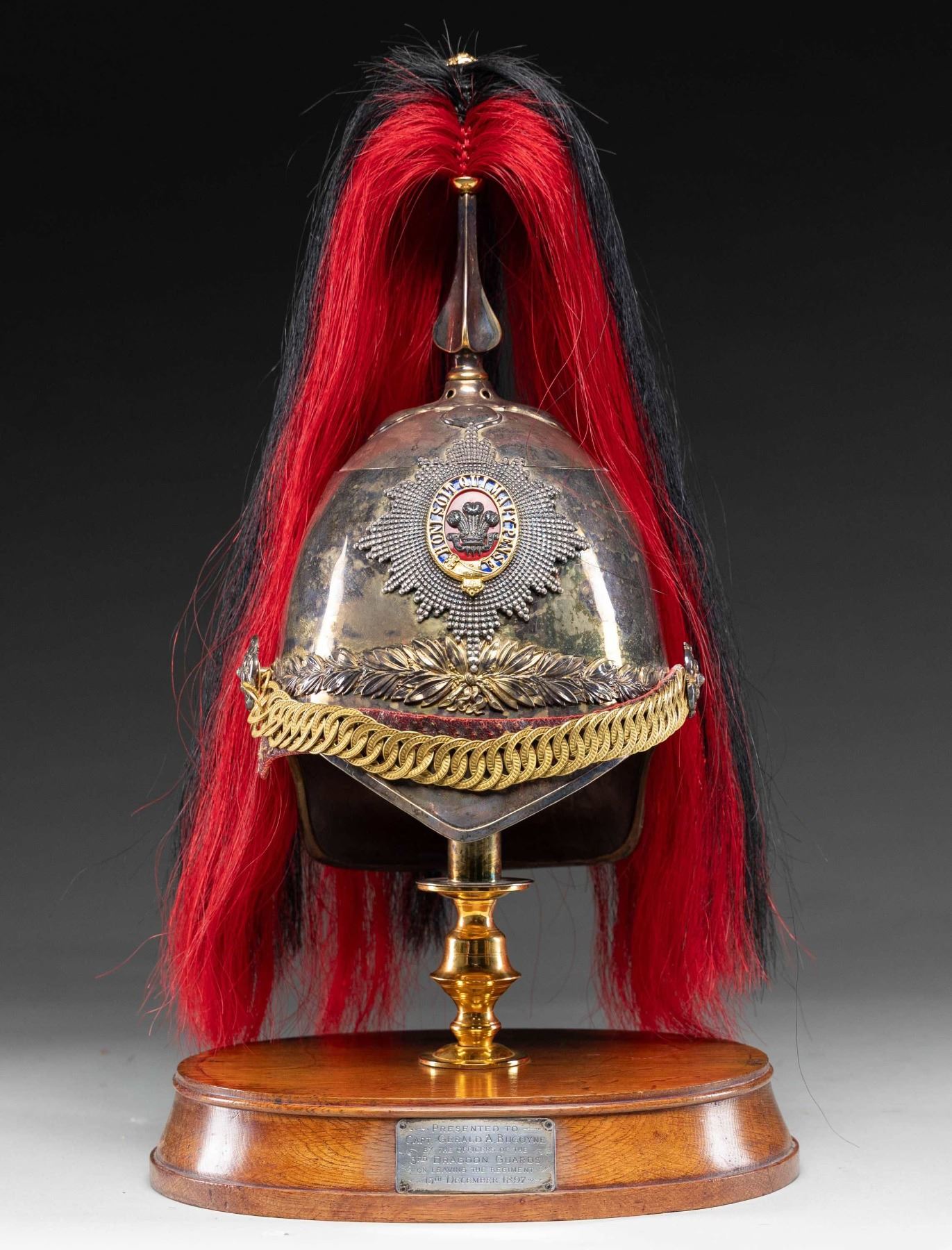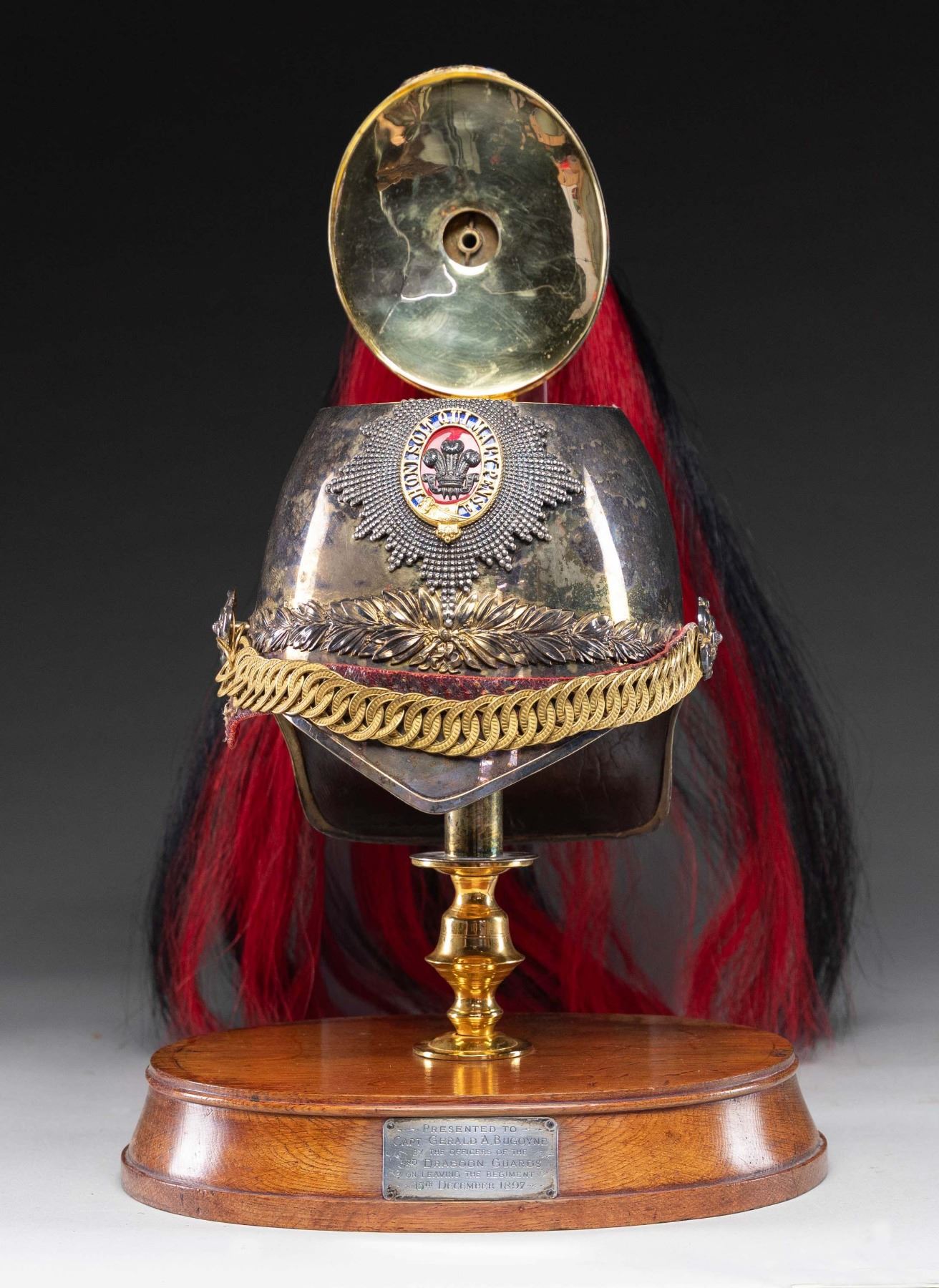 MADE INTO AN ICE BUCKET.This rare British 3rd Dragoon Guards, also known as "The Prince of Wales Own", officer's dress helmet is of the 1871 style and features an enameled central helmet plate showing the Prince of Wales plumes within a garter that reads "HONI SOIT QUI MALY PENSE" mounted on a faceted star backing plate. Large gilded laurel leaf spray to the lower center and backstrap. Large rosette side bosses with gold linked chin chain. Spike base with a large fluted socket that holds the black and red officer's horsehair plume with a gilded rosette on the top. This helmet has been remanufactured by a skilled craftsman into a presentation ice bucket. The interior of the bucket has a gold wash and sits on a gilded brass pedestal with a wooden base. The wooden base has a silver presentation plaque that reads "PRESENTED TO CAPT. GERALD A. BUGOYNE BY THE OFFICER'S OF THE 3RD DRAGOON GUARDS ON LEAVING THE REGIMENT 15TH DECEMBER 1897". CONDITION: both the helmet and base show light wear overall and have an inspiring visual presence. (02-25850/BF). NON-GUN. $2,000-3,000.