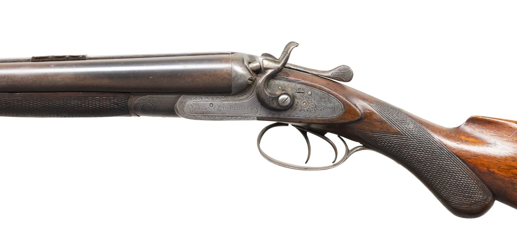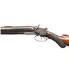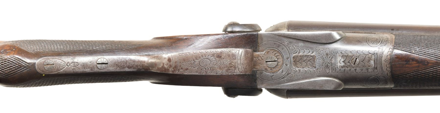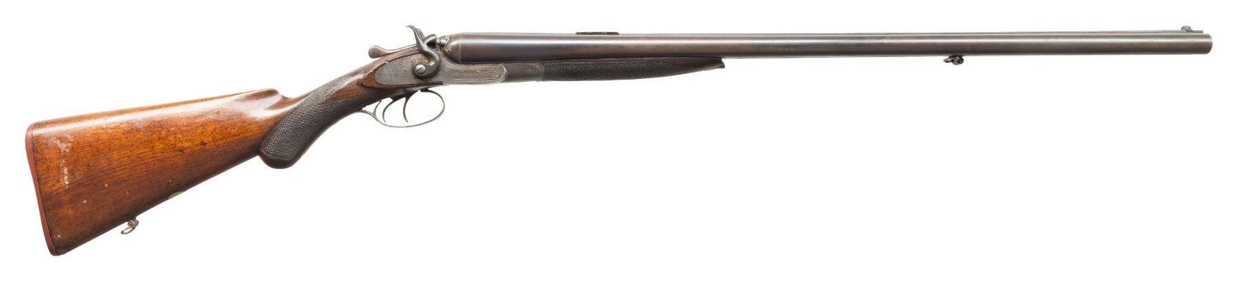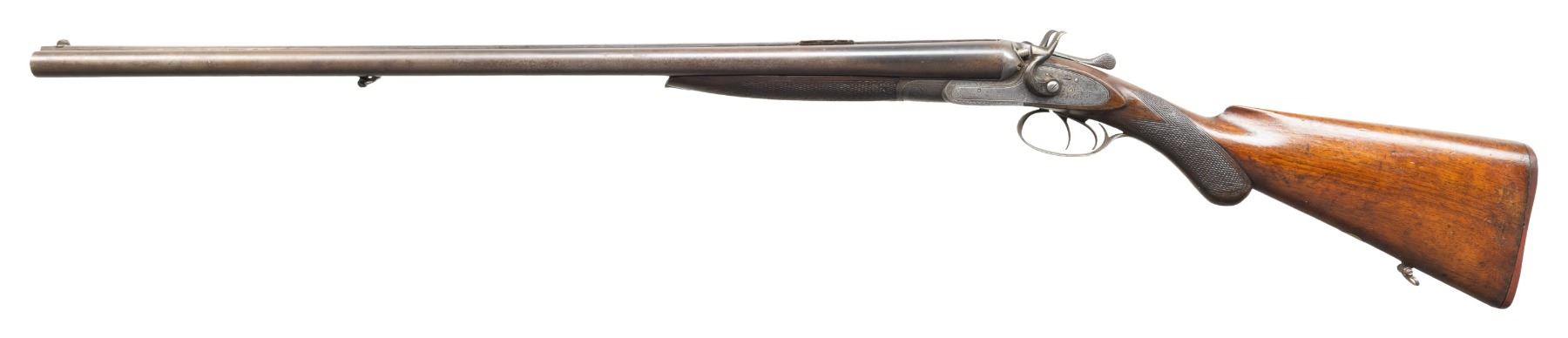 Cal. 40 x 12 Gauge. S# 42526. Bbls. 28" w/ London address on rib & pre-1887 Birmingham proofs on water table; "A.A.B." barrel maker proof. Blade front sight & 3 leaf express rear sight. Bottom rib has added sling swivel. Action has "No. 3718 1877" patent proof on water table; features dbl. triggers, extractors & rebounding hammers. Locks show light engraving that extends to bottom & triggerguard. Walnut stock set. Forearm has Patent 2323 stamp, matching number & horn forearm tip. Rnd. knob walnut buttstock w/ swivel, German silver name plate; LOP: 13" to replacement red pad. CONDITION: barrel has mix of fading blue finish with brown/gray patina showing scattered spots of corrosion & light marks. Action ahs faded case colors to brown patina showing spots of oxidation. Wood shows areas of worn finish, cracks, blistering finish on toeline & dings. Left rifled bore shows light pitting with strong appearing lands. Smoothbore shows pitting throughout. PROVENANCE: Estate of Groves Herrick. (01-28891/MD). ANTIQUE. $500-800.