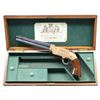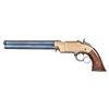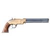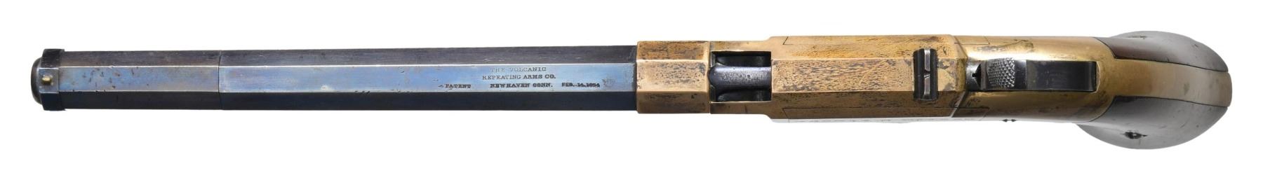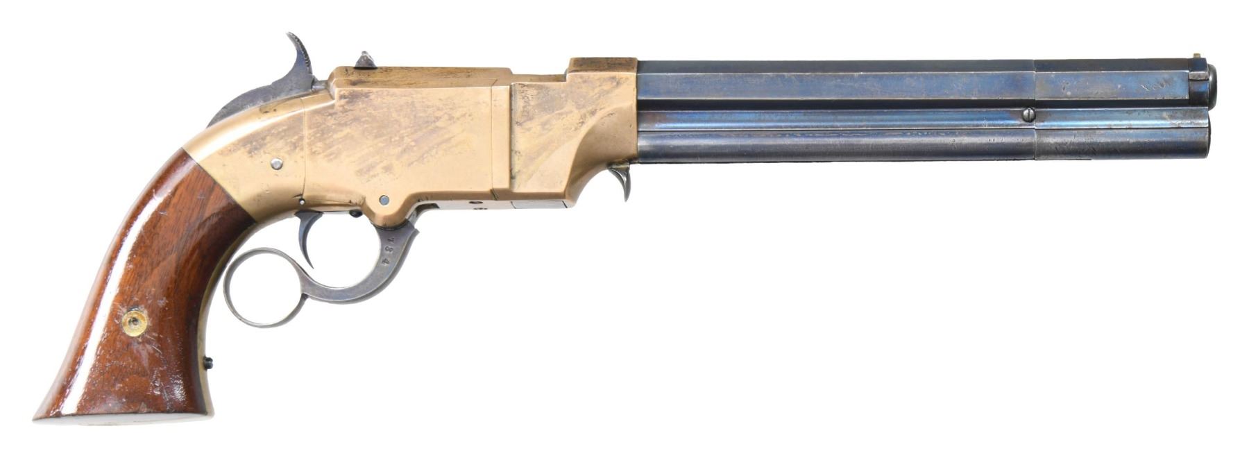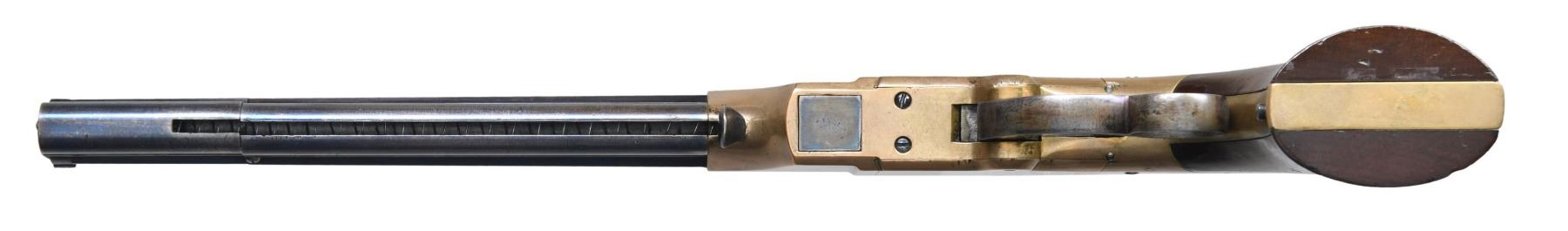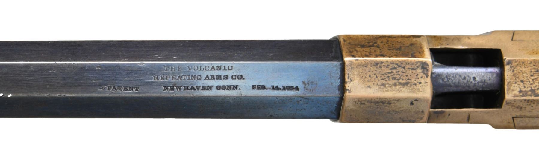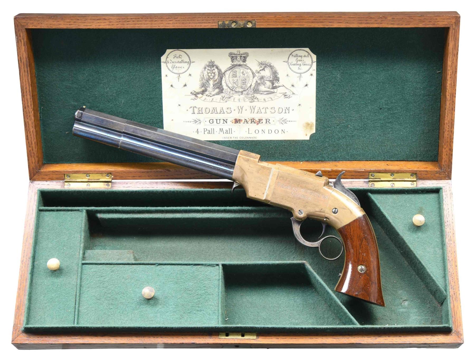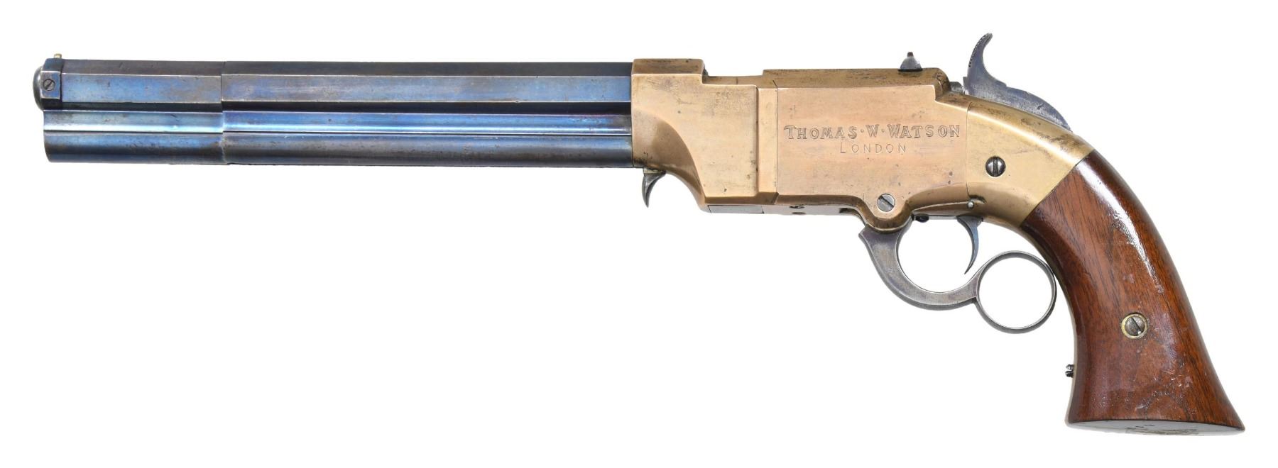LEVER ACTION PISTOL. Cal. 41. S# 734. Pistol is in standard configuration with blued 8" octagonal barrel, integral spring loaded magazine, fixed notch rear sight, pinched post front sight, brass frame, varnished walnut grips. Made to shoot self-contained "rocket ball" cartridges with powder & primer contained in conical ball. Manufactured between 1855-1857 after formation of Volcanic Arms Company from Smith & Wesson sold their interests to investors including Oliver Winchester. Barrel markings: "THE VOLCANIC ARMS CO. / NEW HAVEN CONN / PATENT FEB 14 1854" on top flat. This gun in English oak case with "Thomas W Watson" London label pasted inside lid. The gun is later engraved on left side of frame "THOMAS W WATSON / LONDON". CONDITION: fine as refinished, barrel retains most of its reblued finish, address marking very good, retains most all varnished finish to grips, mechanically fine, sharp rifled bore. Casing is very good, complete label, green baize lining worn and soiled where pistol rubbed at muzzle, a British flag engraved on brass plaque on lid. (01-26763/JS). ANTIQUE. $4,000-6,000.