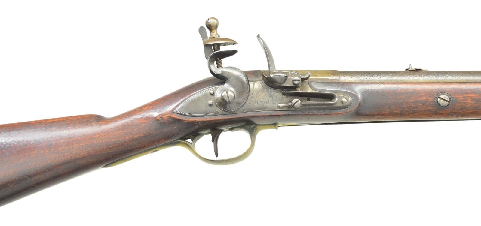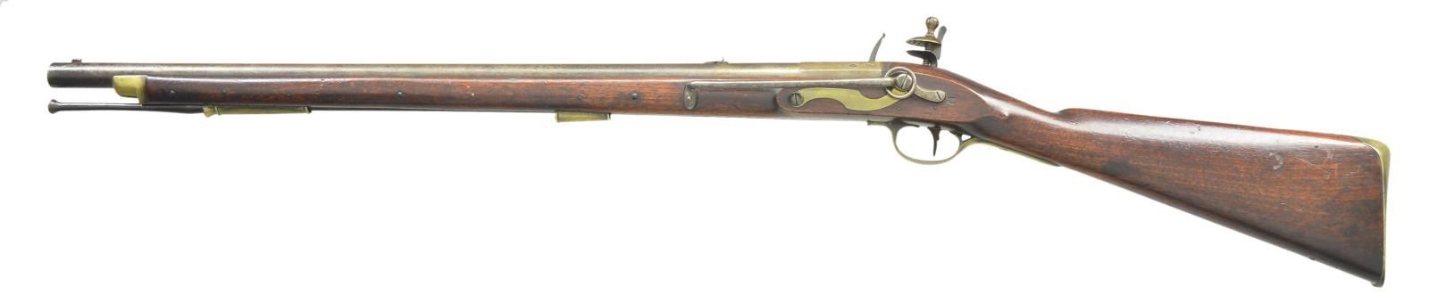 FLINTLOCK SHORT RIFLE BY H. NOCK. Cal. 69 (7 groove rifling, muzzle counterbored 4"). S# 14. A large number of military type rifles were made up during the period 1800-1840 for issue to privately raised militias, constabularies, etc. Some followed normal British standard many others did not. This interesting short rifle has 28" barrel with 3" octagonal breech section stamped "LONDON" on top flat, which is also engraved with rack number "No. 14". London commercial type black powder proofs are on top left flat. Barrels are fitted with "U" notch rear and bead front sights. There is no provision for mounting a bayonet. Lock of early style with rounded plate is fitted with serpentine cock, integral rounded pan, bridled friction frizzen and feather spring with dog nose finial. Lock has double line border engraving and "H. NOCK" is in center. (Henry Nock died in 1804). Turn of the 19th century style straight grip stock is brass mounted. Buttplate has 2 1/2" rounded return. Sideplate is of 1813 Baker rifle style. Trigger guard is also late style with truncated finial to accept large caliber ramrod. 1800 type ramrod pipes hold steel ramrod with large retaining swell and brass cap. Ramrod channel is of later type and is open to trigger guard finial. A saddle ring bar on left side is of 1813 type with teardrop secondary attachment at rear, front attachment differs from standard in having a pendular attachment point allowing bar to sit higher along barrel. Stock is pinned to barrel and has brass cap which ends 2 1/2" from muzzle. Stock is marked with acceptance initials "JC" behind sling bar mount. Trigger guard bow is engraved "C" "YC" (Cobham Yeomanry Calvary). An almost identical rifle is in the Royal Armouries Study Collection also by Nock. It's provenance is Cobham Hall, July 1957, Kent sale. The Royal Armouries estimates a manufacturing date of 1799. CONDITION: very good to fine. Barrel and lock show considerable old cleaning to gray brown over some fairly deep pitting. Marks remain clear. Stock retains most of what appears to be its original oil finish with a fair number of marks and dings. Brass is nicely toned. Bore is very fine, shiny with one or two minor pits. Lock is fine. A very interesting British flintlock rifle. (01-22256/MGM). ANTIQUE. $3,000-5,000.