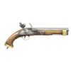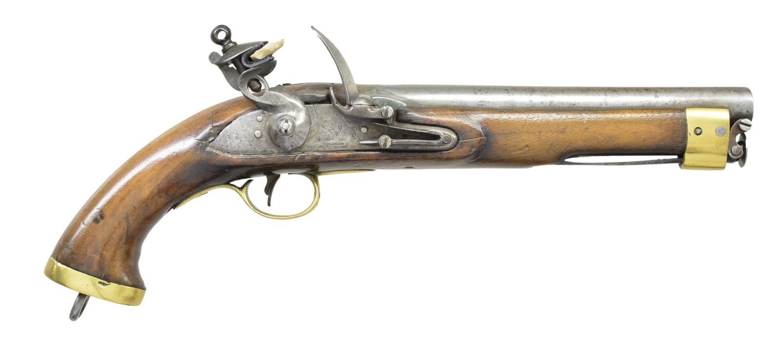 FLINTLOCK PISTOL. Cal. 65. NSN. Bbl. 9" round w/ smoothbore. Breech end of bbl. has London black powder proof & view marks. Lock is marked w/ the British East India Company trademark lion. Walnut stock has brass nose cap, side plate & flat butt cap w/ lanyard ring. Iron swivel ramrod. CONDITION: metal has heavily worn cleaned gray appearance w/ scattered light pitting. Left side of bbl. has added ID number partially covered by the stock. Refinished stock shows heavy wear w/ cracks & chips in lock, side plate & forearm areas. Functioning lock w/ stiff spring tension. Dark pitted bore. (01-23059/DS). ANTIQUE. $700-1,000.