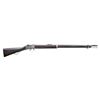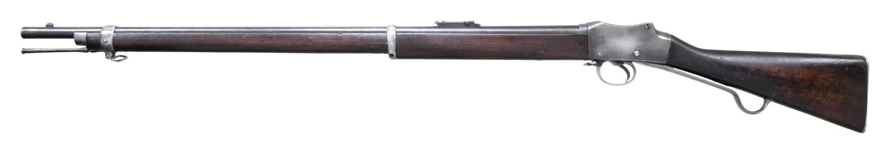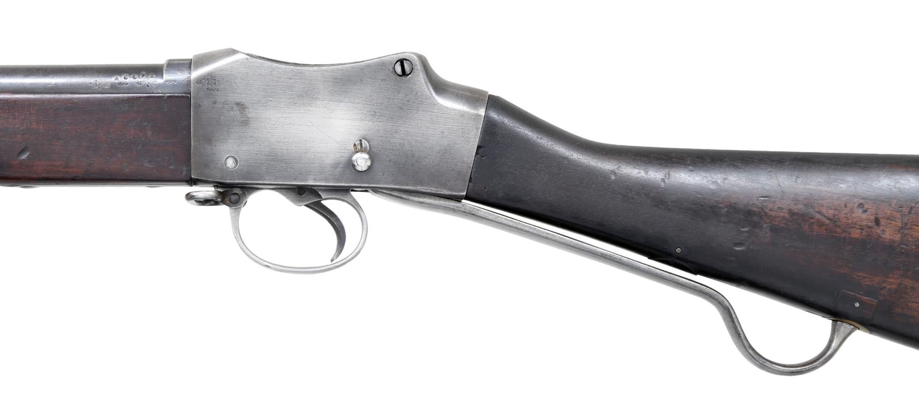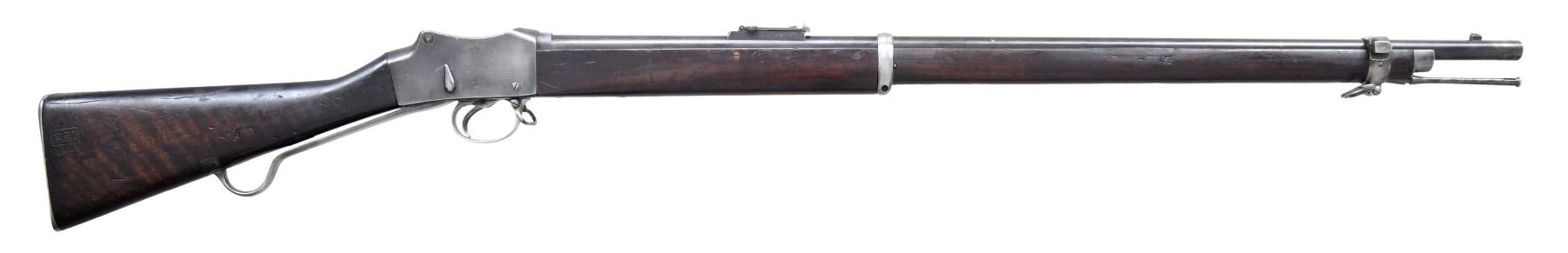 RIFLE. Cal. 577/450 Martini. S# A6471. Bbl. 33". Blade front sight. Ladder rear sight graduated to 1300yds. Rifle was updated from short lever to long lever configuration. Right side of action has crown, "VR ENFIELD", 1887 & "IV/1" markings. Left side of bbl. has serial & British proofs. Blued finish. Hardwood stock set with bottom mounted sling swivels. Right side of butt has varied Nepalese markings such as "RP/1908" & a roundel with Nepalese script. CONDITION: stock set has a dark appearance with a few armorer patch repairs, some chips, scattered dings, scratches & handling marks. Bands, nosecap, lever & trigger guard all cleaned to bright with pitting, oxidation & dings. Receiver & bbl. turning gray with strong traces of arsenal blue, edge wear, dings & moderate oxidation. Action functions properly when hand cycled. Good bright bore with some light pitting. (01-27202/MJC). ANTIQUE. $300-500.