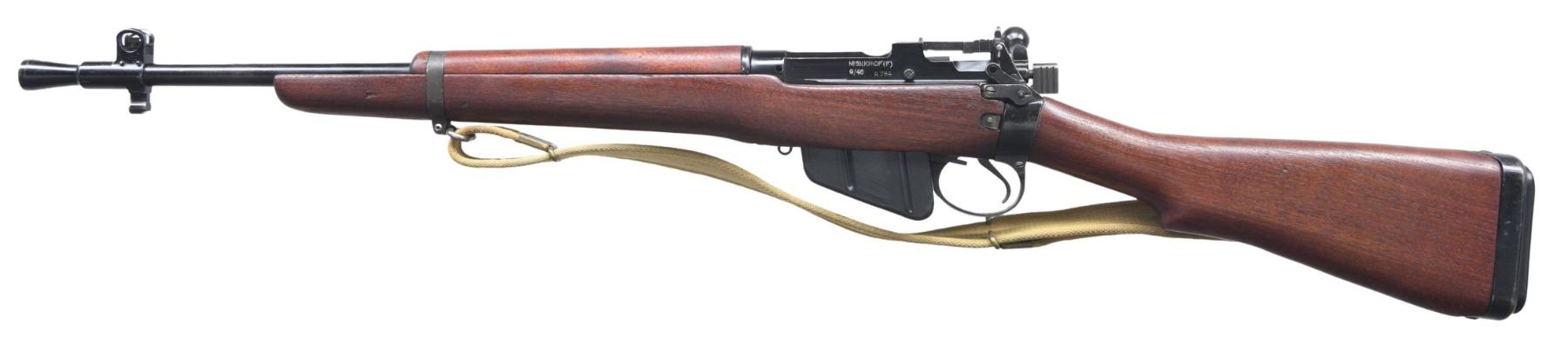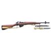 Cal. 303 British. S# R784. Serial number matches on receiver and bolt. Bbl. 20 5/8", including flash hider. Receiver is marked on left rail in electro-pencil "NO5 MKI ROF(F) / 9 / 45" and serial number. Receiver ring marked on right side with "ENGLAND." Rifle has all the correct features for the NO5 rifle, including the lightning cut at the rear of the receiver, the right receiver rail with no mag. cutoff boss, a hollow bolt knob, and a lightened trigger guard. Adj. rear sight graduated to 800 yards. Blade front sight with protective ears mounted on flash hider and bayonet lug assembly. Unmarked walnut buttstock and forend. Handguard is stained hardwood. Buttplate equipped with rubber recoil pad and sling bar. Correct tan web sling. MAGS: one detachable 10 rd replacement. UNATTACHED ACCESSORIES: 8" fullered blade bayonet marked on right ricasso "R.I.". Smooth hardwood grips. Steel scabbard with green web frog. Bayonet is in very good condition, with most of its original finish. Scabbard has a worn, flaking black finish. Frog is stained but serviceable. CONDITION: replacement stock set has light wear and scattered small handling marks. Metal retains an 80% black finish with light flaking and wear. Very good, shiny bore. PROVENANCE: from the collection of Mark Ivey Godfrey. (24-5282/RW). CURIO. $600-900.