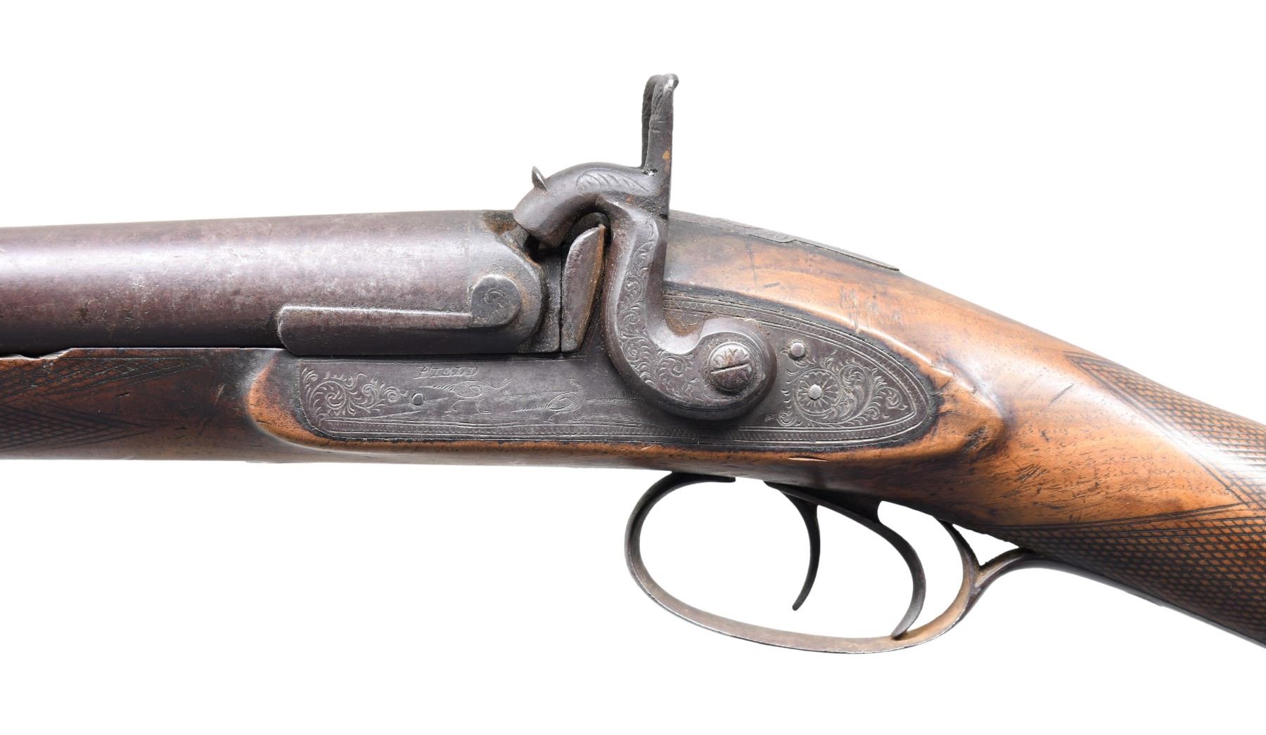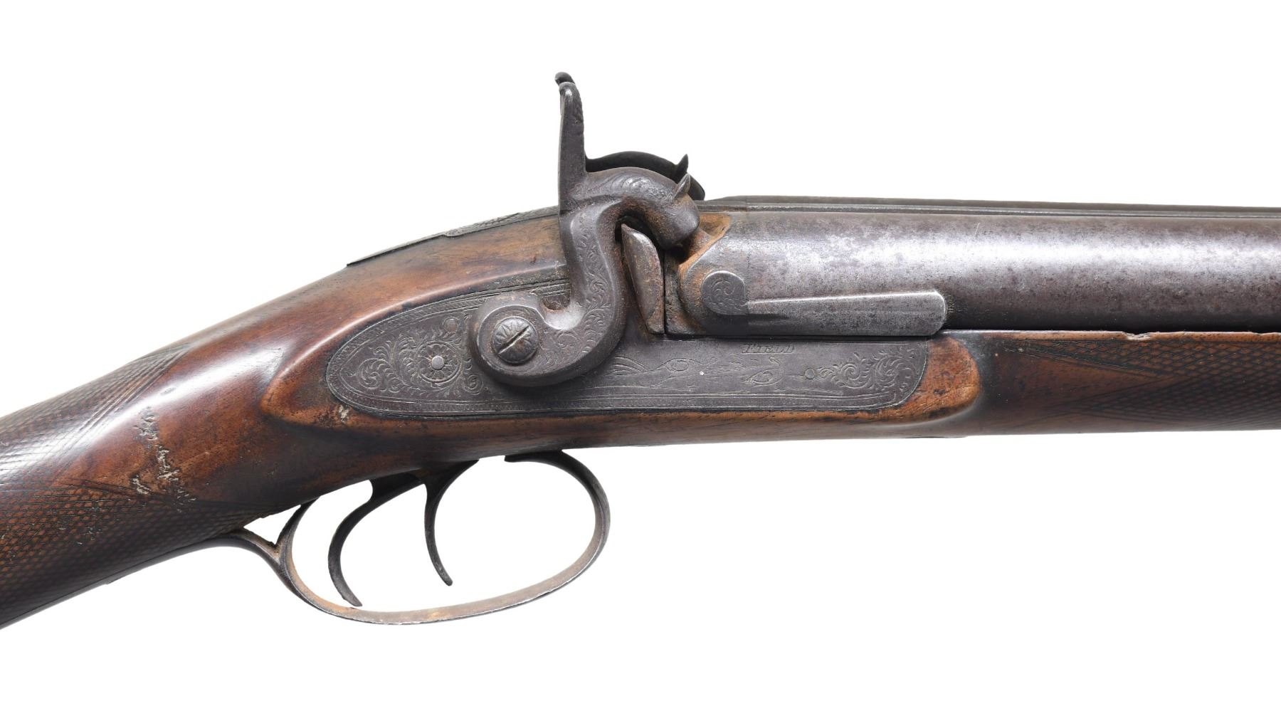 Cal. 12 Ga. NSN. London Laminated Steel 29" bbls. having Birmingham "14" proofs. Bore chokes measure approx. Full & Mod. Engraved locks marked "FIELD" w/ scroll & pheasants. Double triggers. Wedge fastened straight grip checkered walnut stock w/ engraved iron furniture, brass toeline shield plate & hardwood ramrod. CONDITION: metal has brown/gray patina appearance with spots of corrosion. Heavily worn stock shows smoothened checkering, large gouges on forearm & sm. chips along barrel channel. Pitted bores. Locks appear functional. (01-27226/MD). ANTIQUE. $150-250.