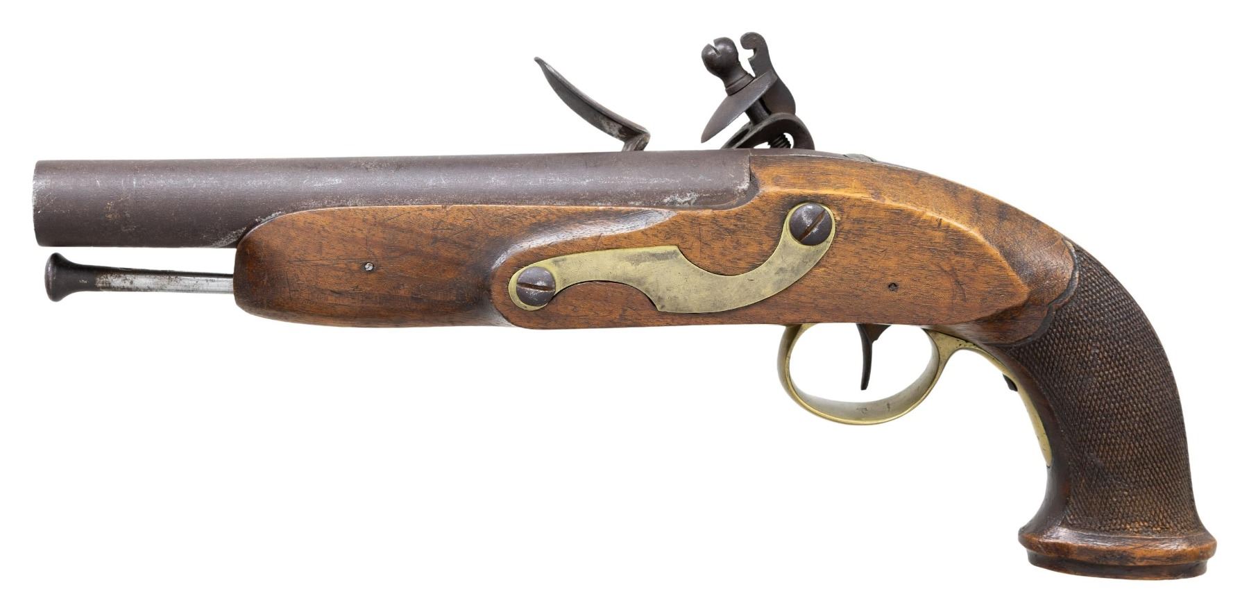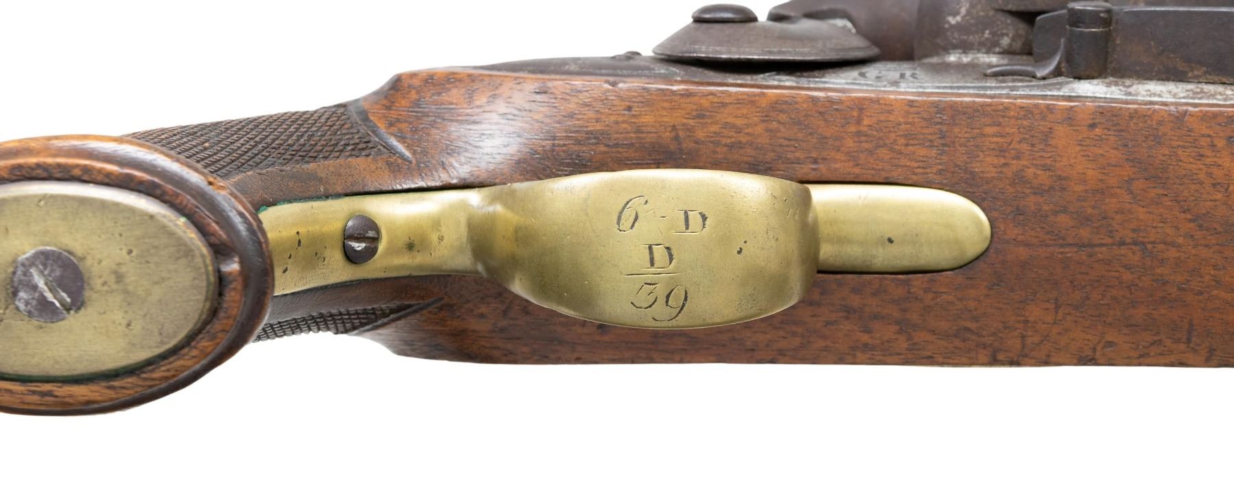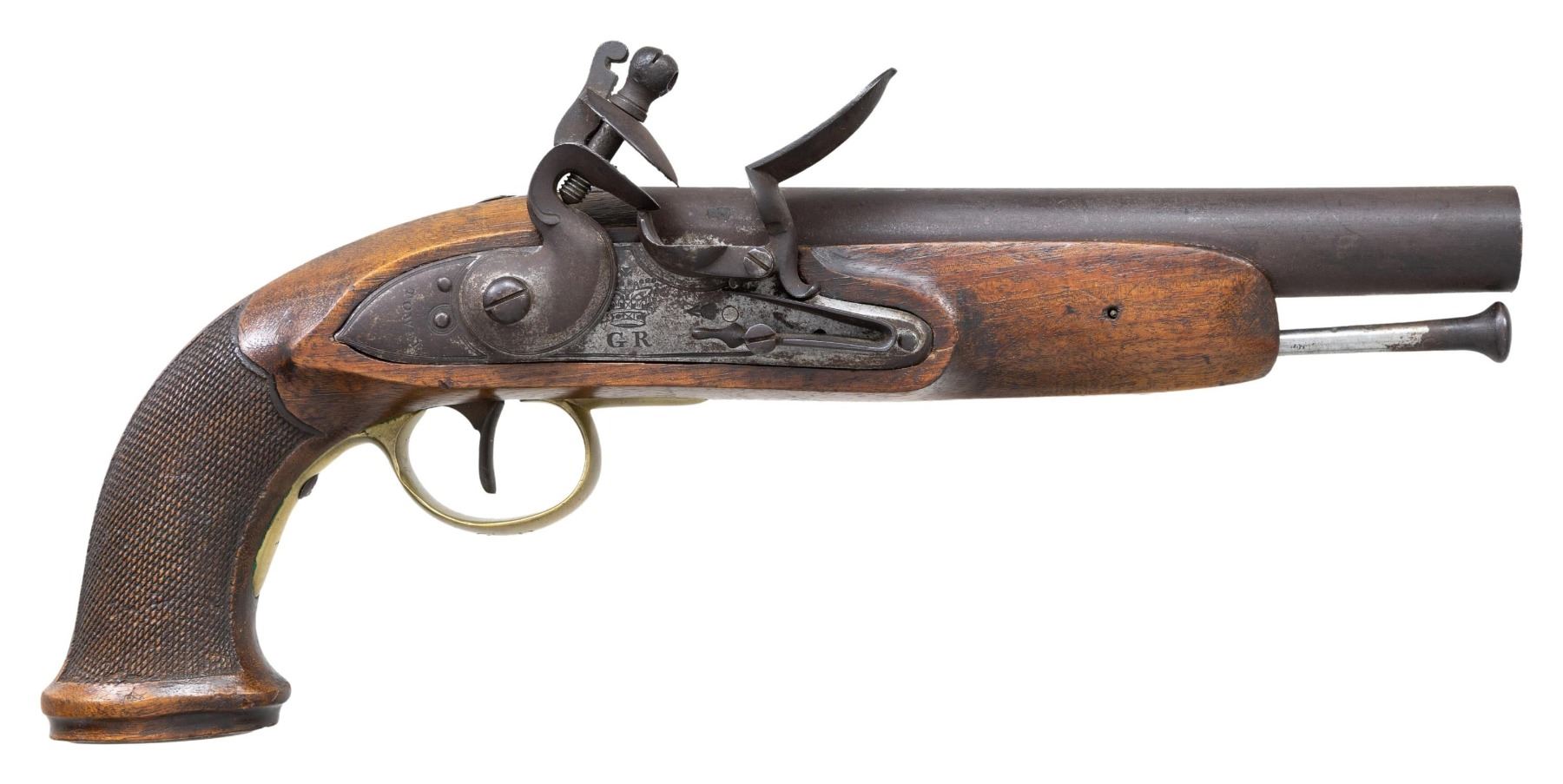 Cal. 76. NSN. 13.5"Overall, 7.8" tapered round barrel, proofed on top at breech, "GR" cyphered military lock palte with broad arrow proof, checkered walnut stock, flat brass butt cap. CONDITION: very good as configured, iron and brass patina, sharp raised grain walnut stock, mechanics fine, clear clean smooth bore. PROVENANCE: Estate Collection of Nicholas Apergis. (01-27427/JS). ANTIQUE. $1,000-1,500.