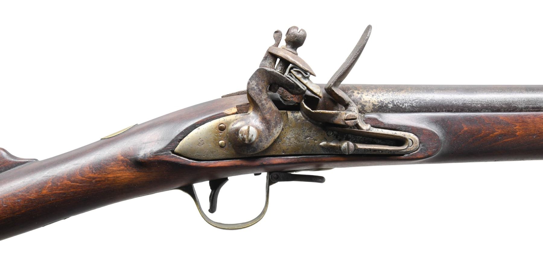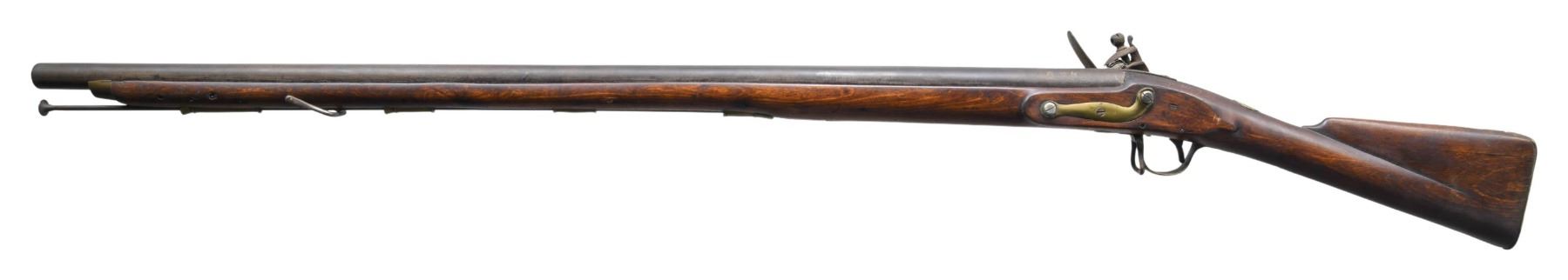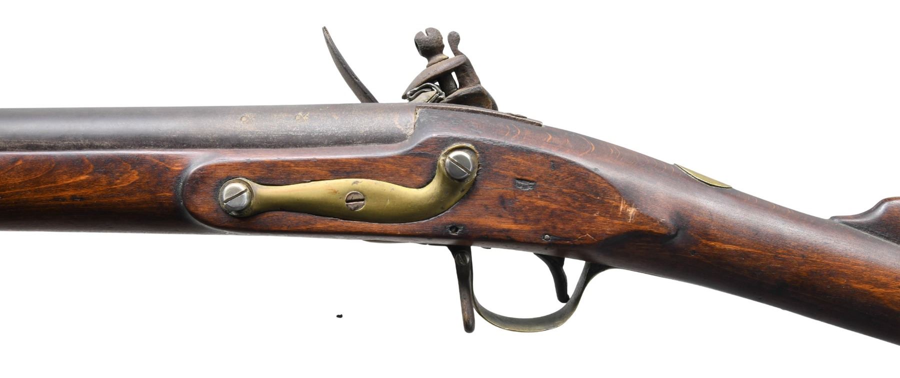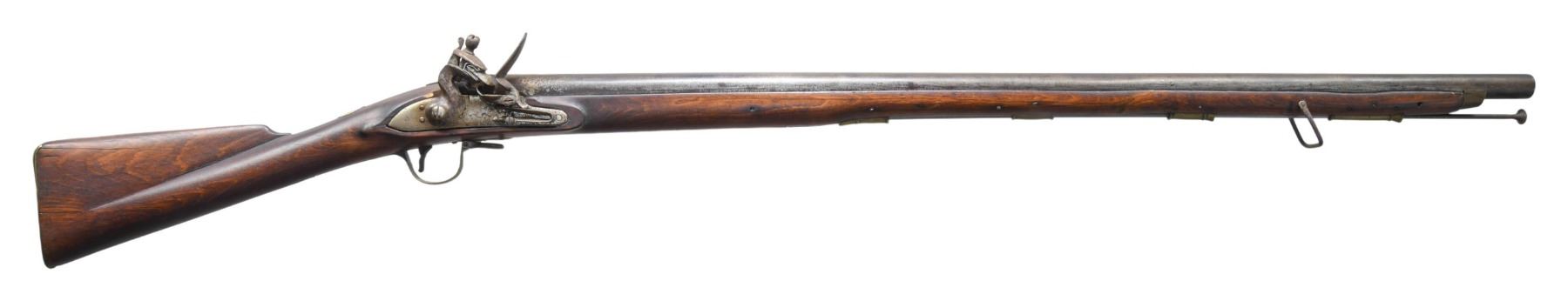 Cal. 80. NSN. Bbl. 38". Left side of bbl. at the breech has 2 crown over crossed scepters view marks. Unmarked lock & hammer appear to be replacements. Pin fastened hardwood stock Brass fittings consist of buttplate, oval wrist plate, trigger guard, sideplate, nose cap thimble & 3 pipes, forward 2 pipes are wide mouthed. Button tipped iron ramrod. CONDITION: metal has a cleaned appearance with pitting heaviest in the breech & lock areas. Sanded & refinished stock has repaired cracks in the comb & forend areas with chips along the bbl. channel. There is a lage area of wood missing above the lock and a small added wood repair behind the thimble. Lock lacks spring tension. Dark pitted bore. PROVENANCE: Estate of Russell Dickerman. (01-27143/DS). ANTIQUE. $800-1,200.