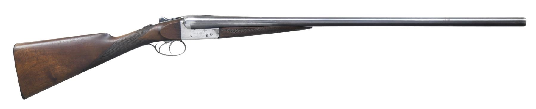 GAME GUN. Cal. 12 Ga., 2 3/4". S# 15907. The 28" dovetail lump barrels have concave swamped game rib with address "JOSEPH LANG & SON, 102 NEW BOND STREET, LONDON". Water tables show Birmingham Nitro proofs & import mark. Full & IC fixed chokes. Boxlock action with "JOSEPH LANG & SONS" on sides with matching S# on triggerguard tang. Action features double triggers, interchangeable firing pin bushings, ejectors & top tang safety. Checkered walnut forearm with push button release at top & matching numbered iron. Checkered straight grip walnut stock. LOP: 13" to groove hard rubber buttplate. CONDITION: barrels have fading blue mixing with gray patina showing in protected areas along with scattered scratches, light pitting along barrel channels of forearm area & peppery oxidation throughout. Action has cleaned bright appearance with areas of pitting & peppery oxidation. Triggerguard bow & tang tip has traces of blue showing hand wear. Wood has fair overall worn appearance with worn checkering spots in wrist & mildew throughout. Good buttplate with marks & oxidation to screw. Bores show shine with fouling. Minute gap to of barrels to action at corner of breech face. (24-6956/MD). CURIO. $300-500.