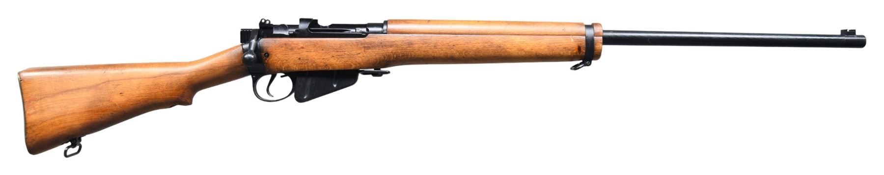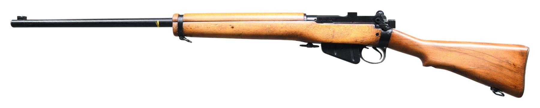 Cal. 308 Win. S# A915. Bbl. 27 1/2" with GEMCO import marking. No sights present. Matching numbers on forend, bolt & receiver. Other visible parts are unnumbered. British No. 4 Enfield style target rifle similar to an L42A1 sniper rifle but without a scope. This model rifle was used in British military competitions. Left side receiver screw & stock oiler are missing. Left side of receiver has "7.62mm L39A1/U.E.70" markings. Beech stock set with bottom mounted sling swivels. MAGS: 1-10 rd. CONDITION: stock set shows some dings & handling marks. Metal retains 95-97% Suncorite with some yellow paint splatter on bbl., some handling marks & flaking. Action functions properly when hand cycled. Bright near excellent bore. (25-2742/MJC). CURIO. $800-1200.