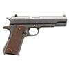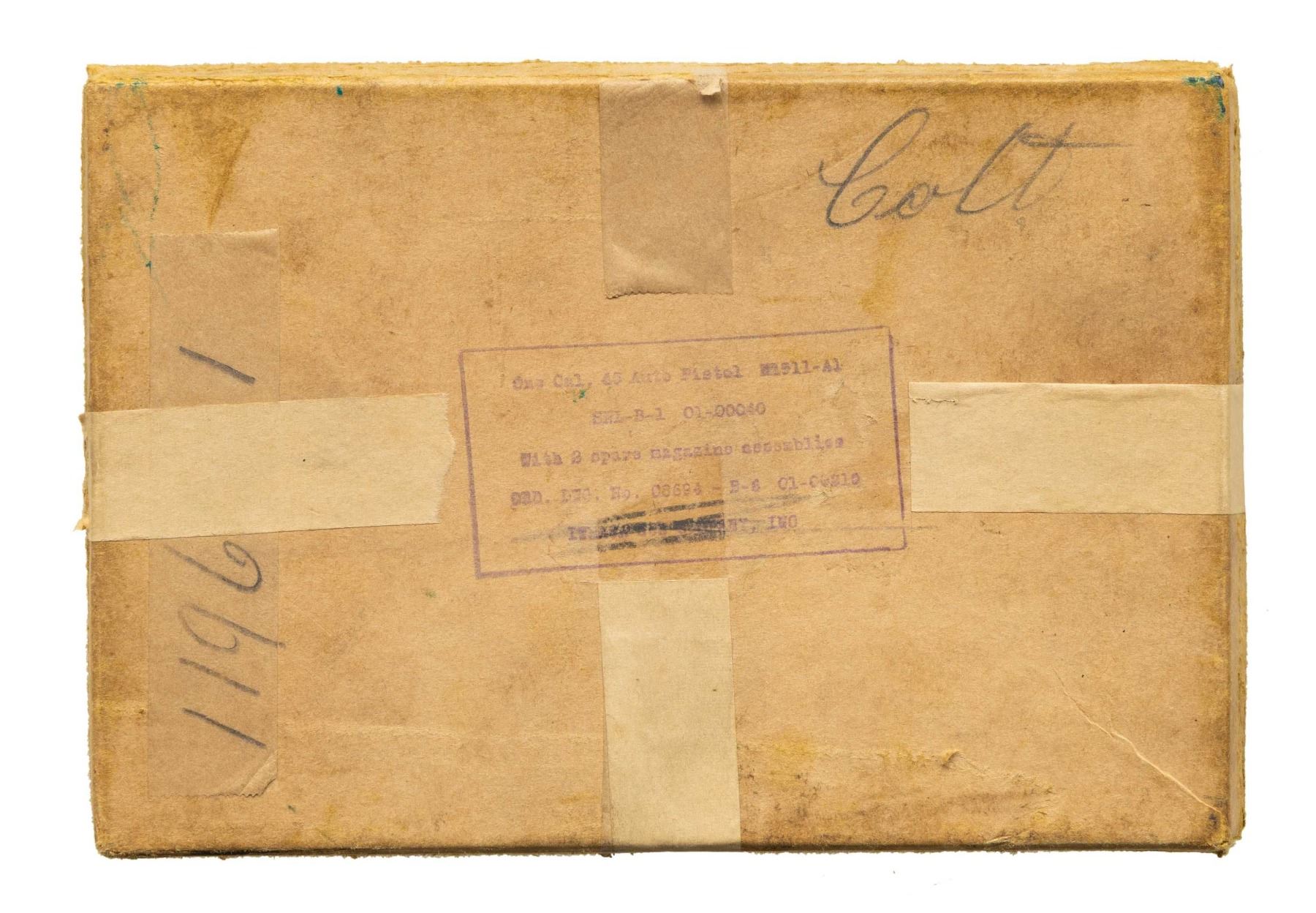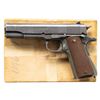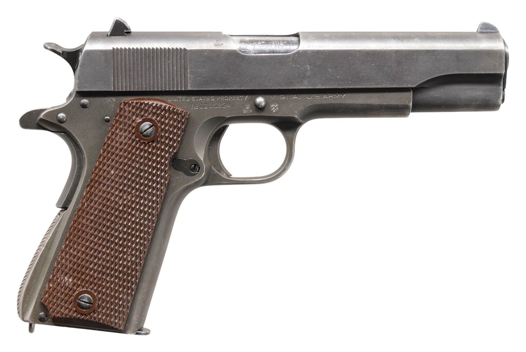 Cal. 45 ACP. S# 1135234. Mfg. 1943 within S# range 1096405-1208673. This pistol was sent to Great Britain as Lend Lease aid as evident by British proofs on Colt 5" barrel & frame. This pistol was most correct era parts including Coltwood grips; replacement tall blade front sight & rear sight. MAGS: 1 M.S. Little 7 rd. mag. UNATTACHED ACCESSORIES: US M1912 brown leather holster in worn condition. Ithaca Gun Company M1911-A1 box crossed out for Ithaca & pencil marked "Colt" along with 5 digits for a different S#. The box is in fair condition showing stains, tears & creases. CONDITION: pistol has good original parkerized finish showing wear, marks & spots of patina. Very good grips. Very good original barrel blue having very good rifling showing light frosting in the grooves. (25-5384/MD). CURIO. $1,750-2,500
