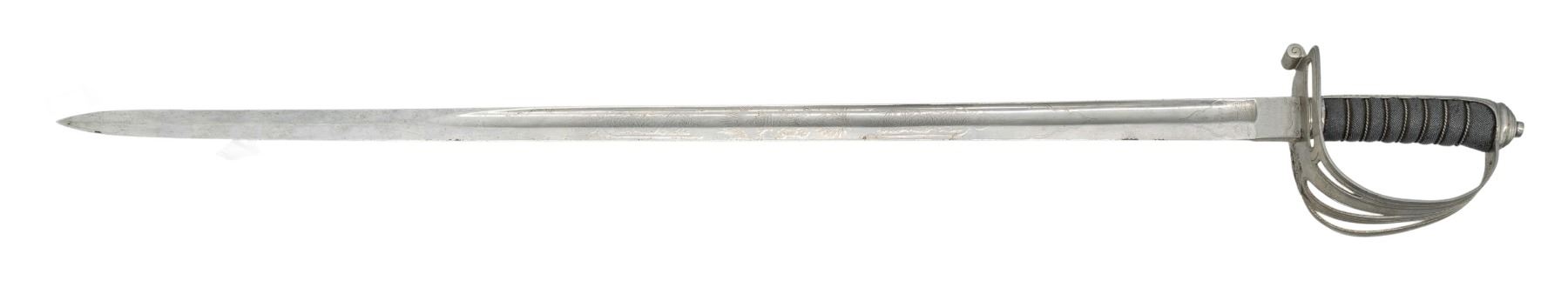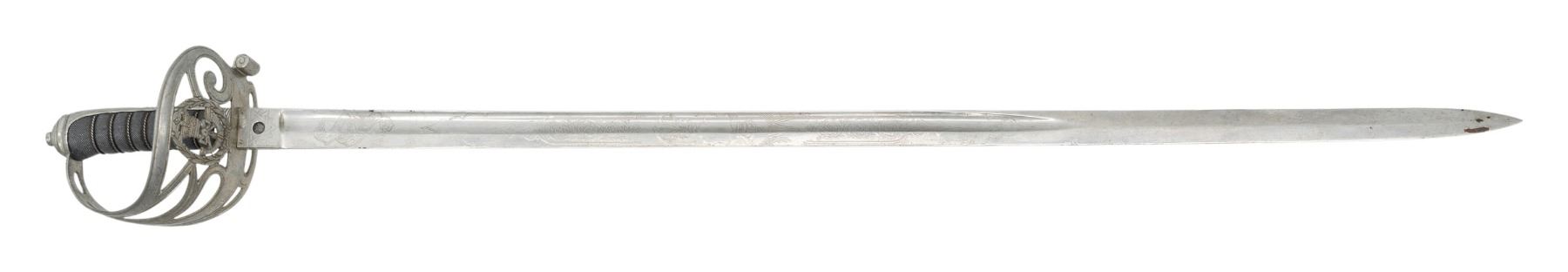 A nice British volunteer rifles of the M1827 form measuring 38 1/4" overall with an etched blade that shows foliate motifs, crowned VR, and a crowned horn. The blade's ricasso is marked "WILKINSON PALL MALL LONDON". Silvered 4 branch hilt with a crowned horn in the pierced guard. Wire wrapped shark skin grip. No scabbard. CONDITION: blade has a light gray patina. Hilt shows substantial original silvered finish. Grip solid. PROVENANCE: From the PMRB Collection. (02-25855/BF). NON-GUN. $300-500.