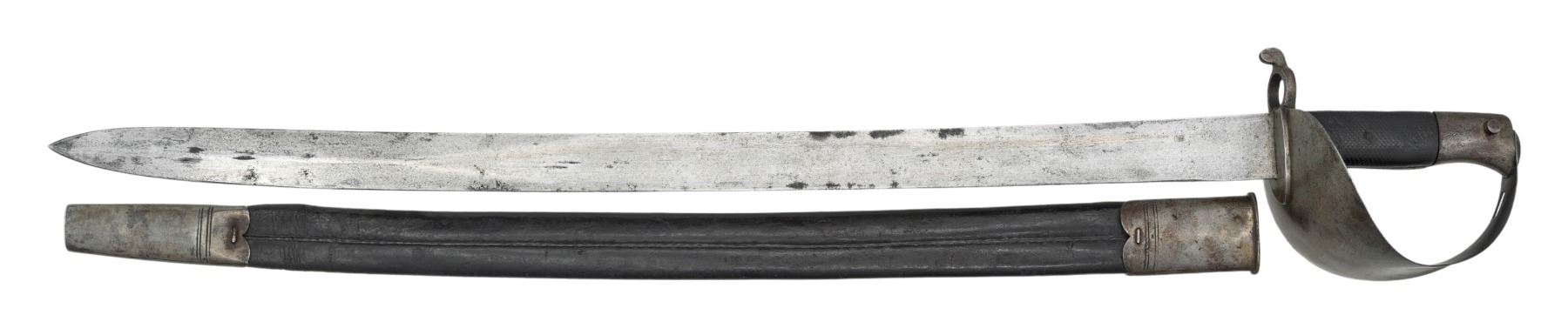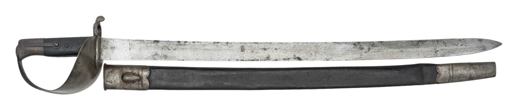 A good example of a British M1859 cutlass bayonet for the Navy measuring 33" overall with a plain blade marked with a king's head for Gebruder Weyersberg. This firm is known to have produced arms for Britain as well as America. The blade also has various proof marks on the flat and the spine. Steel hilt with a semi-cupped guard. Steel muzzle ring and spring / slot assembly. Two piece leather grips an a steel mounted scabbard. CONDITION: blade has a pleasing gray patina as does the hilt. Scabbard shows wear and has shrunk just a bit. PROVENANCE: From the PMRB Collection. (02-25853/BF). NON-GUN. $400-600.