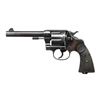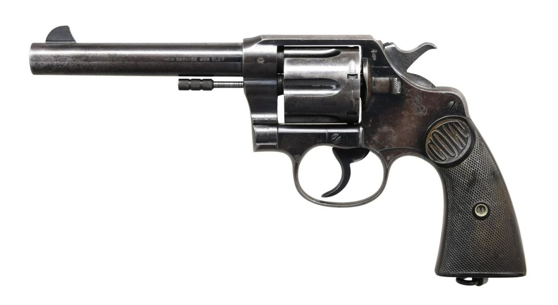 Cal. 455 Eley. S# 94530. Bbl. 5 1/2". Blade front sight. Fixed rear sight. Mfg. 1916. Blued finish. The main spring is a replacement. The left side of the revolver has various British proofs. Cyl. appears to fit both the 455 Eley and the 45 Long Colt. Checkered black Colt grips, with the right panel having a matching penciled number twice and the name "Meredith." A lanyard ring is present on the bottom of the grip frame. CONDITION: right grip panel shows a crack on the bottom; grips otherwise show overall flattening to checkering, some chips, and dirt staining. Metal retains 20% of its blue with overall fading to gray, some scattered oxidation, and a few areas of pitting. Very good bore. PROVENANCE: from the lifelong collection of Robert "Mike" Bricker. (24-1123/MJC). CURIO. $350-550.