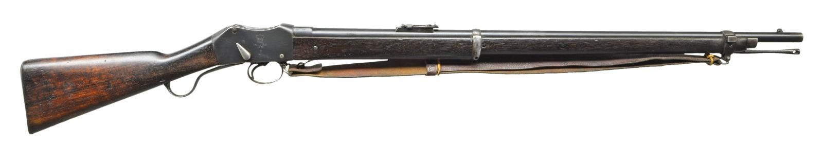 SHOT MILITARY RIFLE. Cal. 577/450. NSN. Bbl. 33 1/4". Ladder rear sight graduated to 1200 yards. Inverted V stud type front sight. Interesting early short lever Martini-Henry rifle. Mfg. by BSA in England. The rifle carries both British & Nepalese markings & predates the Zulu wars. Receiver is marked on right side w/ a crown, “V.R.”, “BSA & M.CO”, “1876” & “Crown Arrow II.”. Left side of receiver & bbl. have numerous view marks plus broad arrow & WD. Left side of bbl. below rear sight marked “N.S. NEP” which internet research indicates stands for “Native States” which were countries near the British Raj known to receive arms from the British. “NEP” is likely Nepal. 2 Piece walnut stock set. Forend is fastened by 2 bands. Upper band has bayonet lug. Original cleaning rod is present. Buttstock is marked on the right side. (Markings appear to be Nepalese, 94 & AC over 28.) Enfield roundel over 1 & II over 1894 roundel “Altahara …?” & “2”. Unmarked vintage brown leather sling w/ rawhide fastening. CONDITON: stock set has moderate wear & handling marks expected in an elderly rifle w/ long service, but retains good appearance & generally clear markings. Metal retains a good degree of early arsenal rework blue w/ thinning & wear turning gray & patina. Good bore w/ very fine pitting throughout. (01-22344/RW). ANTIQUE. $500-800.