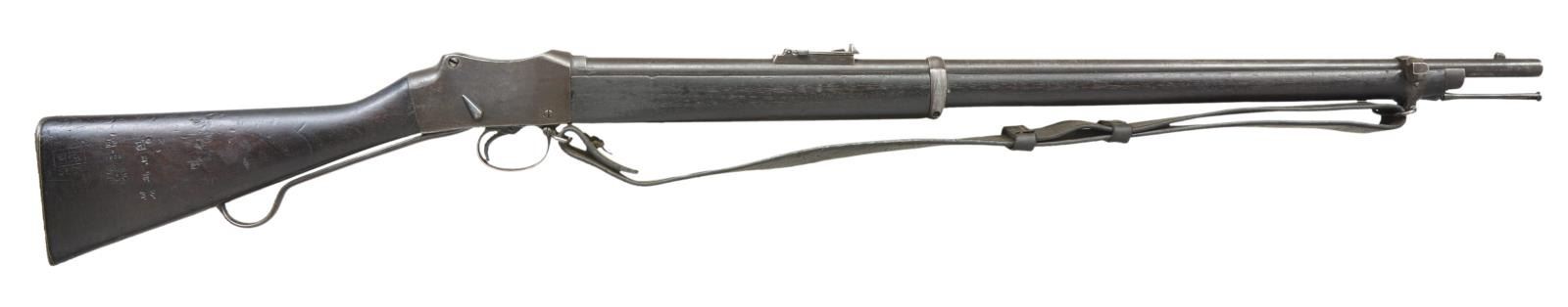 ISSUE MILITARY RIFLE. Cal. 577/450. NSN. Bbl 33". Ladder rear sight graduated to 1300 yards. Stud type inverted V front sight. This Martini-Henry is commonly referred to as a “Long Lever” introduced in 1887 w/ a modified extractor. This rifle was mfg. in Great Britain by Enfield & was later used by Nepal. Receiver is marked on right side w/ crown “V.R.”, “Enfield”, “1887”, crown over vertical arrow, “IV.” & “I.”. Receiver & bbl. have numerous view marks. The broad arrow appears on the lever & cocking indicator. Trigger guard is marked w/ Nepalese characters. Bbl. retained by 2 clamping bands. Upper band has lug for the pattern 1887 bayonet. Cleaning rod is present. 2 piece walnut stock set. Buttstock is marked on right side w/ “R.P.”, “3” & “1908”. Roundel is marked w/ “RAWUL.PINDI”. Buttstock has Nepalese characters & added number “3527”. CONDITON: stock set has moderate wear, staining & handling marks throughout w/ legible markings. Buttstock has approx. 1" crack at heel. Buttstock is slightly loose. Metal has turned overall gray & patina w/ wear, light oxidation & very fine pitting. Bore is turning dark w/ worn rifling. (01-22045/RW). ANTIQUE. $400-600.