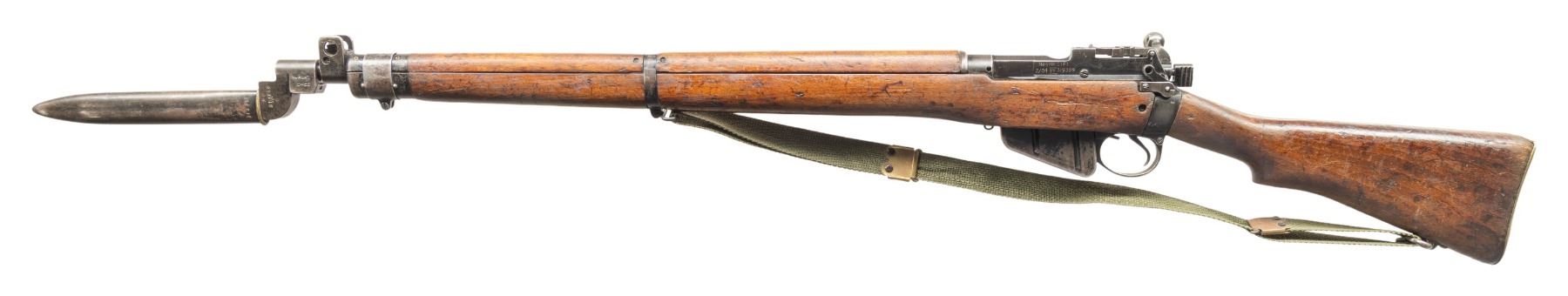 Cal. 303 British. S# PF319399. Bbl. 25 1/2" with import marking. Standard No. 4 sights with ladder aperture rear graduated to 1300yds. All visible matching numbers. Left side of receiver has 2/54 date with No 4 MK2 (F) markings & serial number. Suncorite finish. Hardwood stock set with bottom mounted sling swivels & modern green canvas sling. MAGS: 1-10 rd. matching numbered to rifle. UNATTACHED ACCESSORIES: No9 Mk1 bayonet that matches it's scabbard but not rifle. CONDITION: stock set has added finish with overall finish loss, dings, scratches, handling marks & black staining. Metal retains perhaps 40% Suncorite with overall flaking, some handling marks, edge wear & light oxidation. Action functions properly when hand cycled. Bright near excellent bore. (25-5235/MJC). CURIO. $400-600.