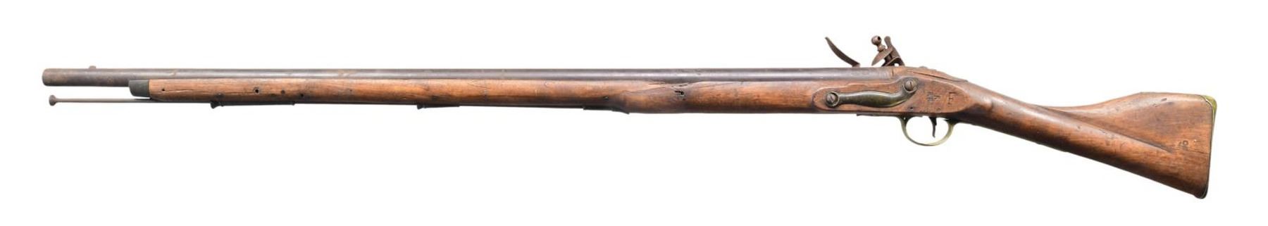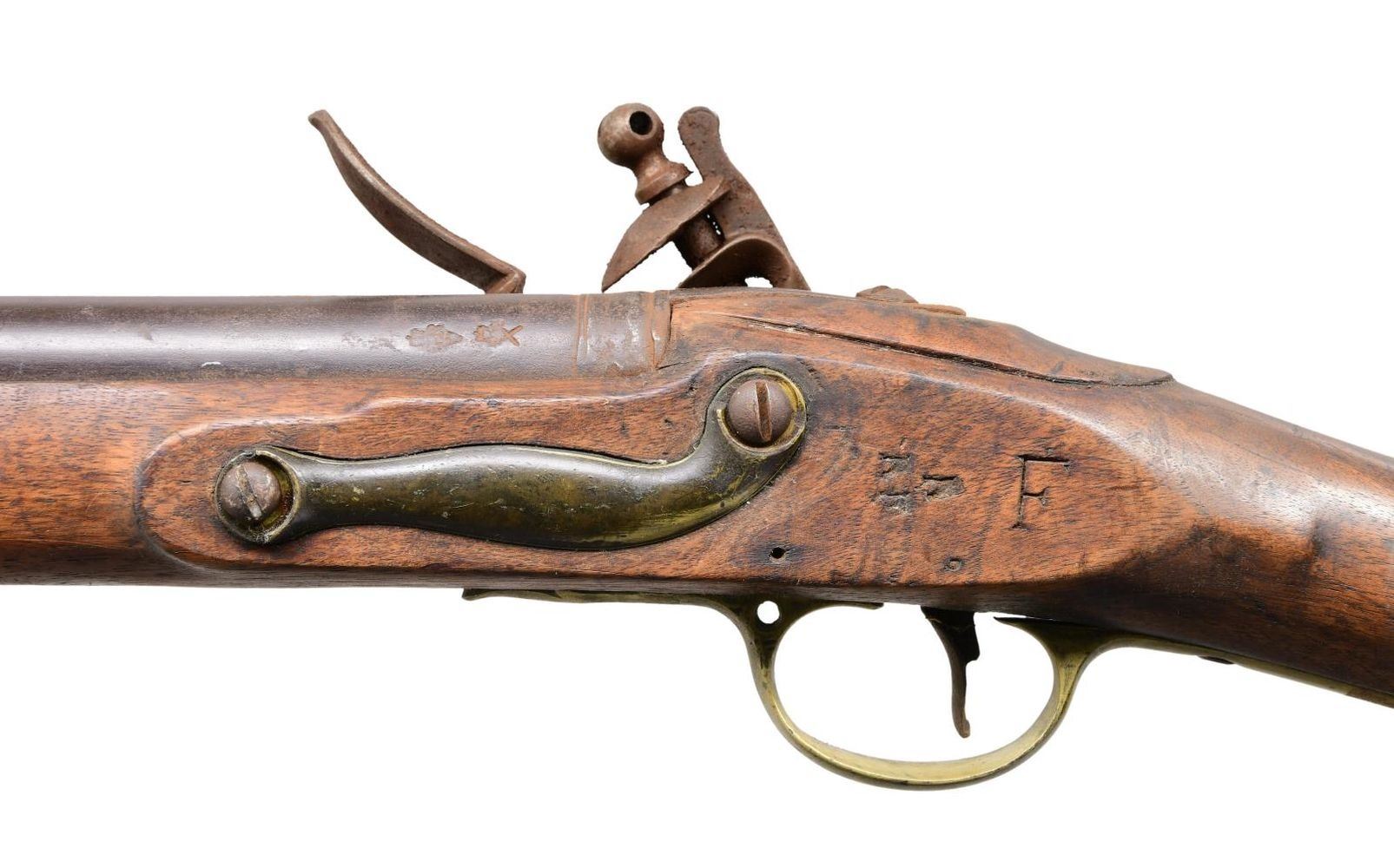 Cal. 76. NSN. Bbl. 39”. The front of the barrel has a low blade sight, and there are government and arsenal proofs near the breech. The lock is marked with a crowned “GR” in front of the cock and a small crowned broad arrow under the pan. The area behind the cock is stamped “TOWER”. Brass trigger guard, buttplate, rounded side plate, barrel thimbles, entry thimble, and nosecap. Iron ramrod appears original. Stock is marked “BO (broad arrow)” at the right cheek. There is an “RF” stamp at the bottom of the butt and behind the side plate. A large “F” was carved into the stock by a soldier behind the side plate. CONDITION: barrel and lock have a dark brown, ancient patina. The markings on the lock are clear and it holds both full and half cock. Brass parts have a rich, pleasing patina. The stock seems like it has seen some sanding at some point in its life, and there are small cracks in the barrel channel. Poor bore. Truly a good, honest attic condition pattern 1793 musket. (01-24648/BF). ANTIQUE. $800-1,200.