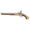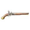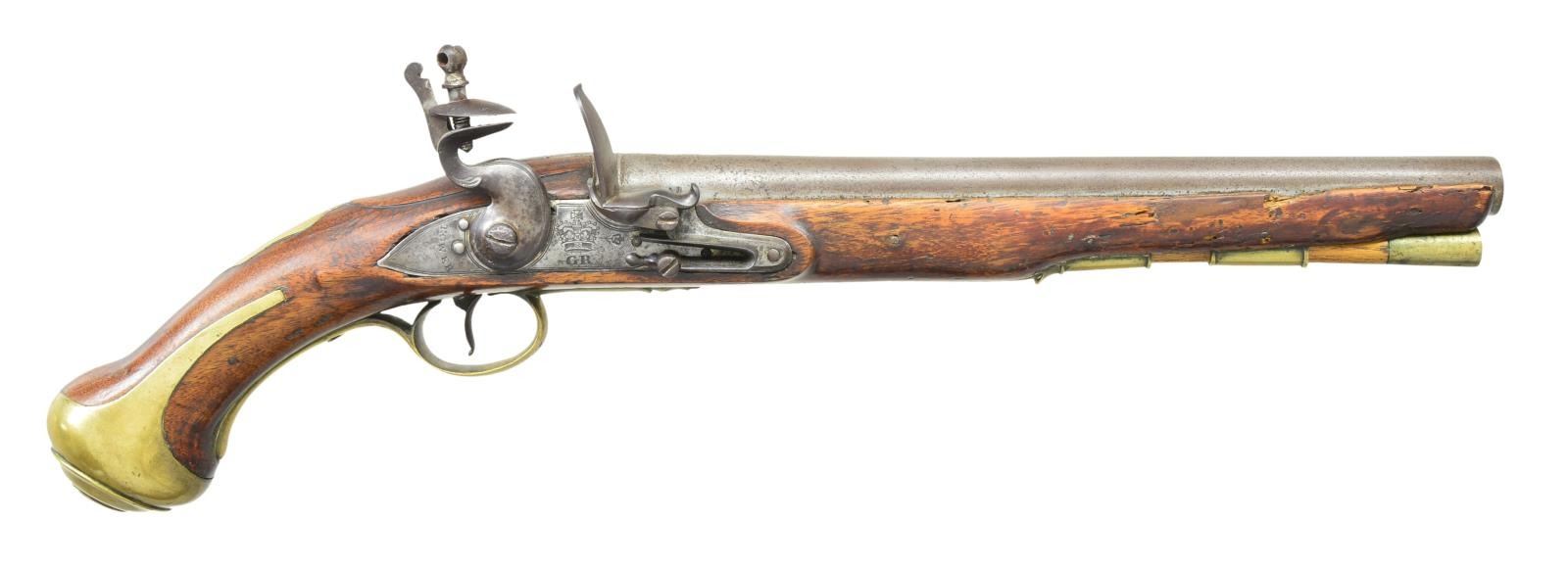 PISTOL. Cal. 62. NSN. Bbl. 11 7/8” w/ faceted transition to top tang. Top of bbl. has three proof marks, left side is stamped “WC”. “TOWER” marked lock has crown over “GR” & broad arrow over hammer. Pin fastened walnut stock. Left ear is stamped “VI”. Brass fittings include trigger guard, butt cap, wrist plate, side plate, thimble & a single faceted pipe. Right side of stock between trigger guard & butt cap extension has two stamped proofs. Inside of lock plate is marked “XXI, J.S. & 91”. CONDITION: metal has faded gray appearance w/ light pitting. Stock shows wear & marks w/ chips along bbl. channel. Right side has epoxy repairs. Lock has stiff spring tension. Lightly pitted bore. (01-23062/DS). ANTIQUE. $1,500-2,200.