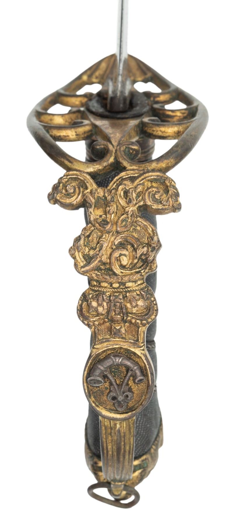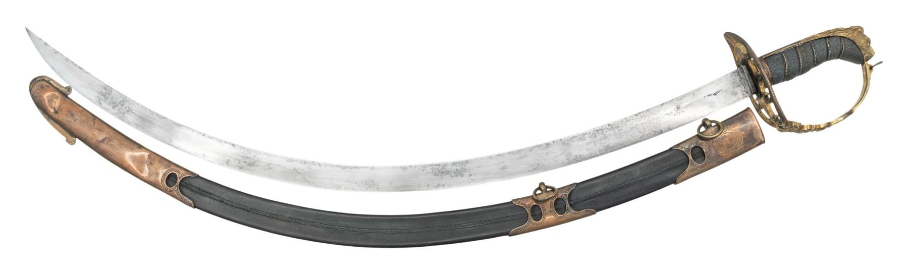 This well made Georgian saber measures 34 1/2" overall with a heavily swept plain 29" blade. Gilded brass hilt with ornate eight hole guard. The knuckle bow features a crown "GR" below a medallion encompassing a silver infantry horn. The top of the knuckle bow is fitted with a lanyard ring below where it enters the mouth of the lion head pommel. The top half of the backstrap forms the lion's mane and the bottom half is five sided. The ferrule has incised lines above and below and the wire wrapped grip is made of fine shark skin. Gilded brass mounted leather scabbard featuring both carrying rings and frog stud at the top of the mount. The throat is marked "Tatham to his Majesty N.37.CHARING CROSS NEAR THE ADMIRALTY". CONDITION: blade has a cleaned, lightly mottled finish. Hilt generally shows light wear with majority of the original gilding remaining. Scabbard mounts retain about 15% of the original gilding. Leather shows expected wear with little or no crazing. PROVENANCE: Estate Collection of Nicholas Apergis. (02-24739/BF). NON-GUN. $1,200-1,800.