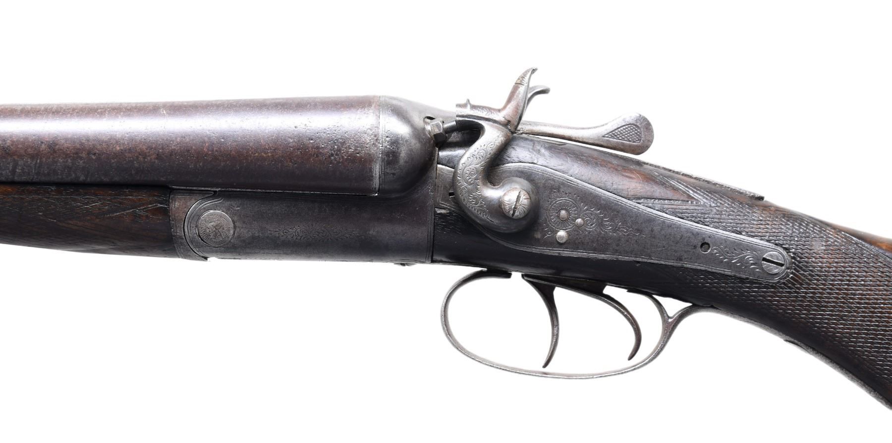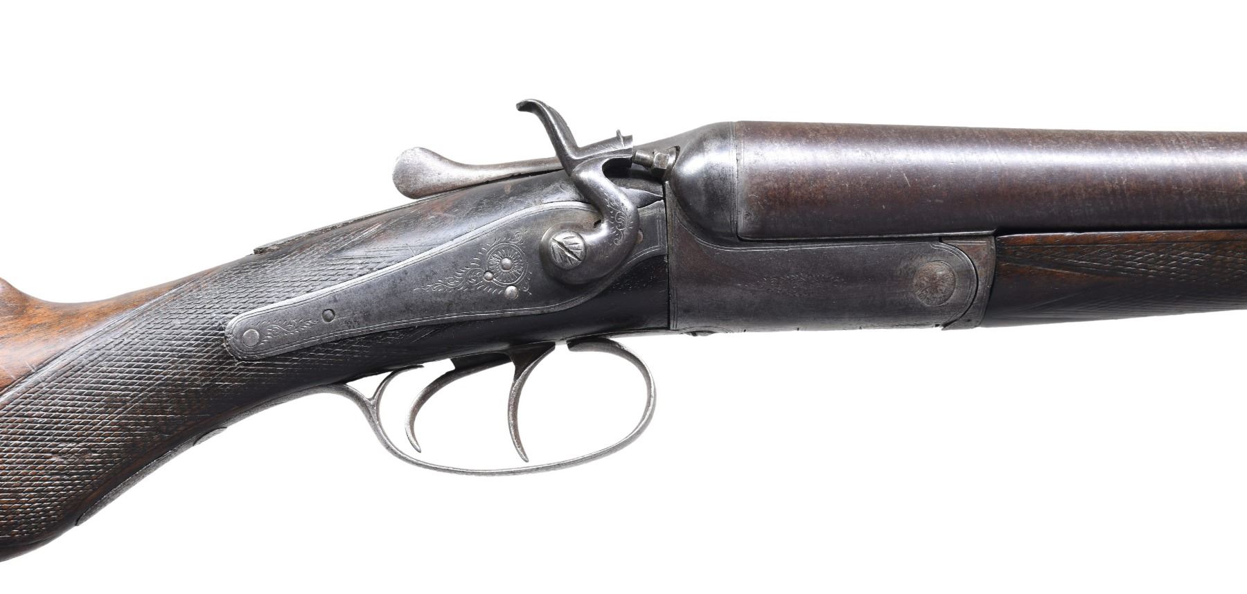 Cal. 12 Ga., 2 1/2". S# 927. The barrels have been cut to 20.25". Water table has Pre-1896 Birmingham proofs. Barrel rib is indiscernible maker's mark. Round body receiver with back action locks, double triggers & extractors. Checkered walnut stock set. Splinter forearm with horn tip. Round knob pistol grip buttstock with German silver toeline name plate & presenation plate on right side of buttstock engraved "Presented to / Joaquin Morales / De Tejas". LOP: 13.5" to horn buttplate. CONDITION: metal has dark gray patina appearance with scattered pinprick pitting & oxidation throughout. Lightly sanded & refinished wood showing numerous handling marks, smoothened checkering & scattered sm. cracks. Fair worn buttplate with worm holes. Pitted bores. Left hammer spur is replacement brazened onto hammer. (01-26990/md). ANTIQUE. $1200-1500.