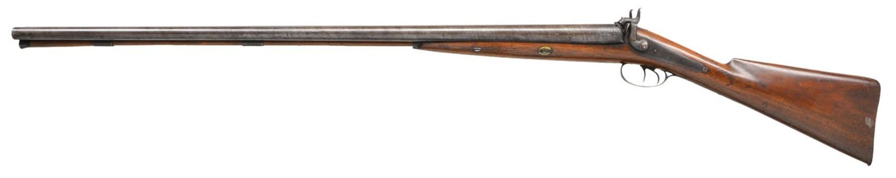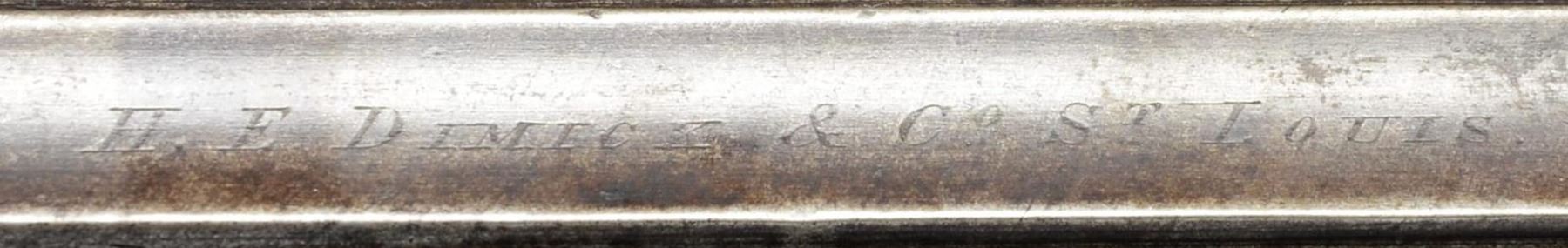 DEMICK & CO OF ST. LOUIS, MISSOURI. Cal. 12 Ga. S# 1563 (underside of barrels). The top rib is engraved "H.E. DEMICK & CO ST LOUIS"; famous gunsmith and retailer in St. Louis, Missouri, from 1849–1879 through the Antebellum and Civil War periods. The twist 36.5" barrels have Birmingham proofs and "W. ELLIS" on the water tables. Island hammer locks with light engraving. Double triggers. Half-length, wedge-fastened walnut stock has an iron buttplate with a long peak tang and German silver wedge escutcheons. CONDITION: barrels show a good twist pattern with brown patina, scattered marks, and pinprick oxidation. Locks and fences show a dark patina with washing out of engraving. Good wood finish with numerous scratches, spots of peeling finish, and small dents. Hardwood ramrod appears to be a tight fit. Dark, lightly pitted bores. (01-24368/MD). ANTIQUE. $800-1,200.