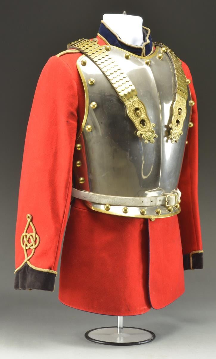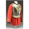 CAVALRY. A very impressive uniform and parade cuirass for a member of the Household Cavalry or King’s Horse. The uniform is red with dark blue piping on the front, tail, and bottom of the uniform. The cuffs and collar are black velvet trimmed in gold rope bullion. There are 4 loops at the left breast to support a medal bar (1 missing). There are 9 buttons baring the British Arms down the front of the coat and 2 at the tail. The lining is cream colored wool with the name “GUNNER TRISTRAM” written in ink in the lower back area. The enlisted grade full parade dress cuirass is highly polished steel with brass stud trim. Both the front and back plates are lined with black wool under leather. The base has a heavy white buff leather securing strap. The over the shoulder strap is made of gilded brass overlapping 4 lobed scales with connecting plates on the ends. These straps are backed with black wool under leather. CONDITION: the coat shows light overall wear with a small repair at the end of where the medal bar would be. The cuirass is exceptionally nice with only a scattered few very minor dents. Connecting straps and securing straps are quite solid. (02-18083/BF). $1,200-1,500.