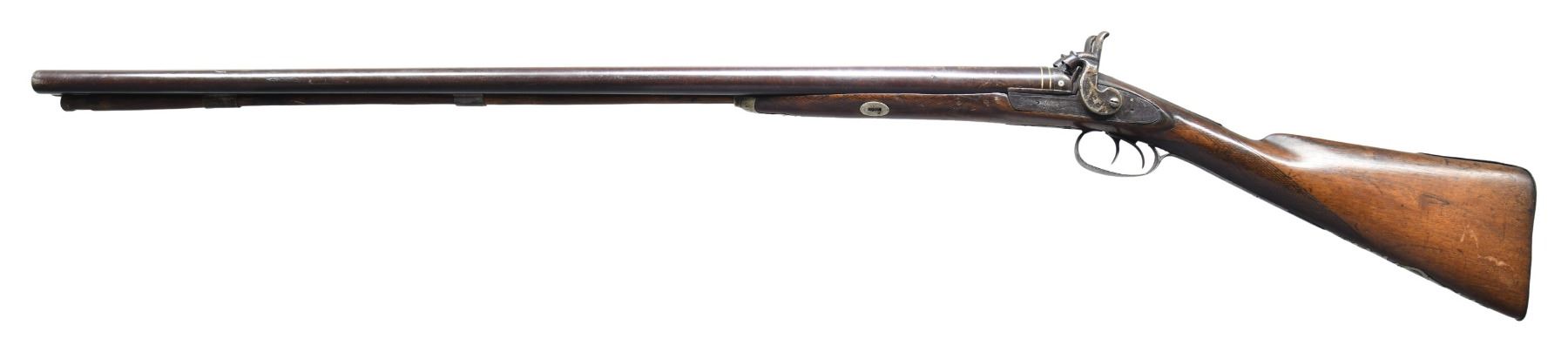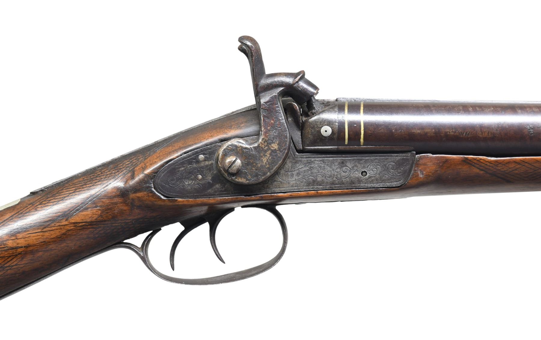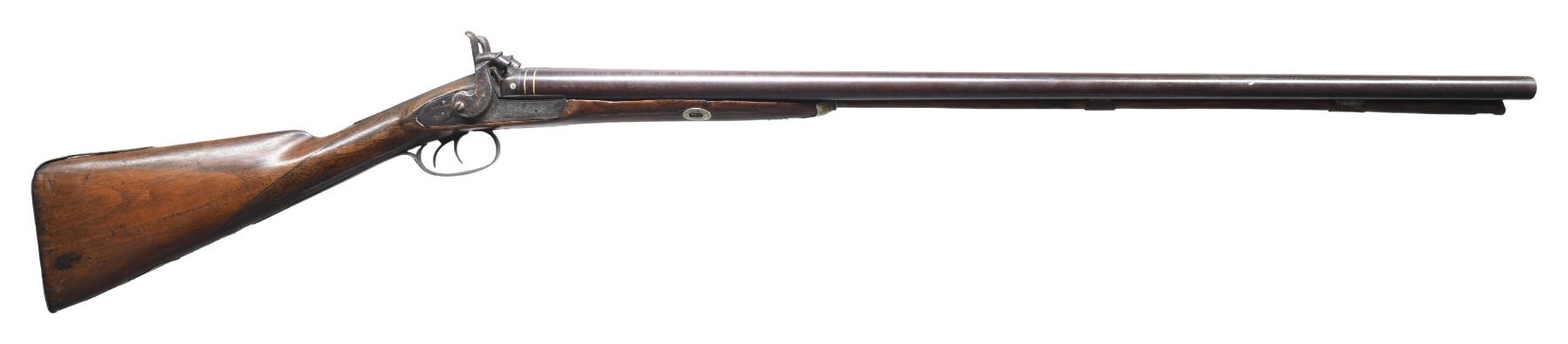 BRITISH VAN WART SON & CO SXS PERCUSSION SHOTGUN. Cal. 12 Ga. NSN. The London Twist Steel 32.5" barrels have bright front bead & bands before breech. Bore chokes measures approx. cyl. Locks have replacement crude hammers. Wedge fastened walnut stock with spear tip finial triggerguard. Hardwood ramrod held by 2 pipes. Added German silver ornamentation throughout. LOP: 13 3/8" to metal buttplate. Replacement wood wedge. CONDITION: metal has dark patina appearance with spots of corrosion & marks. Heavily sanded & refinished wood shows smooth checkering & deep marks. Ill fitting German silver ornamentation shows patina; thimble has portion of finial missing. Pitted bores. Locks appear functional. (01-26991/md). ANTIQUE. $800-1200.