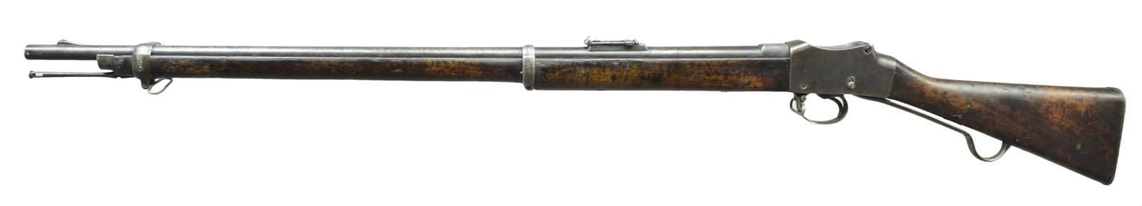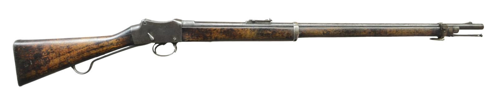 MARTINI HENRY RIFLE. Cal. 577/450. S# 386. Bbl. 33.2" w/ ramp blade front sight & 1200 yd ladder rear sight. "Long lever" Martini Henry Rifle. Rear sight leaf appears numbered "9889" . Bbl. numbered by receiver "812". Bbl. & receiver have various British proofs Walnut stock set. Right side of buttstock has "B107" mark & worn "RP / I arrow C / I". Buttplate marked " IV / 112" w/ other obscured markings. CONDITION: fair metal turned brown patina w/ oxidation. Worn wood finish w/ cracks, chips & gouges. Good bore. (01-21182/MD). ANTIQUE. $300-500.