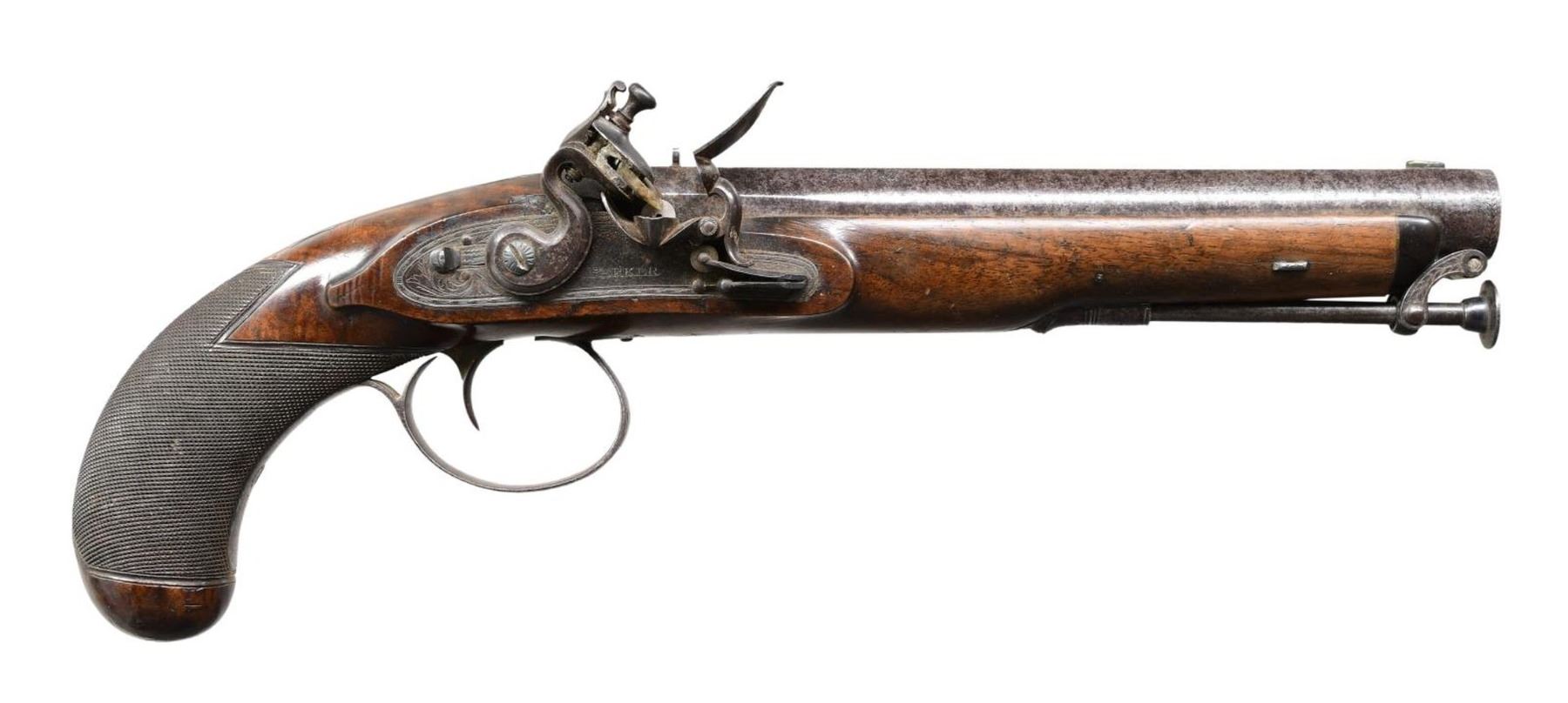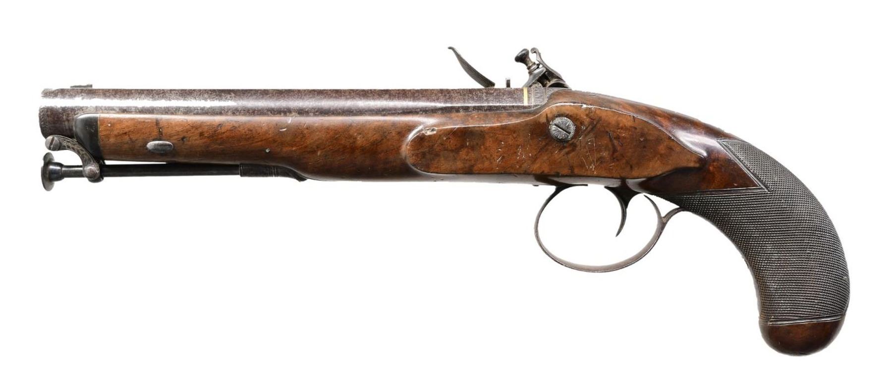 Cal. 68. NSN. Bbl. 9". Blade front sight. Notch rear sight. Lock is marked "W. PARKER". Bbl. marked "W. PARKER, MAKER TO HIS LATE MAJESTY, HOLBORN, LONDON". Gold accent at rear of bbl. Upper tang, trigger guard & lock have floral engraving. Pistol maybe reconverted to flint w/ touch hole appearing newer than balance of metal. Checkered hardwood stock w/ silver shield decoration on top of wrist, button tipped swivel ramrod & silver thimble. CONDITION: stock has older oil finish w/ scattered dings, scratches & handling wear. Metal is mostly a dark gray patina w/ some pitting, scattered oxidation. Lock is functional when hand cycled. Oxidized bore. (01-25266/MJC). ANTIQUE. $1000-1400.