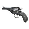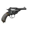 Cal. 45 Auto Rim. Ser. #57908. Numbers match on bbl. & frame. S# on cyl. is rendered obscure. Bbl. 4". Fixed sights. SA/DA. Caliber was .455 Webley MKII. Cyl. has been shortened to permit the use of 45 Auto Rim ammunition. Frame is marked on left side w/ "WEBLEY MARK II" & "PATENTS". Backstrap is marked "N/60". "43" has been lined out. This "N" marking coupled w/ lg. "broad arrow" indicates usage by the Royal Navy. Bbl. is marked on left side of top strap w/ view marks & "broad arrow". "Birds head" type grip. Grip panels are checkered walnut on left side & checkered brown plastic on right. Lanyard stud w/o ring at end of grip. CONDITION: walnut grip has extensive wear, staining & damaged diamonds. Right grip has notably better appearance w/ light wear & scattered handling marks. Metal retains 80% original blue w/ moderate wear & scattered oxidation throughout. Bore is shiny w/ notably worn lands. (22-4355/RW) CURIO. $350-550.