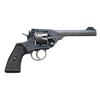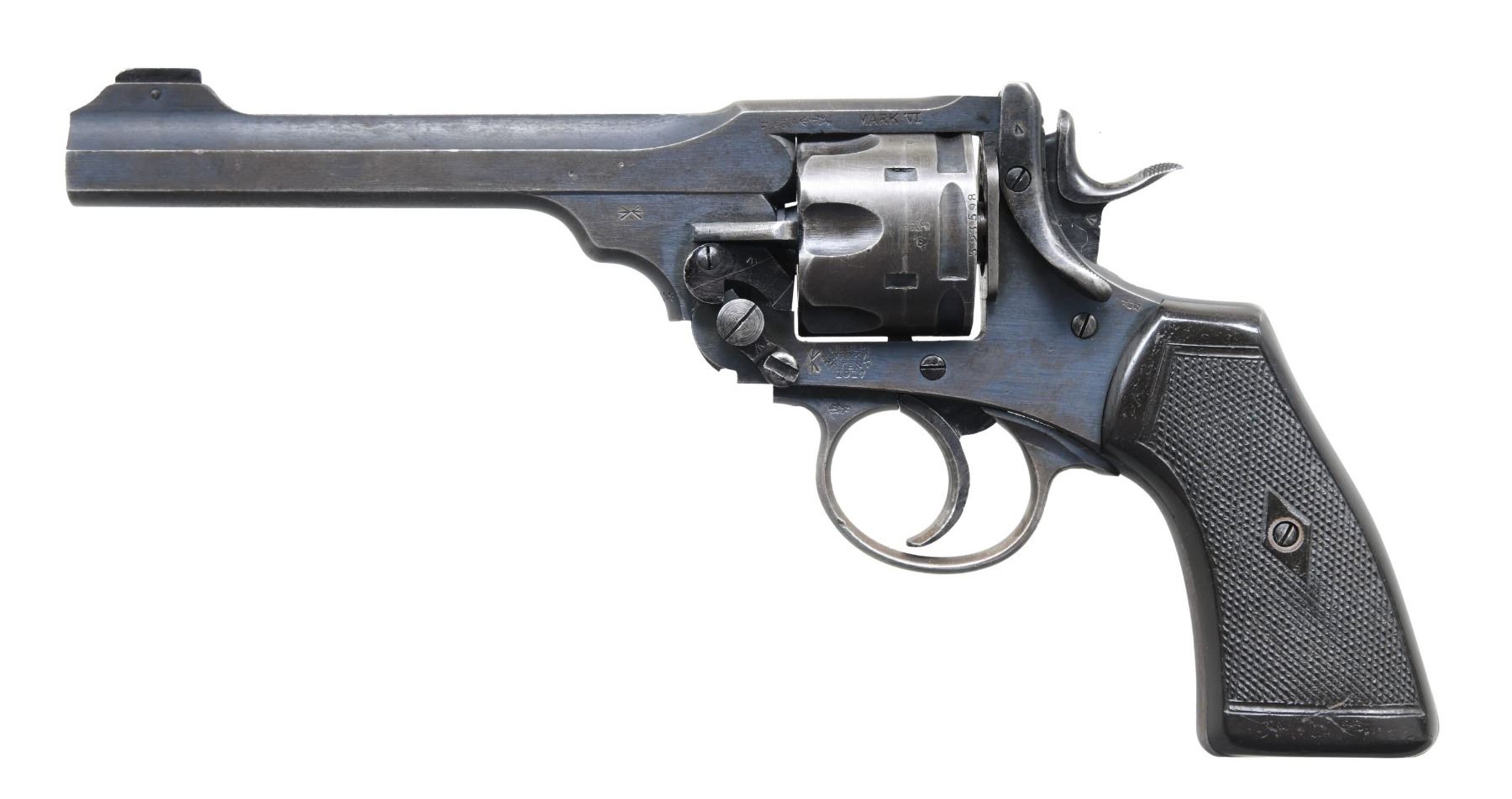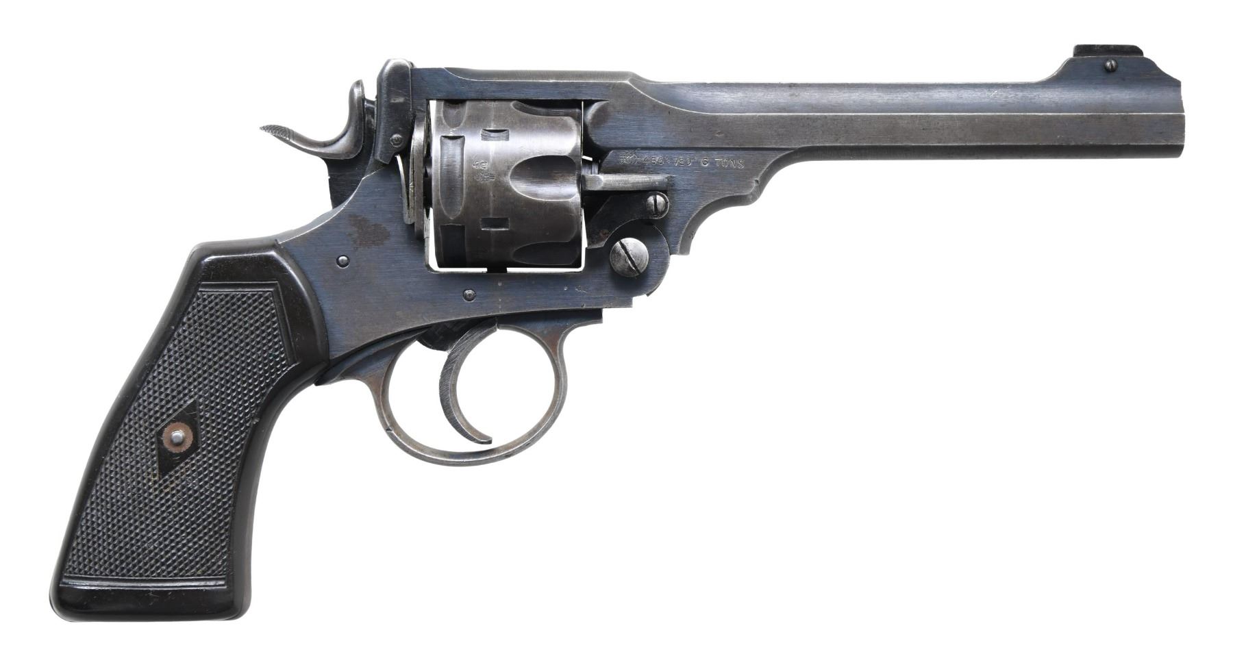 ACTION REVOLVER. Cal. 455. S# 323598. Bbl. 6". Mark VI double action revolver mfg. by Webley in 1917. Left side of the frame is marked "WEBLEY/ MARK VI/ PATENT/ 1917", with "MARK VI" marked on the left side of the top strap. Various British proofs are present overall. Metal components exhibit a blue finish overall. Frame is mounted with 2-piece checkered brown Vulcanite grips. Pinned blade front sight, with U-notch rear sight on bbl. latch. Rear face of cyl. has been shaved to accommodate .45 ACP ammunition in moon clips. Lanyard ring on butt has been ground down. All serialized parts are matching and include the frame, bbl., as well as the cyl. CONDITION: metal components retain the majority of their original factory blue finish, exhibiting areas of wear and thinning that show through to gray patina, some scattered superficial handling marks, as well as some scattered spots of light surface oxidation. Mirror bore, exhibiting some spots of what appears to be light to mild oxidation and pitting towards the muzzle, while retaining well defined rifling throughout. Grips show smoothing, as well as scattered marks from handling and storage, but otherwise remain sturdy and serviceable. (25-2372/MLW). CURIO. $400-800.