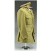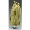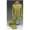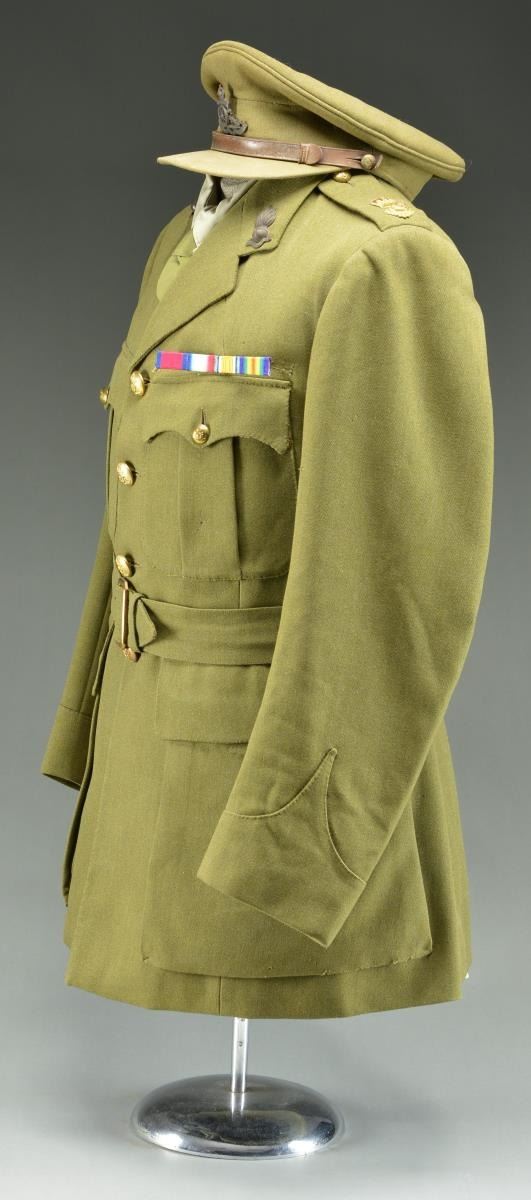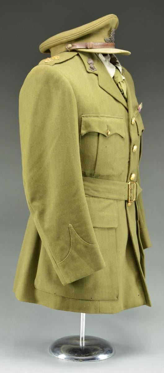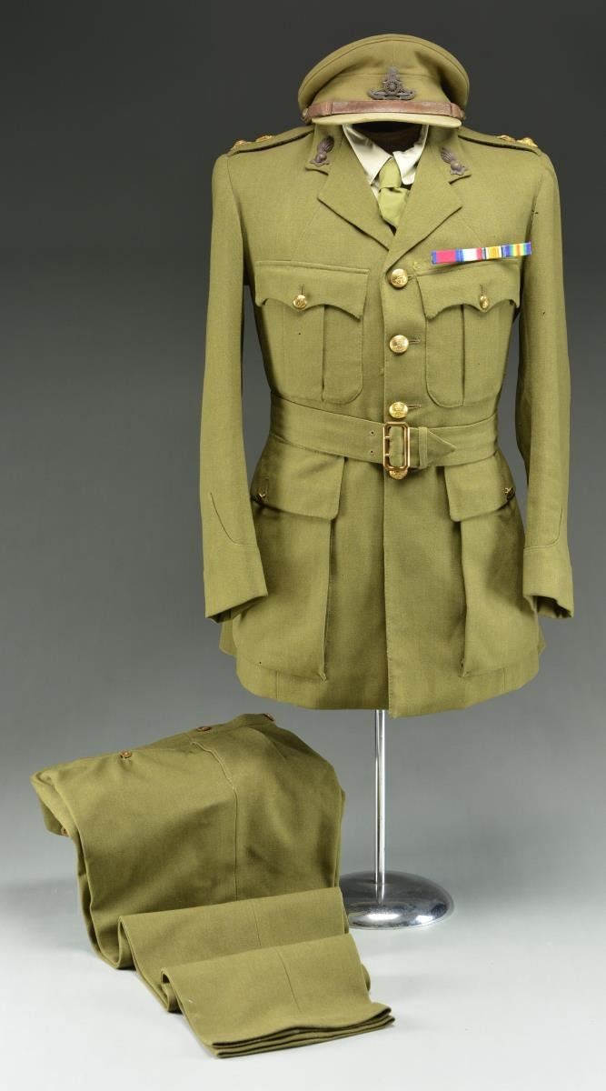 COLONEL. This belted uniform is heavy olive green wool with 4 flap pockets in the front. The front of the coat has 4 large British Artillery buttons. There are smaller artillery buttons on each pocket flap and the shoulder straps. Each shoulder strap bears a crown and single large gold rank pin. The upper lapels have a subdued flaming bomb with a ribbon underneath that reads “UBIQUE”. A khaki shirt and green tie accompany the uniform coat along with its original matching pants and a visor cap with a subdued artillery insignia on the front showing a cannon with “UBIQUE” above and “QUO FAS ET GLORIA DUCUNT”. The uniform has a 4 award ribbon bar likely added for display purposes. Awards include the Distinguished Service Order, 1914-15 Star, WWI War Medal, & WWI Victory Medal. CONDITION: uniform shows minor moth nips scattered throughout. Pants show light wear. Hat shows light to moderate wear. (02-18163/BF). $400-600.