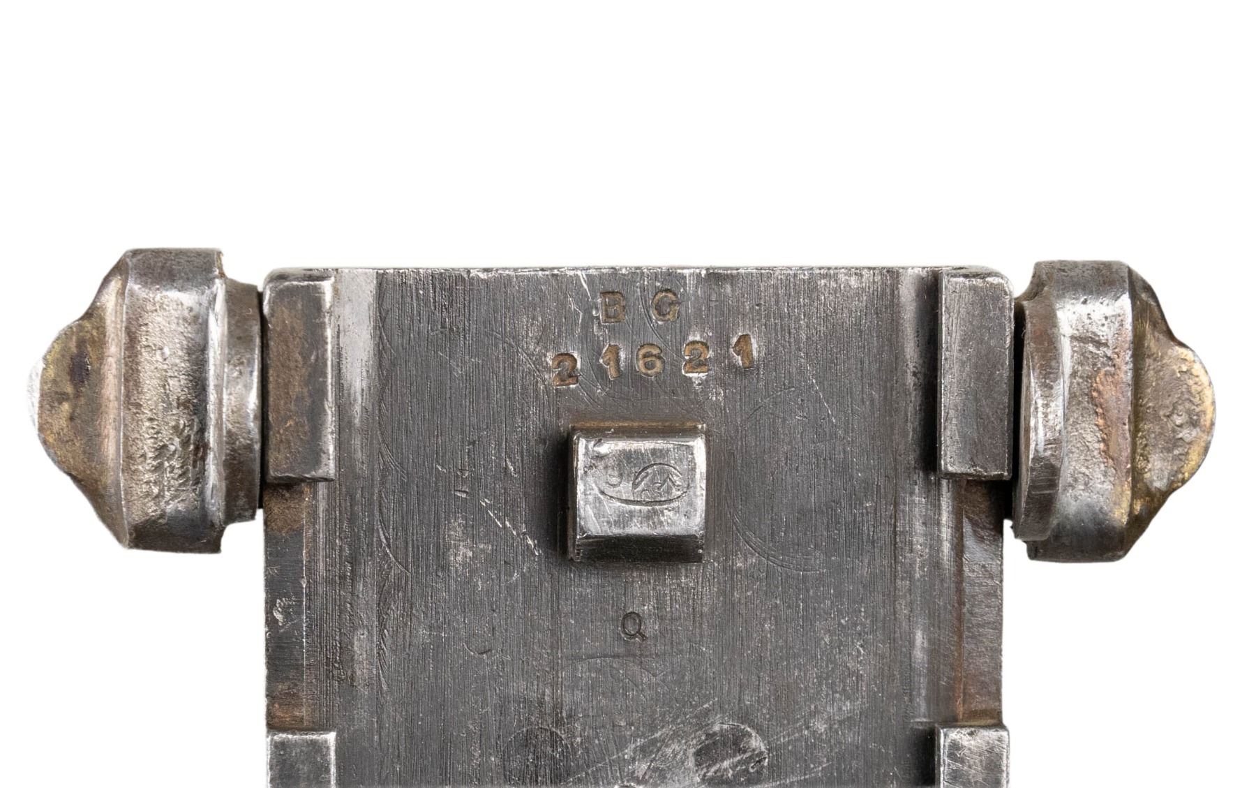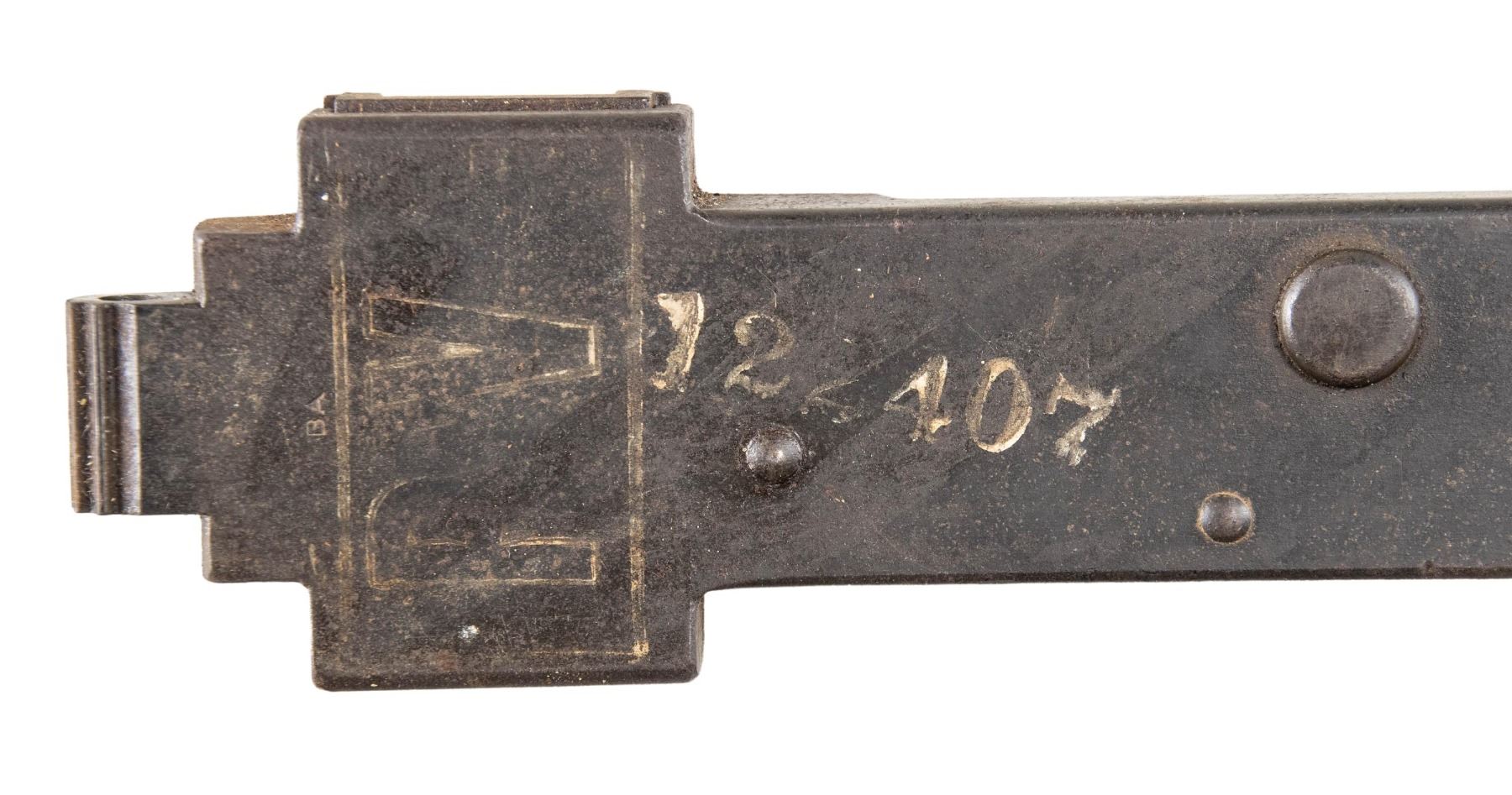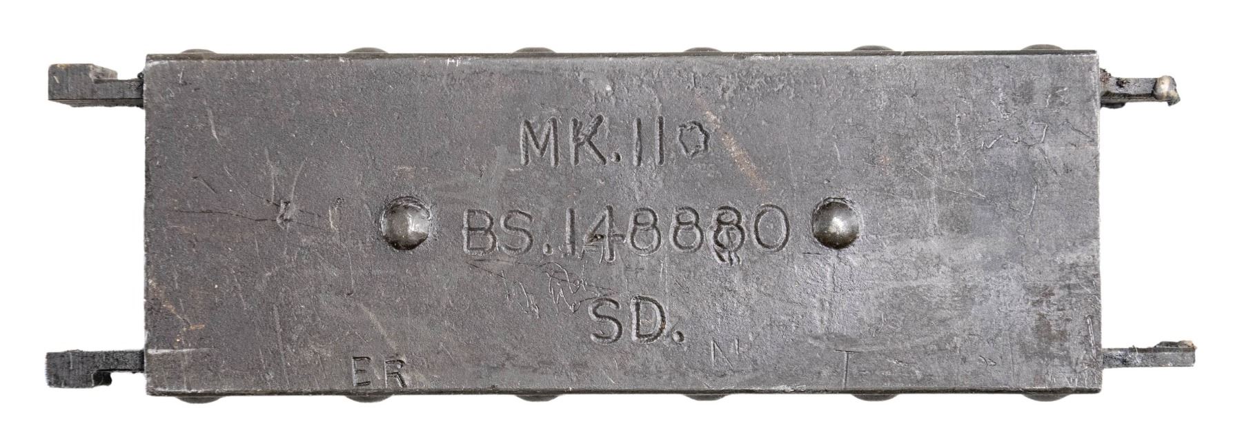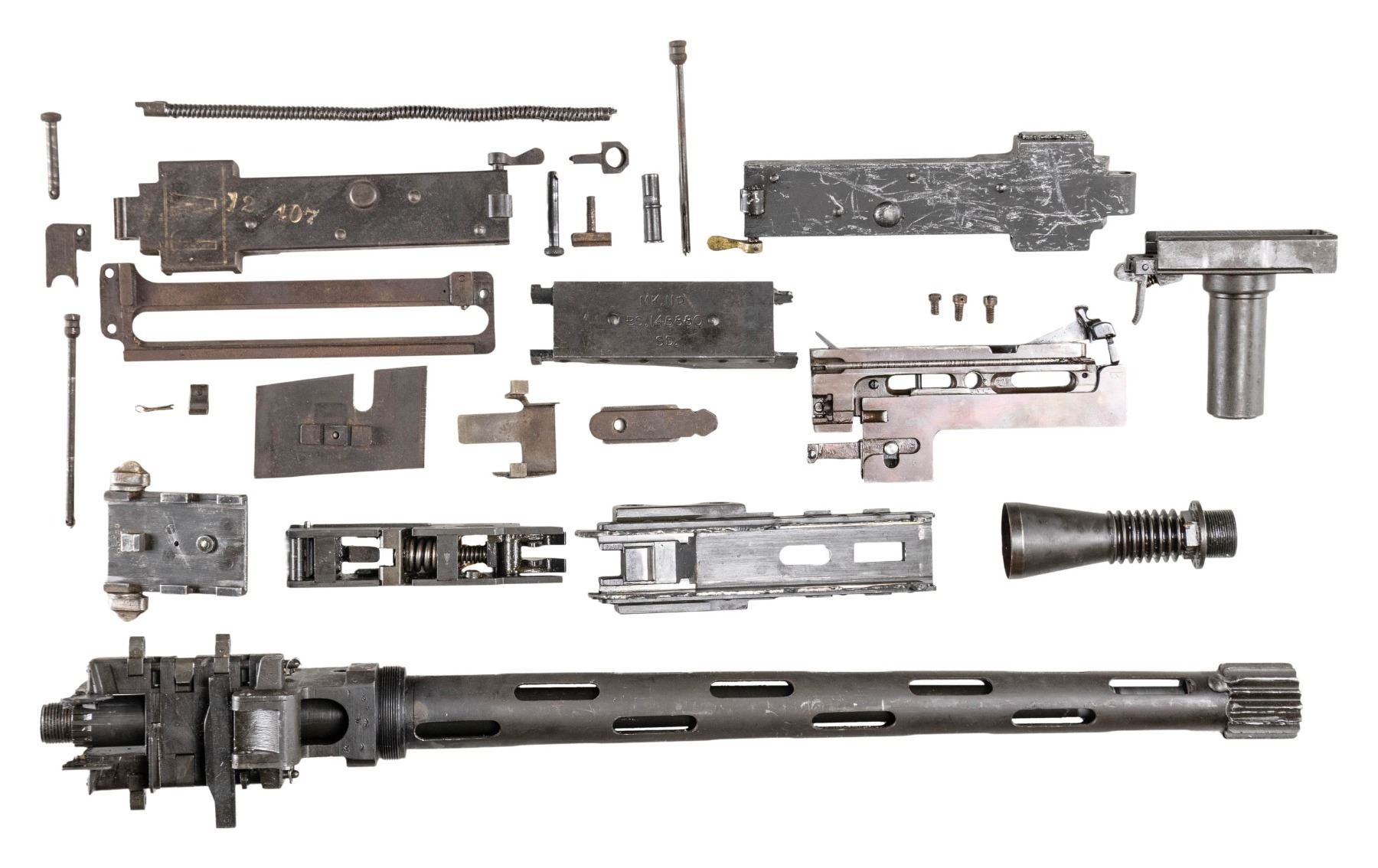 PARTS KIT. British WWII Browning Mk II aircraft machine gun parts kit, consisting of: 1) x1 forward torch cut section of receiver including the bbl. shroud, bbl., as well as the feed tray. 2) x2 receiver covers. 1 receiver cover marked "PV" above "122407" in white ink. 3) x1 complete bolt assembly (including carrier). 4) x1 trigger assembly. 5) x1 receiver backplate. 6) x1 (apparent) rear sear release unit marked "DUNLAP PATENT". 7) x1 Mk II flash hider. 8) x1 retracting sideplate. 9) x3 torch cut sections of receiver. 10) x1 bag of assorted small parts. CONDITION: metal components retain the majority of their arsenal parkerized/phosphate finish, exhibiting varying degrees of superficial handling marks overall. Bore is relatively bright, exhibiting consistent mild to moderate pitting, while retaining good, albeit worn rifling throughout. (02-24592/MLW). NON-GUN. $500-800.