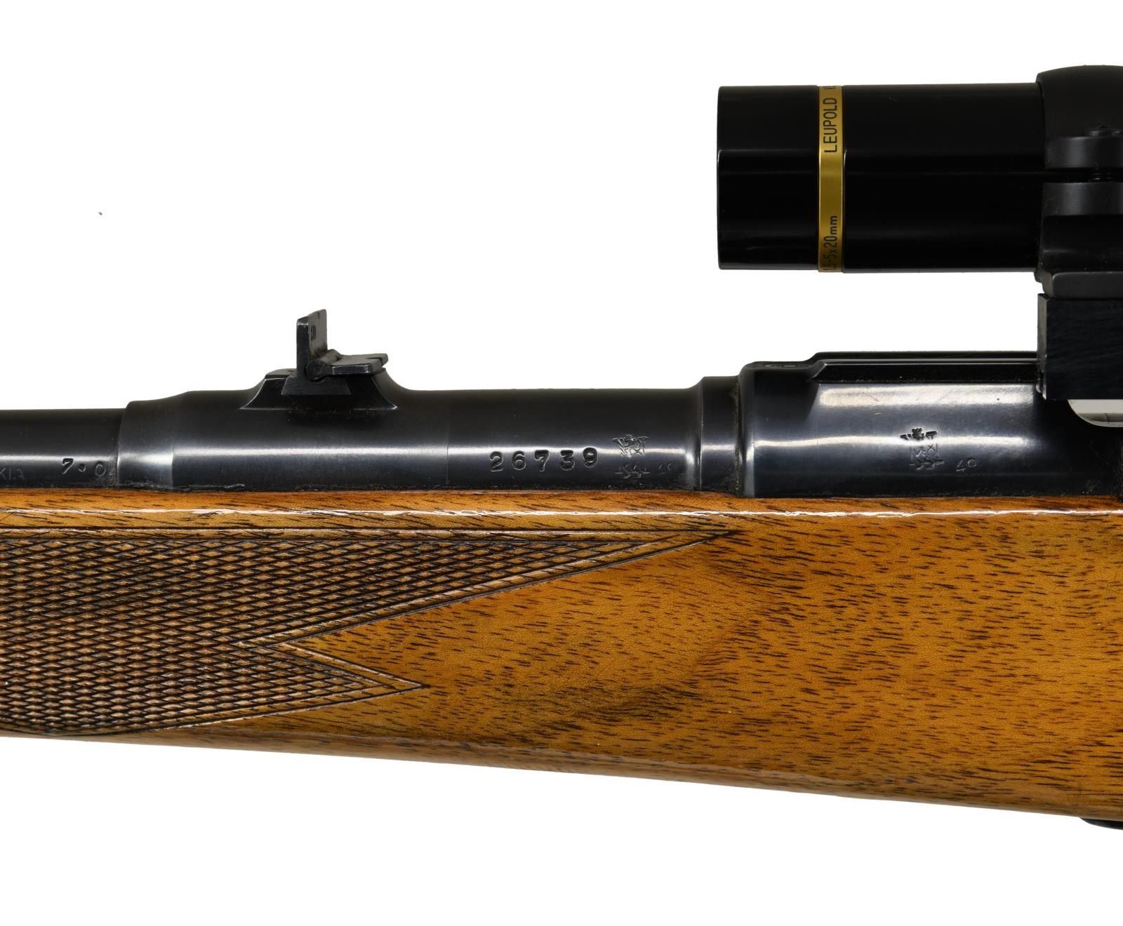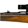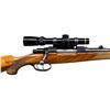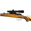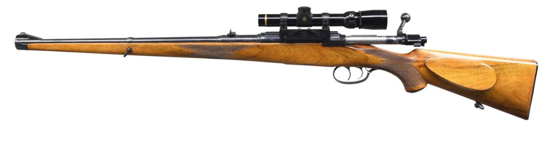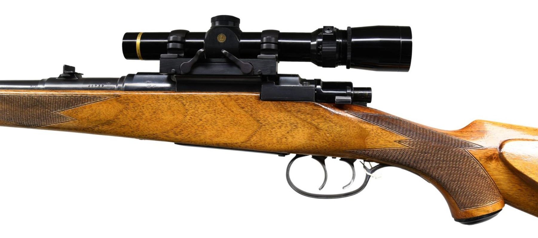 SCOPE. Cal. 7x57. S# 26739. The 20 1/2" light weight barrel has sleeved on rear base holding one standing and one folding leaf rear sight. Front ramp is nicely checkered and holds silver bead. Left side is marked "MADE IN CZECHOSLOVAKIA". Caliber is stamped on top rear, S# and 1949 proofs are on left. Small ring 98 Mauser type action with solid sidewall is of later style with top grooved and reshaped for scope rings. G&H side mount has been fitted. Bolt with engine turned body is sourced from a military rifle; handle has been lowered. Late type BRNO shroud with side safety is installed. Bottom metal is fitted with double set triggers; floorplate is removed with push button. Trigger guard is separate in late style. Full length stock of relatively plain European walnut measures 14-1/2" over checkered plastic buttplate and features right hand cheekpiece, plastic grip cap, steel nose cap and sling loops. Checkering is of point pattern. Rifle is fitted with Leupold VX-III 1.5-5 scope with duplex reticle in G&H mount. CONDITION: good as refinished. Metal parts retaining nearly all of a reblack. Stock with thick oil refinish; checkering lightly worn. Bolt a replacement; with stock grooved for low handle. Bore is bright and shiny. Scope is very fine, optically clear. (23-4646/MGM). CURIO. $1,500-2,000.