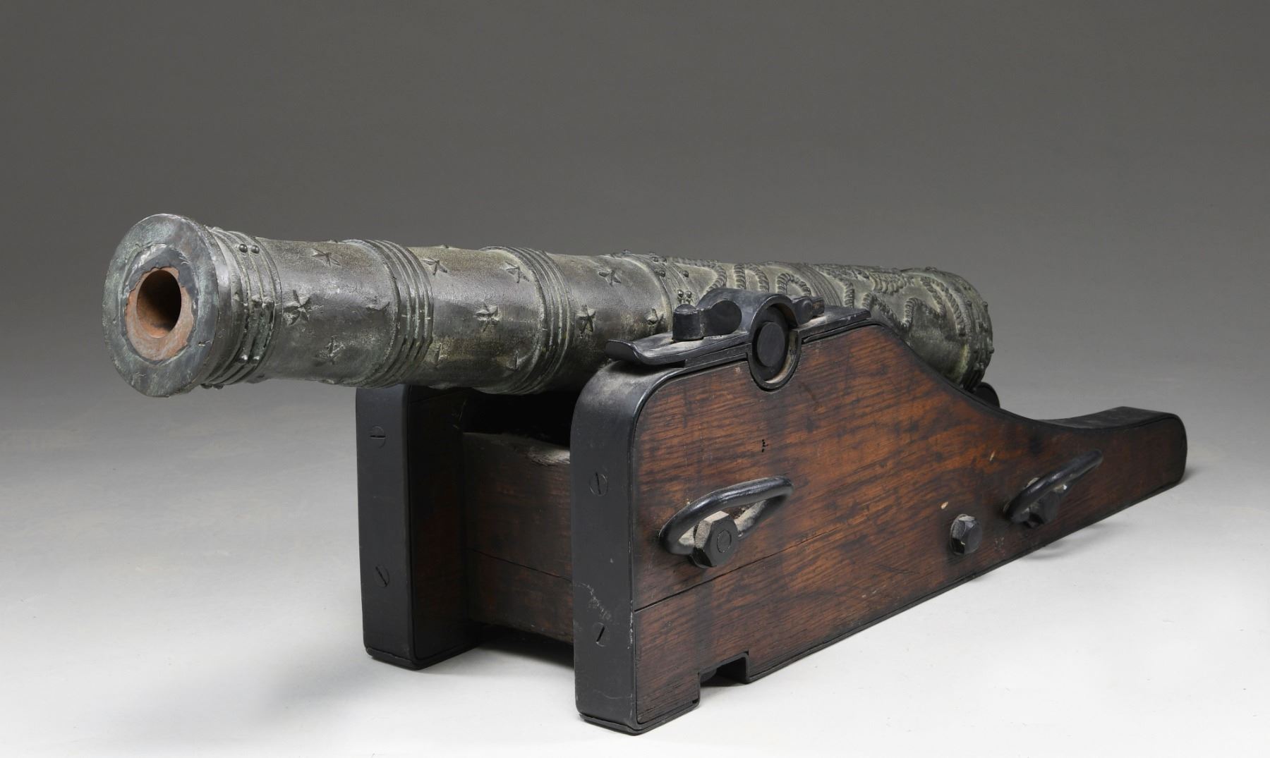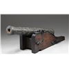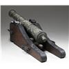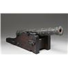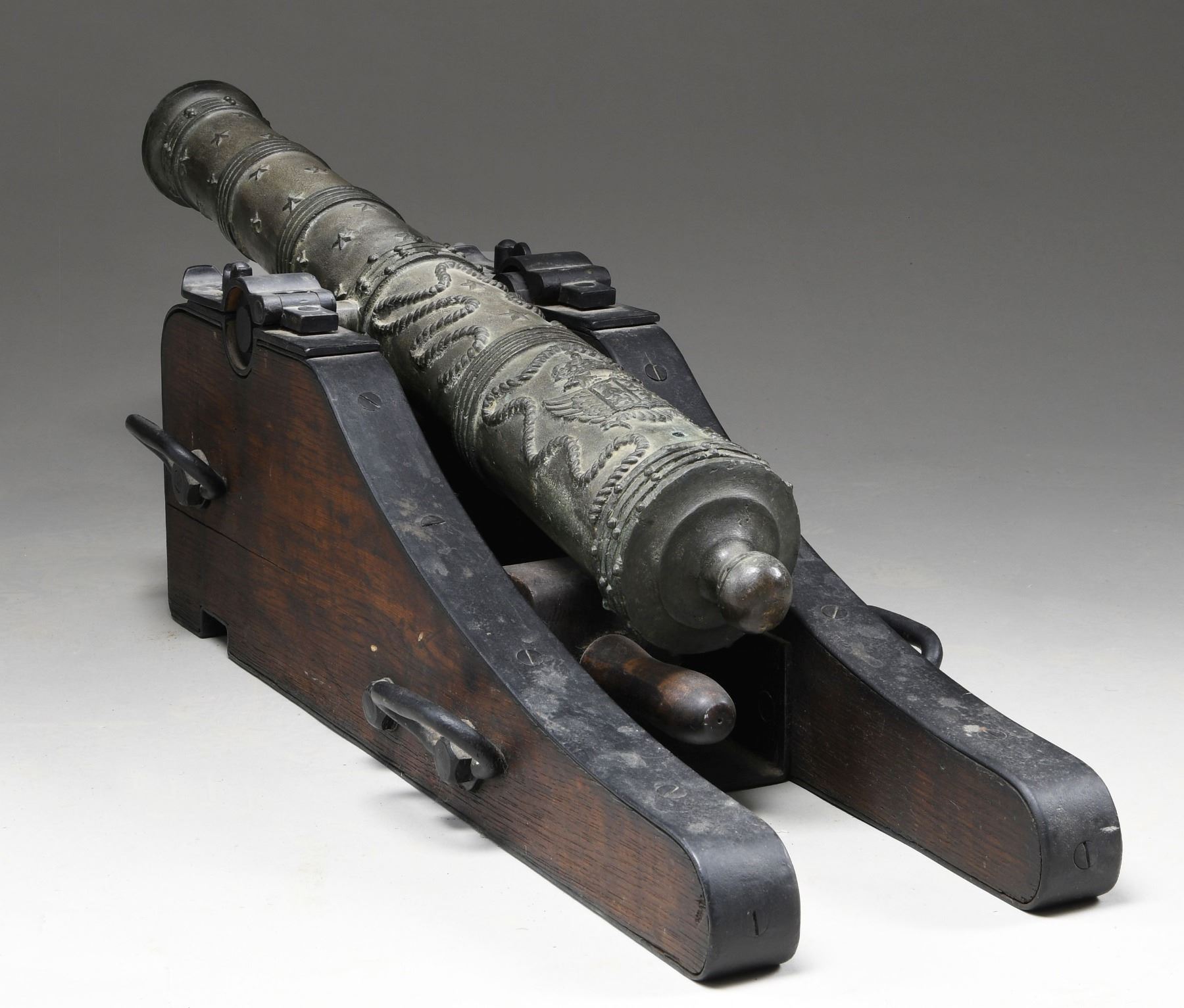 EAGLE. This cannon was likely made in the early 20th century and used as a saluting cannon. It also could have seen use as a decorative accessory to a grand colonial revival era home. The cannon measures approximately 45" in length and 10 1/2" across the trunnions. The bronze barrel has 6 areas of ringed decoration along with several raised stars throughout. The rear half of the cannon shows rope decoration and a prominent Spanish Imperial 2-headed eagle just above the touch hole. The barrel is lined with iron to make the decorative bronze cannon more functional for saluting or firing small balls. The cannon is mounted on a naval carriage featuring iron furniture, bands, and tie-down loops. An exceptionally decorative and visually appealing piece to "defend" an early home or accent a colonial collection. CONDITION: cannon generally shows light wear with a pleasing patina throughout. (02-23524/BF). $1,500-2,500.