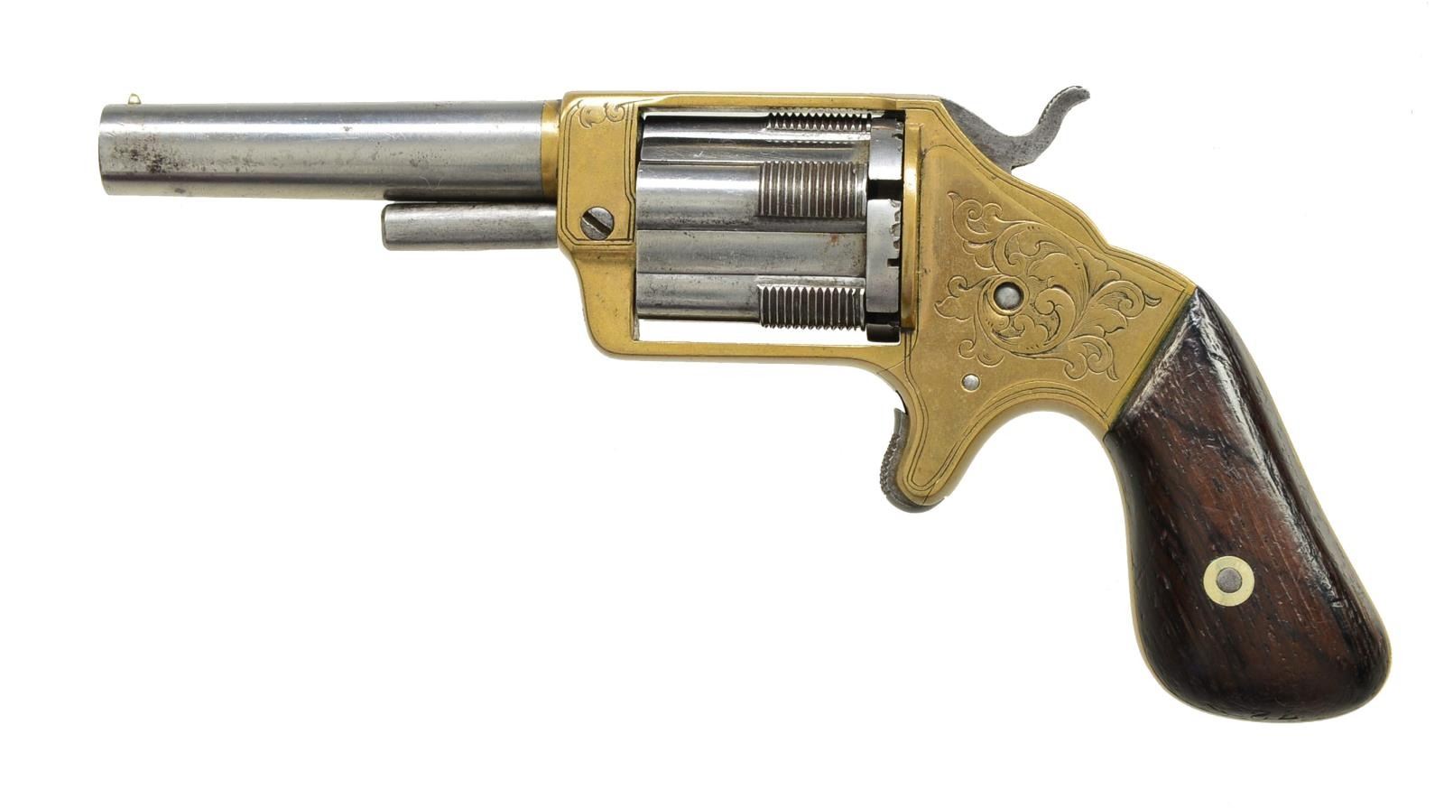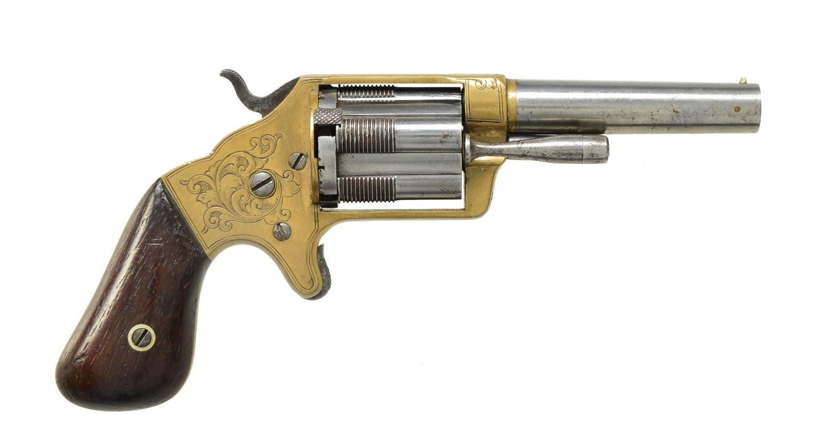 Cal. 32 RF. S# 3818. Bbl. 3" rnd. w/ bead sight. The uniquely designed 5 shot cyl. has sliding tubes that form the individual chambers. Chambers slide forward over a fixed rod to load & eject. Silver finished brass frame w/ spur trigger having tasteful foliate scroll hand engraving. S# 3818 marked inside of frame & grips. 2 Piece rosewood grips. The Slocum was an attempt to circumvent the Rollin White patent owned by Smith & Wesson. Estimated 10,000 mfg. 1863-1864. CONDITION: bbl. & cyl. have cleaned gray appearance. Brass has cleaned appearance w/ no remaining plating. Grips show wear & handling marks. Bore retains good rifling showing spots of pitting. Good mechanics. (01-18045/DS). ANTIQUE. $1,000-1,500.